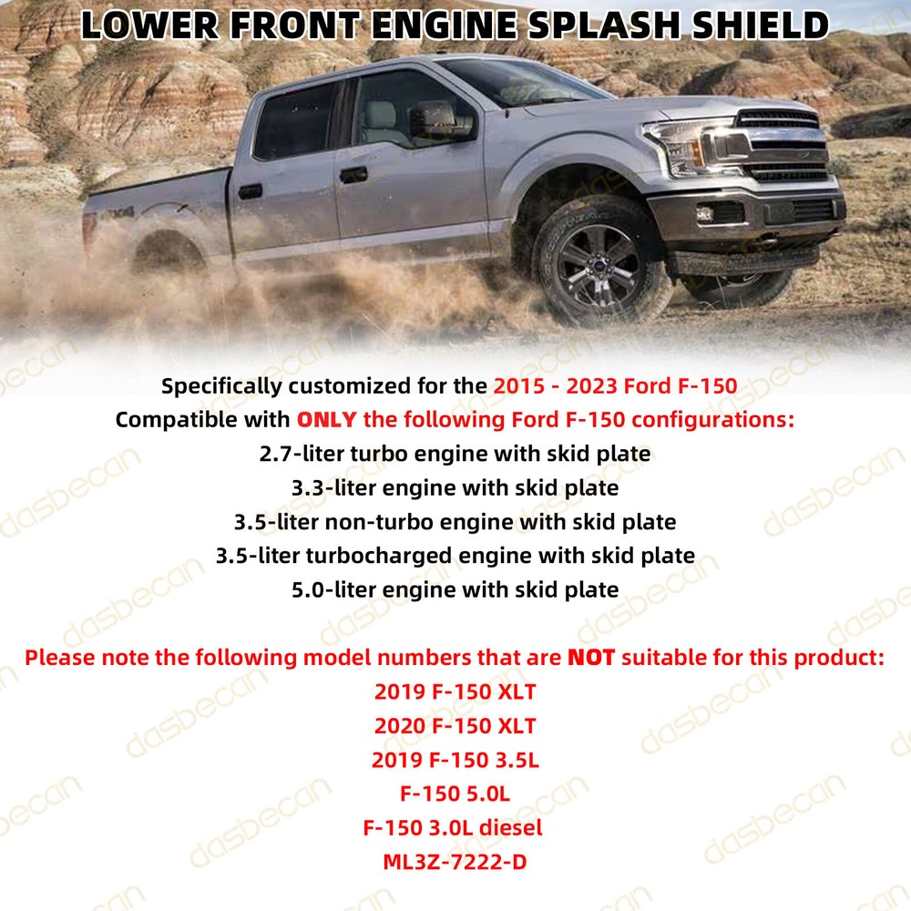 Features & details 【 Replacement & Part Number 】 FL3Z-5D032-D, FL3Z5D032D 【 Compatible With 】 2015-2023 Ford F-150 F150 2.7 LITER TURBO, w/ skid plate 3.3 LITER, w/ skid plate 3.5 LITER W/O TURBO, w / skid plate 3.5 LITER W/TURBO, w/ skid plate 5.0 LITER, w/ skid plate 【ATTENTION】 Please note the following model numbers that are NOT SUITABLE for this product: 2019 F-150 XLT 2020 F-150 XLT 2019 F-150 3.5L F-150 5.0L F-150 3.0L diesel ML3Z-7222-D 【 Features 】 High-Quality - Made of Heavy Duty steel and durable materials, and coated with a rust-proof finish, this splash shield can withstand various harsh environments Easy Installation - This Engine Splash Shield is simple and easy to install, requiring no modification. Design - Its unique design features heat dissipation holes, effectively dissipating the heat generated by the engine to maintain optimal performance. Made of high grade materials. 100% tested before shipment. No need adjustment. 【 Package Includes 】 1* Lower Front Splash Shield 2* Short Bolts 4* Long Bolts 4* Lock Washers 9* Hex Nuts 24 * Flat Washers Notes: - Fitment above is for reference only, please check the OE number, models and years before you purchase. - Installation instruction is not included, professional installation is highly recommended. 【Service & Warranty】 Purchase from DASBECAN, enjoy 1 year no worries-warranty, whenever you met issue when installing or using, please contact us via eBay Message, and we will reply within 24 hours and help solve the problem. Customer Question & Answers Q1: Will This Part Fit My Vehicle? We list all the compatiblity, if your vehicle does not show up on the compatibility table at the top of our listings, welcome you to contact us for free consulation before purchasing a product. Q2: Does they come with warranty? All of our product comes with 1-year warranty, but some times you need to pay the shipping fee. Q3: How to use it? If you don't know how to install this accessory, welcome to contact us, we will provide you with a video guide. Payment Shipping Warranty & Service Returns/Exchanges Contact us Payment Most of the payment methods are available, such as Paypal, Payoneer, Credit Card. Within 1 day of receiving your payment, we will start processing your order. Shipping All Items Will Be Ship Within 1working Days, and We Will Ship out All Orders As Soon As Possible After Payment Verified, Please Allow up to 1-6 Business Days for Delivery. Why Choose the Us Stock? 1. Us Local Shipping, No Extra Customs Cost. 2. Fast Delivery: 1-6 Working Days Delivery. Warranty & Service All the product in our store come with a 1-year-warranty. If there is a problem with the product you purchased within 1 year, please contact us, we will provide you with after-sale protection. Our job is not complete until each customer is satisfied! Receiving positive feedback is extremely important to us. We give all our buyers positive feedback as soon as payment is received Negative feedback and bad ratings do not solve the problem! If you contact us via eBay, we will be more than happy to work with you! Returns/Exchanges If you received an incorrect, damaged, defective, or item not as described , contact us for a partial/full refund or replacement on our costs. If we shipped you the wrong part, we pay for the return shipment and send you the correct part. If you ordered the wrong part, contact us for a return address and simply return it,give us a tracking number. We will send you the new item as soon as the returned package is received; If you simply don't want the part, ship it back and give us a tracking number. After we receive the item, we will refund the item price minus shipping costs. All returns must be done within 30 days after receiving the package. Parts must be new and unused in the original condition: including box, packaging and all other accessories,or we will charge you a partial costs. Contact us If you encounter any problems during purchase or use, please contact us via eBay message directly. On Feb 8, 2025 at 03:53:29 PST, seller added the following information: