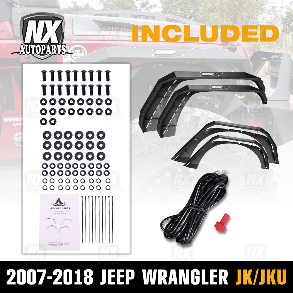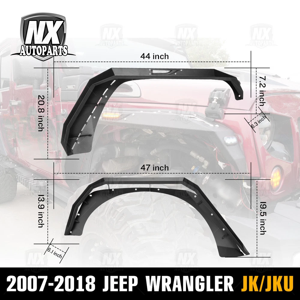 Home Payment Shipping Return Policy About Us Contact Us Feedback Title Other Car Refrigerator Front Bumper Rear Bumper Fender Flares Inner Fenders Side Steps Running Board A-Pillar Light Mount Brackets Headlights For Ford For Dodge For Chevrolet For Toyota For Mitsubishi Taillights For Chevrolet For Toyota For Ford For Jeep For Dodge For Honda For Nissan For Cadillac Fog Lights For Jeep For Dodge For Chrysler For Ford For Toyota For Chevrolet For Nissan For Lexus For GMC For Cadillac For BMW For Mercedes Benz LED Headlights For Ford For Dodge For Chevrolet For Toyota LED Taillights For Toyota For Chevrolet For Ford For Jeep For GMC For Honda For Cadillac LED Fog Lights For Toyota For Ford For Chevrolet For Mercedes Benz Jeep Headlights Tail Lights Fog Lights Refrigerator Bumper Fender Flares Inner Fenders A Pillar Light Mount Brackets Side Step More Chevrolet Headlights Tail Lights Fog Lights Refrigerator Bumper Ford Headlights Tail Lights Fog Lights Refrigerator Bumper Toyota Headlights Tail Lights Fog Lights Refrigerator Bumper Dodge Headlights Tail Lights Fog Lights Refrigerator Bumper GMC Headlights Tail Lights Fog Lights Refrigerator Bumper Front & Rear Fender Flares for 2007-2018 Jeep Wrangler JK JKU Duty Steel 4PC Set 👉 Front Fenders Only : https://www.ebay.com/itm/402992475982 👉 Rear F enders Only : https://www.ebay.com/itm/402992474264 🔔 Inner F enders : https://www.ebay.com/itm/403027173162 Features Multifunctional design - Equipped with LED sequential turn signal lights and LED side marker lights (LED lights with DOT & SAE compliance for street use). 1 pair of front and rear - a full set of fender flares for your Jeep Wrangler JK . Heavy duty build - Heavy Duty steel construction with black powder coat finish process. Easy installation - package includes installation manual for your reference, direct bolt-on installation. Fitment 2007-2018 Jeep Wrangler JK Specification Material: Black Powder Coated Steel Features: Mounting Hardware Included 1 year manufacturer warranty. 30-Day return policy. Package Include 1* pair of Front Fender Flares 1* pair of Rear Fender Flares 1* set of Mounting Accessories 1* Installation Manual Return Policy Warranty Payment Shipping Feedback Return Policy 60 Day Unconditional Refund Guarantee. If for whatever reason you do not want your item within 60 days of receiving it, you may also contact us for a return and refund. Warranty Your nx_autoparts body part is covered with a 1 year defect warranty (unless stated otherwise). What is Not Covered? nx_autoparts Limited Warranty does not cover damage or claims to any component, vehicle or person other than the nx_autoparts body parts purchased. nx_autoparts determines to have been damaged by or subjected to: • Inadequate mounting or installation, alteration, modification, or failure to maintain. * Professional installation is highly recommended. • Damage in any part attributable to: (a.) vehicle systems or components (including electronic stability control) or (b.) combination with non-nx_autoparts products. • Normal wear and tear/product deterioration. • Scratches or defects in product finishes or damage due to shipping. *We recommend buyer to inspect parts in detail before receiving goods. • Accidents, impact by rocks, trees, obstacles or other aspects of the use environment. • Theft, vandalism or other negligent or intentional damage if any. Any questions, please contact us first. Payment We accept PayPal, credit card, Apple Pay & Google Pay etc. Shipping We normally despatch your order within 1-3 working days upon cleared payment. Please double confirm your address and ensure that it’s available to receive your package. We do not offer local pick up service. Feedback We value positive feedback. If you have any problem with your order, please feel free to contact us first . On Apr-19-22 at 03:32:45 PDT, seller added the following information: Payment Delivery details Terms of sales About us Contact us Payment We accept PayPal, credit card , Apple Pay & Google Pay etc. Delivery details All items will be shipped within 1-3 business days after payment received, we will try our best to ship out as soon as we can, hope for your understanding. Please double confirm your address and contact information, which will help the delivery faster and more accurately. Note :buyers who purchase international products need to pay import tariffs!!! Terms of sales Professional installation is highly recommended. Any problem of the item please feel free to contact us first , please D o Not leave negative feedback before that, or simply return it within 60 Days in original condition. We will resolve it for you ASAP. About us Any questions please do not hesitate to contact us directly by eBay message . We will reply you within 24 hours asap, thanks for your understanding. Contact us Should you have any problem or require any further information please feel free to contact us . If you are satisfied with our product and service, please kindly leave us a positive feedback.
