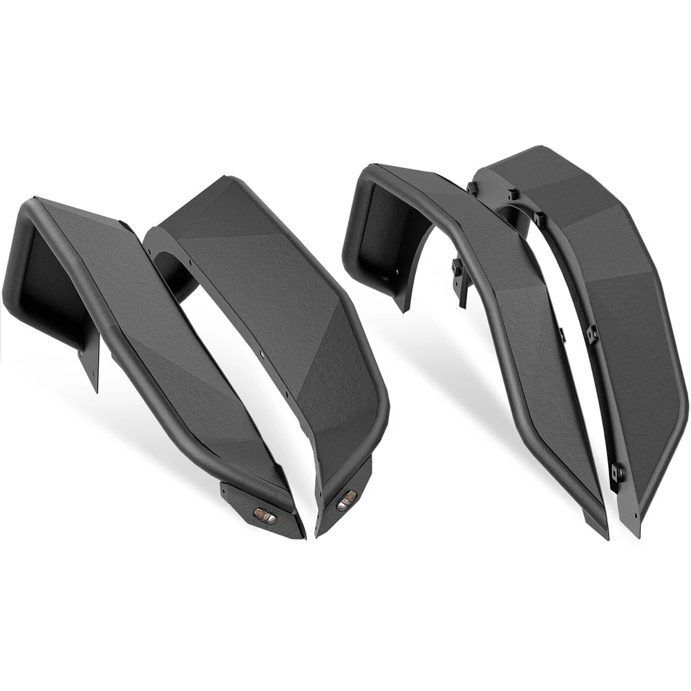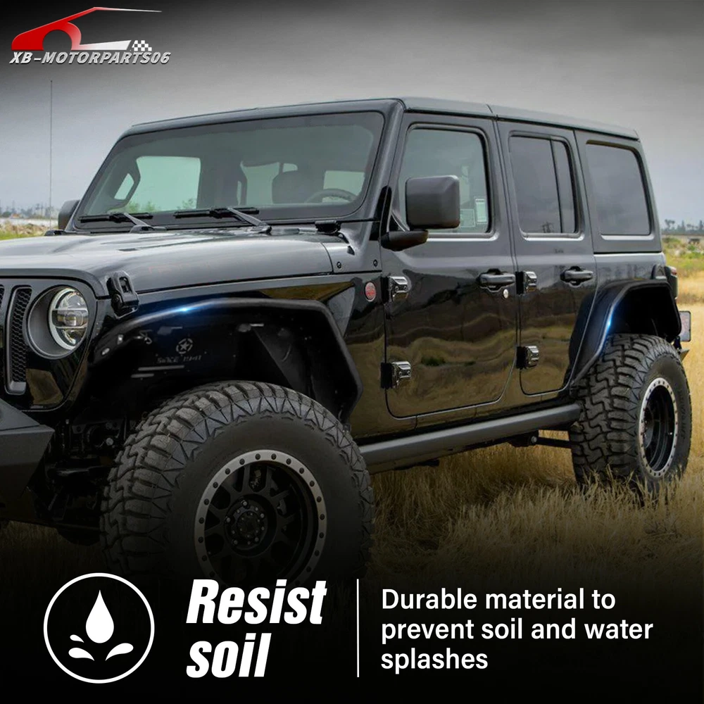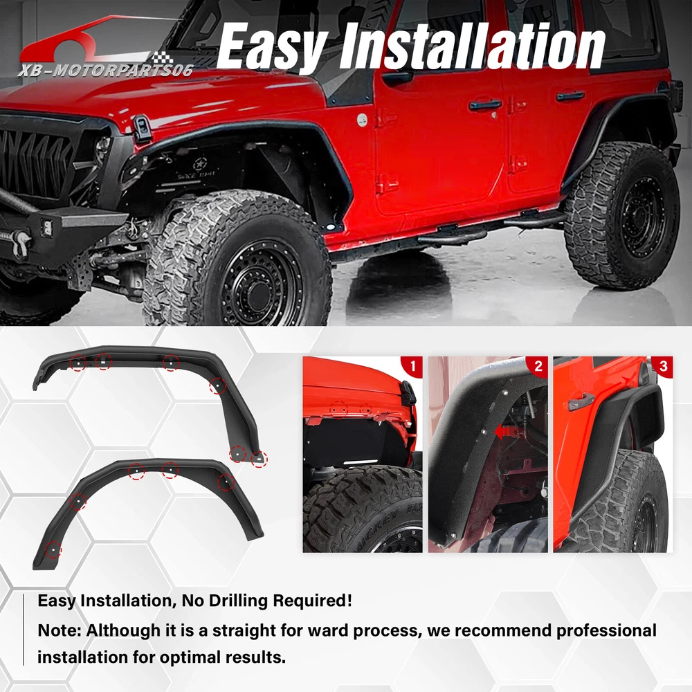 Front & Rear Fender Flares For 2018-2025 Jeep Wrangler JL W/ Turn Signal Lights Suitable Models : Compatible with 2018-2025 Jeep Wrangler JL JLU Unlimited 2/4 Doors Package Includes : 2 front fender flares, 2 rear fender flares, installation instructions, and screw fittings Product Information : Product Dimensions : Please see the size picture Package Dimensions : 47.83 x 28.35 x 10.63 inches Installation mode : Bolt-on Exterior Finish : Stainless Steel Placement on Vehicle : Left and Right Item Weight : 66 pounds Material : Carbon Steel Color : Black (hand measurements may have an error of 2-3 mm/0.078-0.118 in) Feature : ① Our tubular fender flares are made from sturdy stainless steel and feature a tough black powder coating. They offer dependable protection for your wheel wells, guarding against mud, scratches, sand, and other external damages; ② Easy bolt-on installation with some wiring needed. Factory fender flares and inner fender liners must be removed. A rivet nut tool is included for installing rivet nuts into the mounting holes; ③Easy to install, no drilling required. Warranty Period : 1 year Standard Shipping (FedEx Ground or FedEx Home Delivery) Will usually ship within 3 business days of receiving cleared payment Suitable Models : Compatible with 2018-2025 Jeep Wrangler JL JLU Unlimited 2/4 Doors Package Includes : 2 front fender flares, 2 rear fender flares, installation instructions, and screw fittings Product Information : Product Dimensions : Please see the size picture Package Dimensions : 47.83 x 28.35 x 10.63 inches Installation mode : Bolt-on Exterior Finish : Stainless Steel Placement on Vehicle : Left and Right Item Weight : 66 pounds Material : Carbon Steel Color : Black (hand measurements may have an error of 2-3 mm/0.078-0.118 in) Feature : ① Our tubular fender flares are made from sturdy stainless steel and feature a tough black powder coating. They offer dependable protection for your wheel wells, guarding against mud, scratches, sand, and other external damages; ② Easy bolt-on installation with some wiring needed. Factory fender flares and inner fender liners must be removed. A rivet nut tool is included for installing rivet nuts into the mounting holes; ③Easy to install, no drilling required. Warranty Period : 1 year