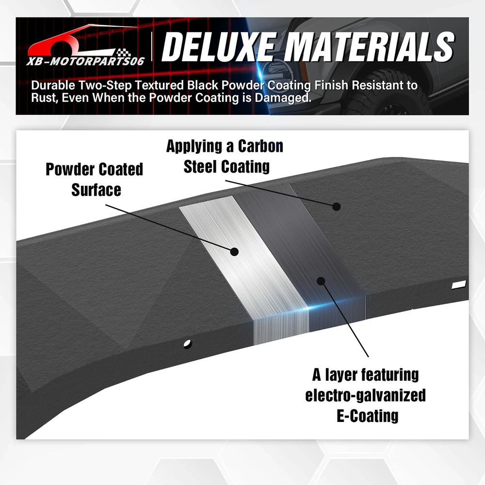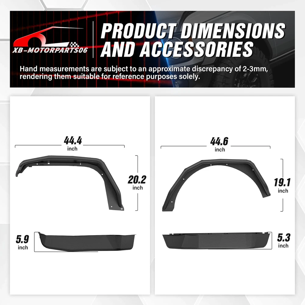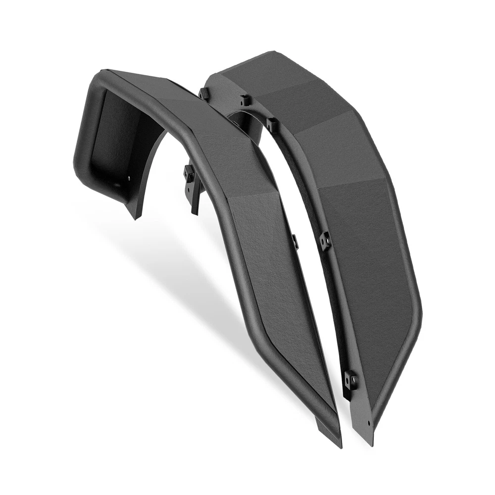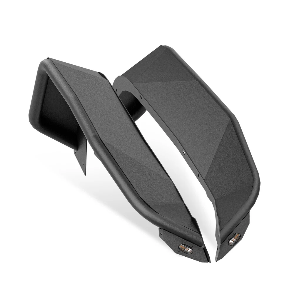 Front & Rear Fender Flares For 2018-2025 Jeep Wrangler JL W/ Turn Signal Lights Suitable Models : Compatible with 2018-2025 Jeep Wrangler JL JLU Unlimited 2/4 Doors Package Includes : 2 front fender flares, 2 rear fender flares, installation instructions, and screw fittings Product Information : Product Dimensions : Please see the size picture Package Dimensions : 47.83 x 28.35 x 10.63 inches Installation mode : Bolt-on Exterior Finish : Stainless Steel Placement on Vehicle : Left and Right Item Weight : 66 pounds Material : Carbon Steel Color : Black (hand measurements may have an error of 2-3 mm/0.078-0.118 in) Feature : ① Our tubular fender flares are made from sturdy stainless steel and feature a tough black powder coating. They offer dependable protection for your wheel wells, guarding against mud, scratches, sand, and other external damages; ② Easy bolt-on installation with some wiring needed. Factory fender flares and inner fender liners must be removed. A rivet nut tool is included for installing rivet nuts into the mounting holes; ③Easy to install, no drilling required. Warranty Period : 1 year Standard Shipping (FedEx Ground or FedEx Home Delivery) Will usually ship within 3 business days of receiving cleared payment Suitable Models : Compatible with 2018-2025 Jeep Wrangler JL JLU Unlimited 2/4 Doors Package Includes : 2 front fender flares, 2 rear fender flares, installation instructions, and screw fittings Product Information : Product Dimensions : Please see the size picture Package Dimensions : 47.83 x 28.35 x 10.63 inches Installation mode : Bolt-on Exterior Finish : Stainless Steel Placement on Vehicle : Left and Right Item Weight : 66 pounds Material : Carbon Steel Color : Black (hand measurements may have an error of 2-3 mm/0.078-0.118 in) Feature : ① Our tubular fender flares are made from sturdy stainless steel and feature a tough black powder coating. They offer dependable protection for your wheel wells, guarding against mud, scratches, sand, and other external damages; ② Easy bolt-on installation with some wiring needed. Factory fender flares and inner fender liners must be removed. A rivet nut tool is included for installing rivet nuts into the mounting holes; ③Easy to install, no drilling required. Warranty Period : 1 year