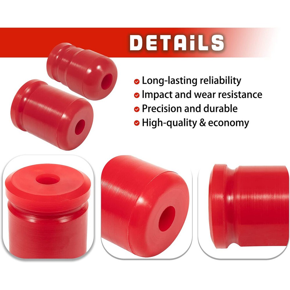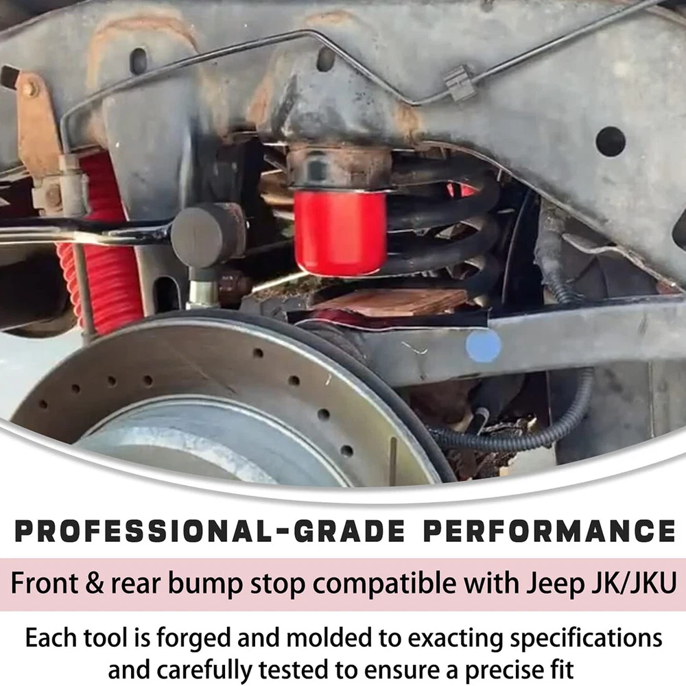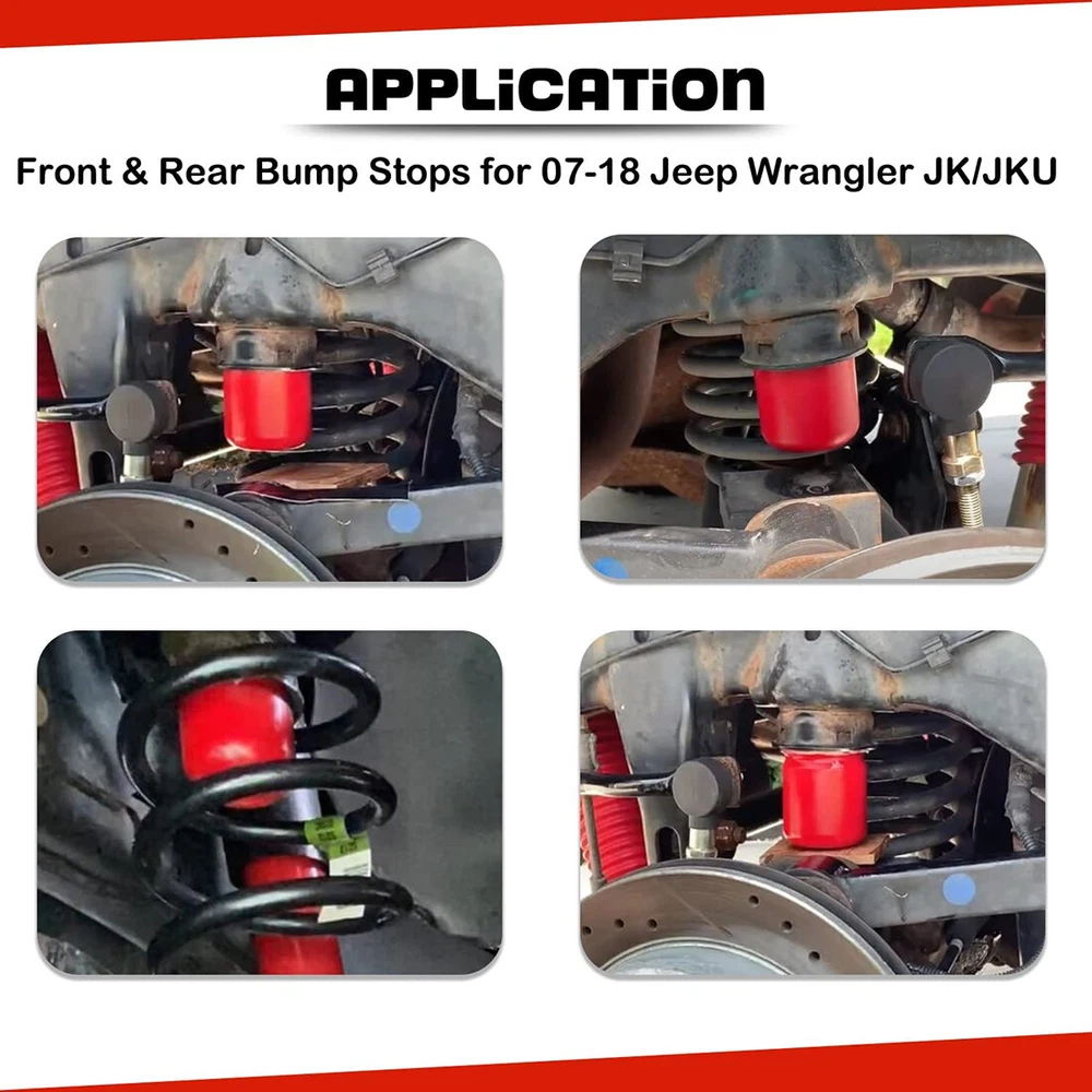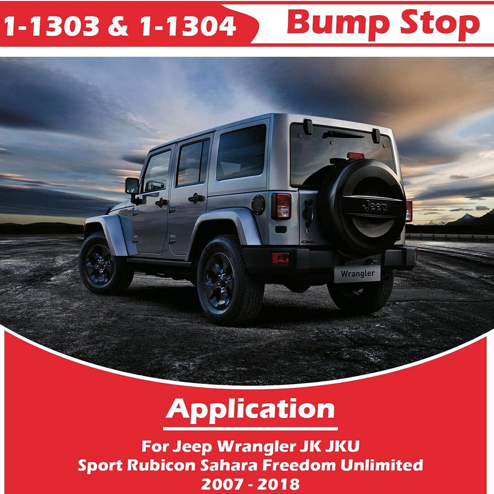 Front & Rear Polyurethane Bump Stop for 2007-2018 Jeep Wrangler JK 1-1303 1-1304 Fitment: Used for 2007-2018 Jeep Wrangler JK JKU Sport Rubicon Sahara Freedom Unlimited Features: 1) All bump stops are designed to protect your suspension from serious impacts. Add the energy-absorbing capabilities of polyurethane to the unique progressive cavity molded into the stops and you have a progressive compressibility bump stops 2) Replacing a worn Bump Stop will help provide maximum handling, giving you better handling than regular rubber units and extending the life of your vehicle. At the same time, it will not make your car run rough, providing a safer and smoother driving experience 3) Made of high-quality polyurethane, which outperforms its rubber counterparts in replacing bushings and mounts. Bump Stops withstand road debris, chemicals, oil, compression and loads for longer life. They will perform better by eliminating the extra sloppy suspension performance caused by worn, damaged or missing bushings Package included: 2PCS Front 1-1303 Bump Stop, 2PCS Rear 1-1304 Bump Stop