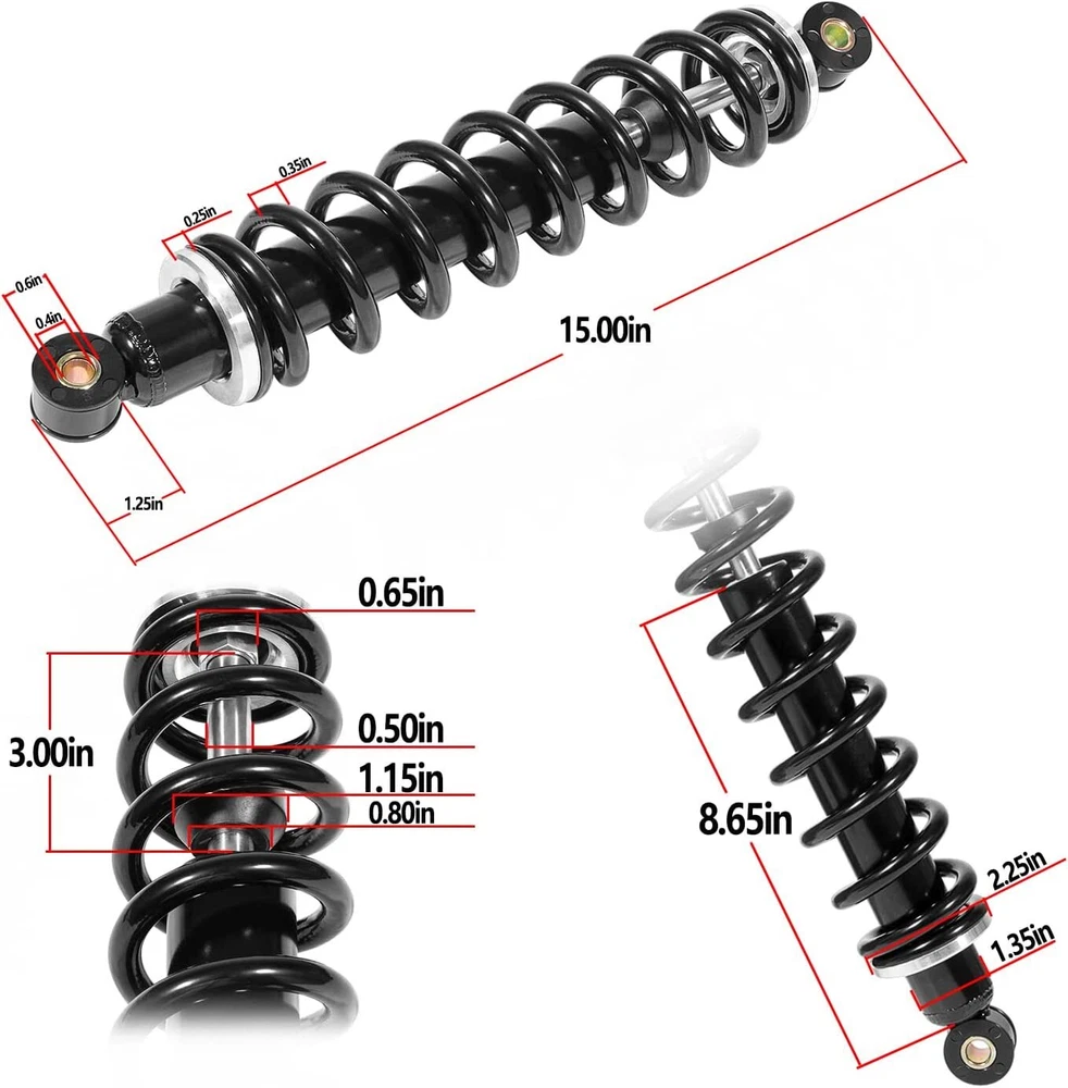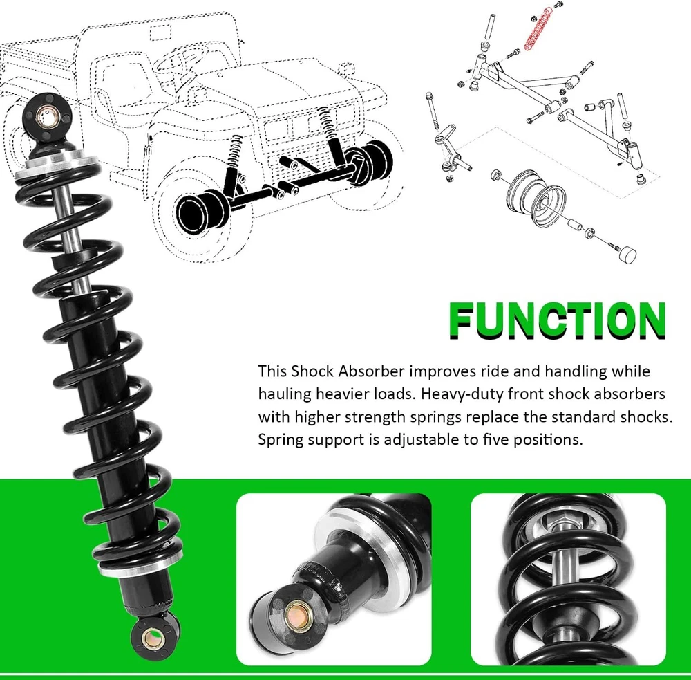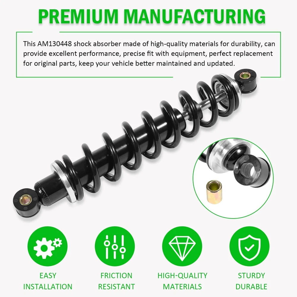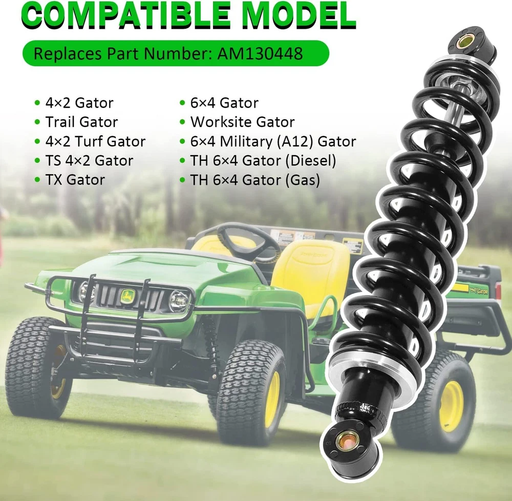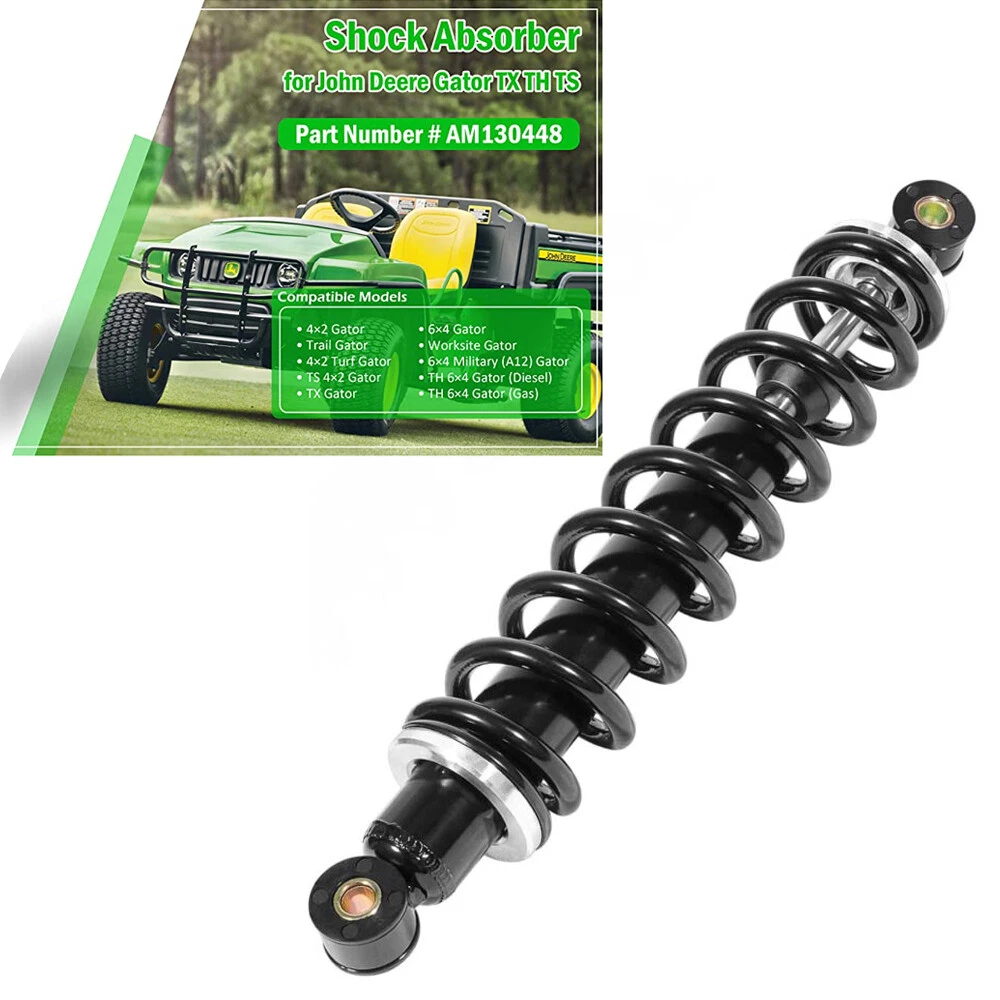 Item Weight: 3.72 pounds Material: Steel Exterior: Black Manufacturer Warranty: 1 Year Position: Front Brand: Unbranded Type: Shock Absorber Front Suspension Kit Compatible Model: For John Deere Gator Models MPN: Does not apply Product Dimensions: 15 x 2.4 x 2.4 inches Style: Modern Color: Black Application: For John Deere Gator Models TX TH TS 4x2 6x4 Model: AM130448 UPC: Does not apply Vehicle Service Type: Truck gtin13: Does not apply