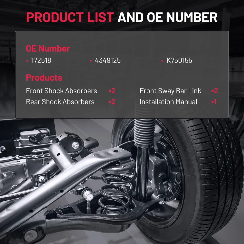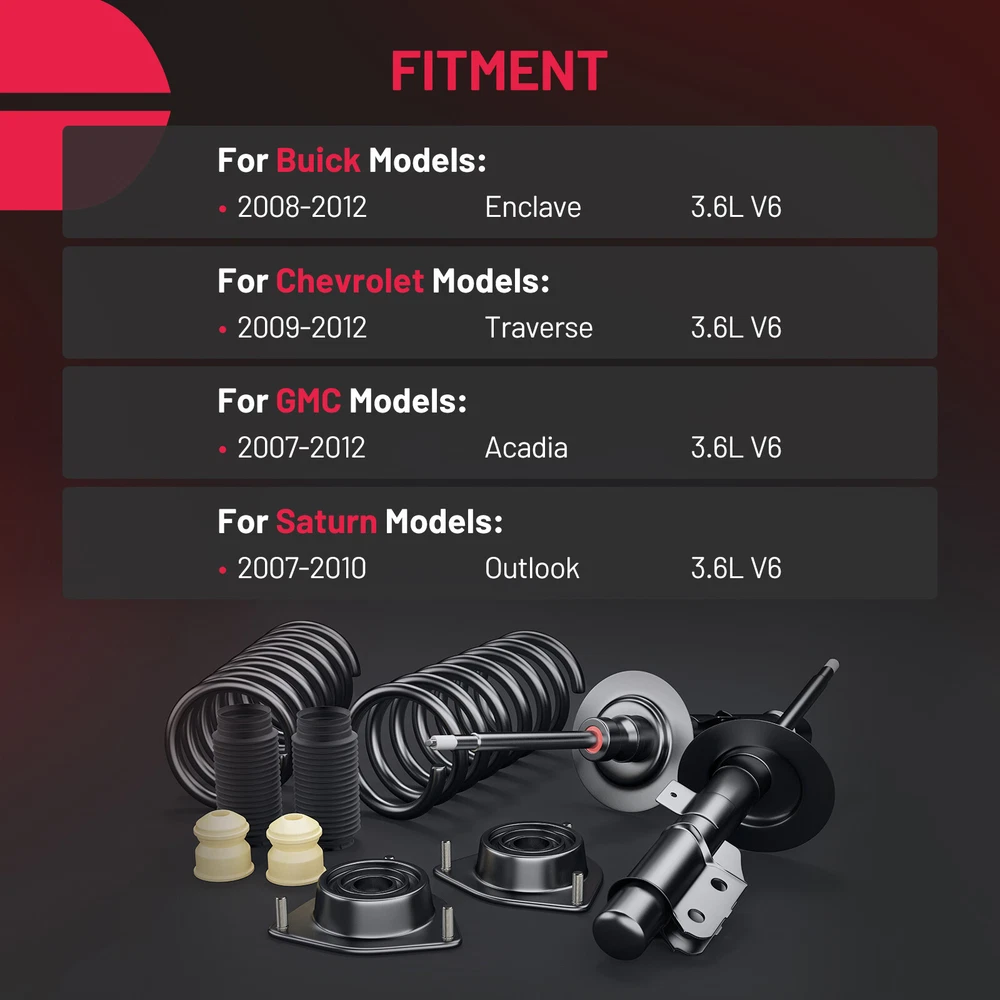 Kit Part Includes 2x Complete Front [Left & Right] Quick Install Ready Strut - 172518 2x Complete Rear [Left & Right] Shock Absorber - 4349125 2x Front Stabilizer Sway Bar End Link - K750155 Fits BUICK ENCLAVE 2008 - 2012 All Models CHEVROLET TRAVERSE 2009 - 2012 All Models GMC ACADIA 2007 - 2012 All Models SATURN OUTLOOK 2007 - 2010 All Models Front Struts Rear Shocks Sway Bars for Chevy Traverse Buick Enclave GMC Acadia Front Strut & Coil Spring Rear Shock Sway Bar Kit Fits Driver and Passenger SIdes Kit Includes: 2x Front Strut w/ Coil Spring Assembly - 172518 2x Rear Shock Absorber - 4349125 2x Front Stabilizer Sway Bar End Link - K750155 Each Strut Assembly includes: Strut Coil Spring Boot Bumper Kit Spring Seat Isolator MAKE MODEL YEAR RANGE SPECIFIC DETAILS BUICK ENCLAVE 2008 - 2012 All Models CHEVROLET TRAVERSE 2009 - 2012 All Models GMC ACADIA 2007 - 2012 All Models SATURN OUTLOOK 2007 - 2010 All Models Payment Delivery details Terms of sales About us Contact us Payment 1.We only accept PayPal. PayPal is the only online payment method we accept. Please make sure you have a valid/confirmed PayPal account prior bidding. 2.All Paypal Payments must be Confirmed. Payment must be made within 48hrs of the auction end time. Non-Paying bidders will be reported. 3.When you get your package,maybe you will pay some charges, it's taxes for local customs,not pay to us, and the fees are depends on the customs, all buyer are same. Delivery details 1.Items will be shipped within 2 business days after payment is received. 2.We ship to your eBay address. Please make sure your eBay address is correct. Buyer takes responsibility if eBay address is wrong. 3.Import duties, taxes and charges are not included in the item price or shipping charges. Please check with your country customs office for these additional charges. 4.We shipping using UPS or USPS from our nearest warehouse to you. Tracking numbers will be emailed upon shipment. Terms of sales 1.Please feel free to email us if you have any question. 2.We appreciate you contact us via eBay message when you are not satisfied rather than open case or leave negative feedback directly. We'll try our best to solve the issue. 3.Refund will be issued once we receive your returned items. Buyer is responsible for all return shipping charges. 4.Please contact us for return process before you return the item. 5.All items for exchange or refund must be returned in "as new" condition. About us We are the responsible seller ,always provide high-quality products and best service .If you have any questions, please contact us, and will try our best to help you. Please contact us by eBay Message, and we will reply you within 24 hours. Thank you very much! Contact us We are the professional auto parts manufacturer , and provide line lock, AN hose end fittings , fuel line , fuel filter , fuel regulator , exhaust cutout , exhaust tips , exhaust muffler and so on .The quality of the product to be secured. If you have any questions or any needs , please contact us , and will try our best to help you.