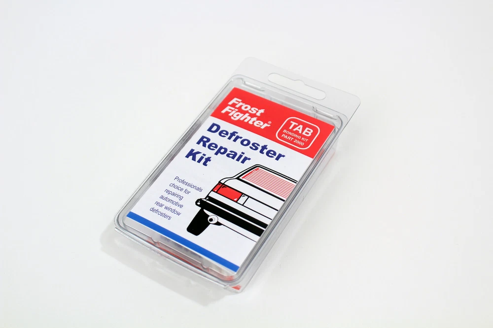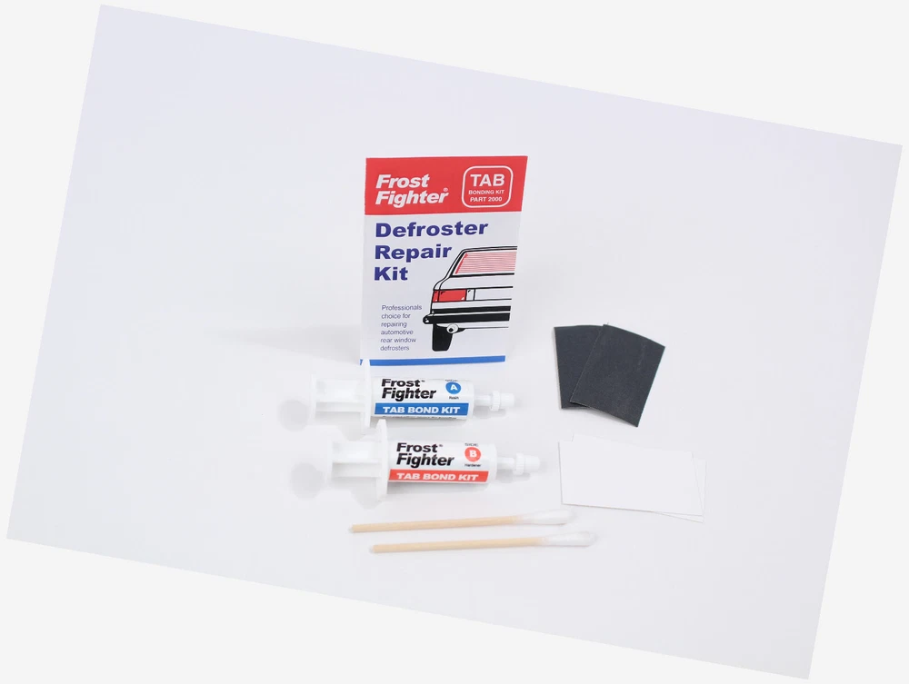Frost Fighter Rear Window Defroster/Defogger Tab Bonding Repair Kit 2000 Bonds metal tabs back to rear window defrosters High sliver content for maximum electrical conductivity Includes mixing sand paper, mixing pads, and stir sticks Approved by General Motors for defroster repair / defogger repair Adhesion promotion for rugged and reliable conductive defroster / defogger tab bonds