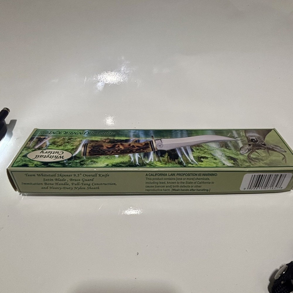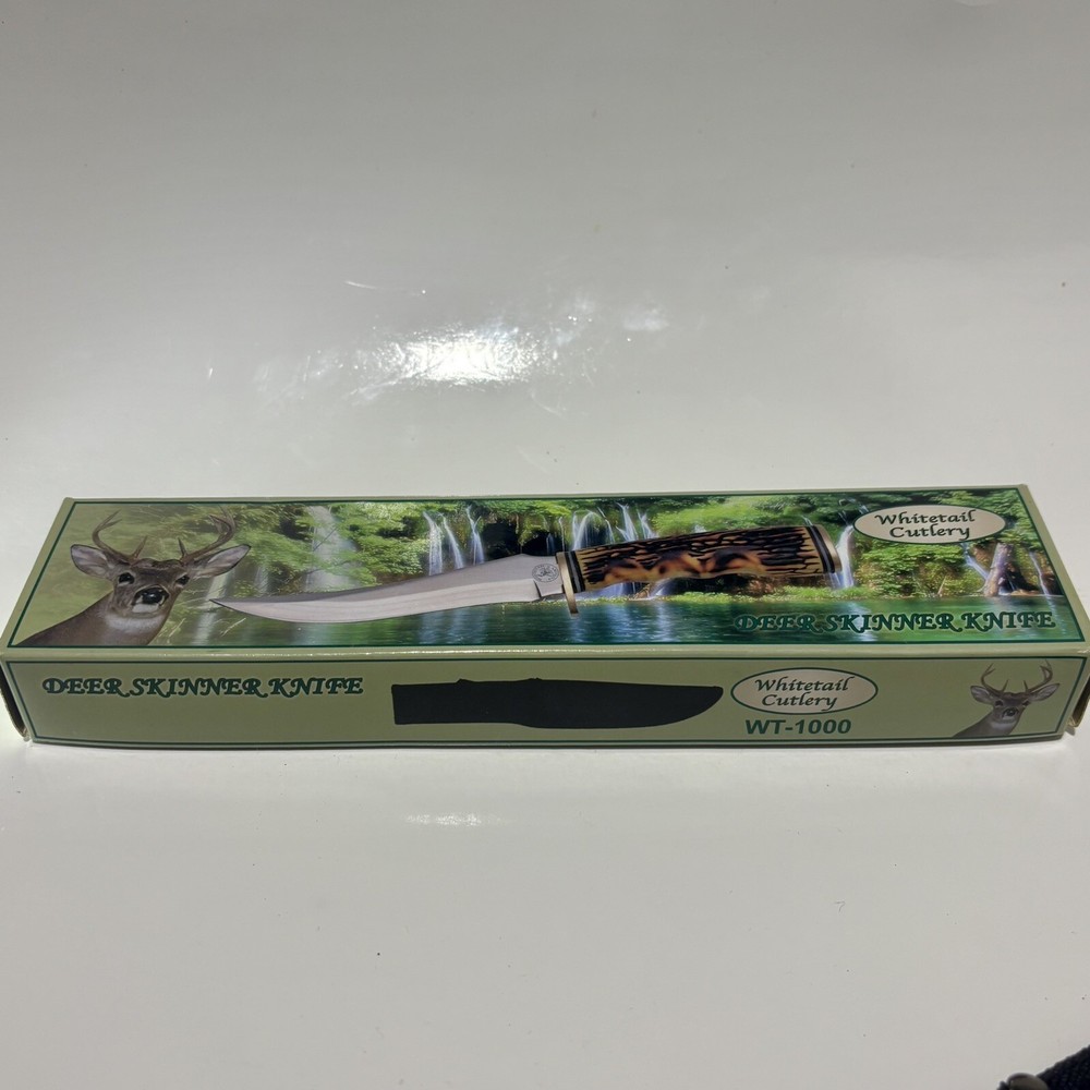 The Frost Whitetail Cutlery Fixed Blade Knife features a stainless steel blade with a silver color, 5 inches in length. It is a Bowie and Hunting type knife, made in Pakistan. The handle is crafted from imitation bone material, and the knife comes with a leather sheath. This item is new in box and is designed for collectors and knife enthusiasts.