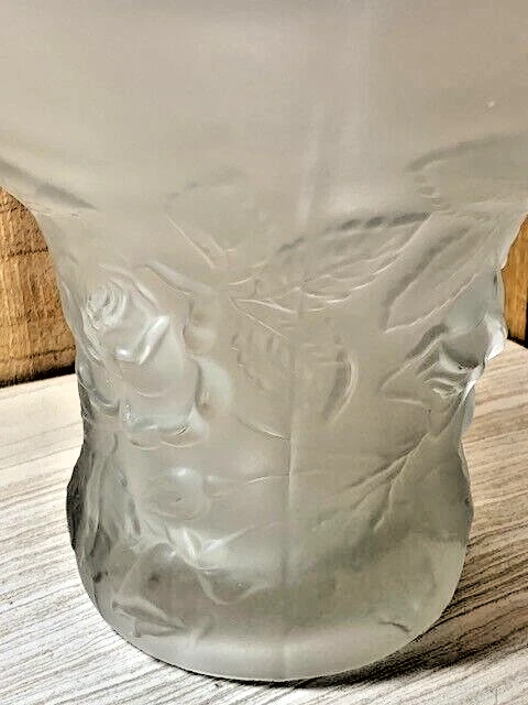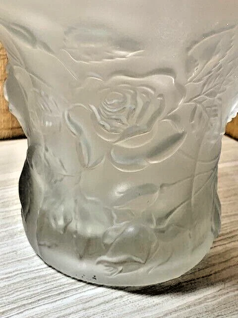 Frosted glass rose bowl or vase with a flared top and raised roses on the outside. Approximately 7" tall, 9 1/4" diameter at the top, 4" diameter at the base and weighs 4 lbs 2 oz. There are a few light scratches from use and white spots that might be from the manufacturing process as seen in the photos. No visible cracks or chips. Please see all photos as they are part of the description. We try to list as many details as possible, however some items are vintage and pre-owned so flaws are to be expected. We try to find out as much information as possible on each item we have available. On occasion we may make a mistake and appreciate your feedback.