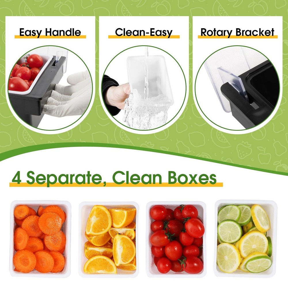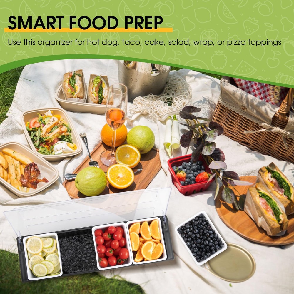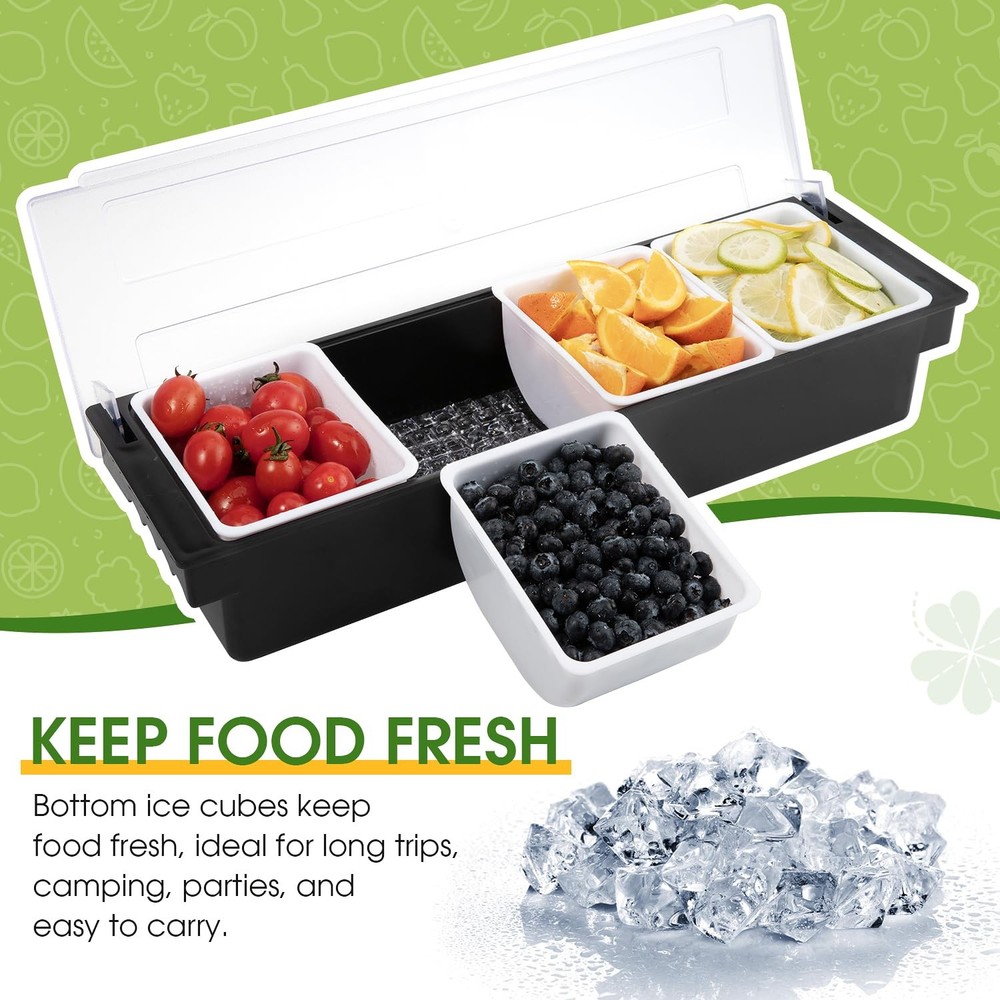 Chilled Condiment Server with Lid - 5 Removable Compartments, Condiment Serving Tray with Ice Tray & Free Mat, Clear Fruit Organizer with Ice Chamber, Perfect for BBQs, Mimosa Bars & Parties ORGANIZE CONDIMENTS & GARNISHES - Our portable Condiment Container has multi trays that have enough space to hold party food items, such as olives, pickles, fruit slices, nuts, sauces and salad dips. KEEPS FOOD FRESH - Need to keep your food nice and cool? Underneath the trays, there is space for you to place ice cubes, which will keep your fruits and veggies nicely chilled and ready to serve. EASY TO CLEAN - To thoroughly clean this condiment caddy, just remove all the trays and place them on the top rack of your dishwasher. Wipe down the rest of the caddy with a clean cloth. PORTABLE & EASY TO TRANSPORT - Made of sturdy yet lightweight plastic and fitted with ergonomic finger grips on each side, our condiment dispenser can be carried around effortlessly by hand. FOR ANY OCCASION: These tray organizers are perfect for restaurant buffets and bars, picnics, barbecues, and indoor/outdoor catering parties. Even use as a coffee bar organizer, taco bar party supplies, juice bar station!