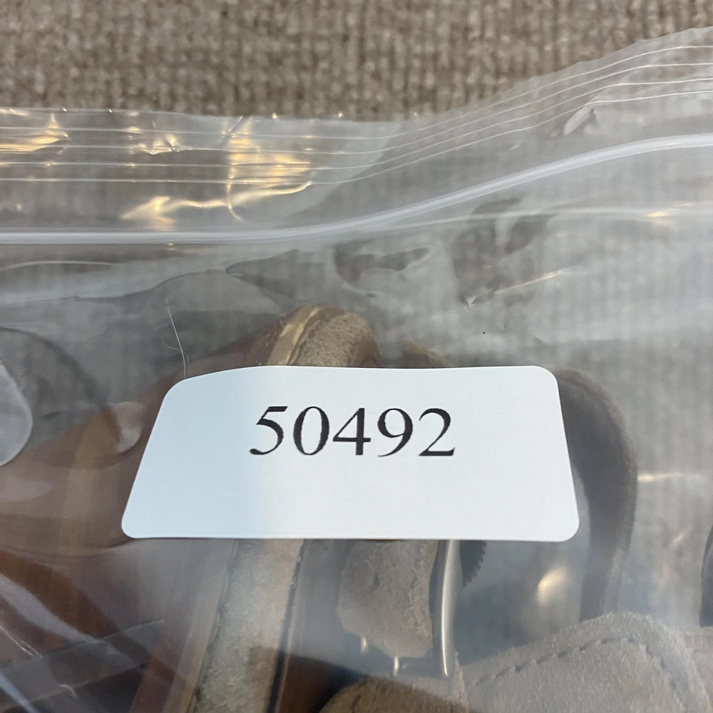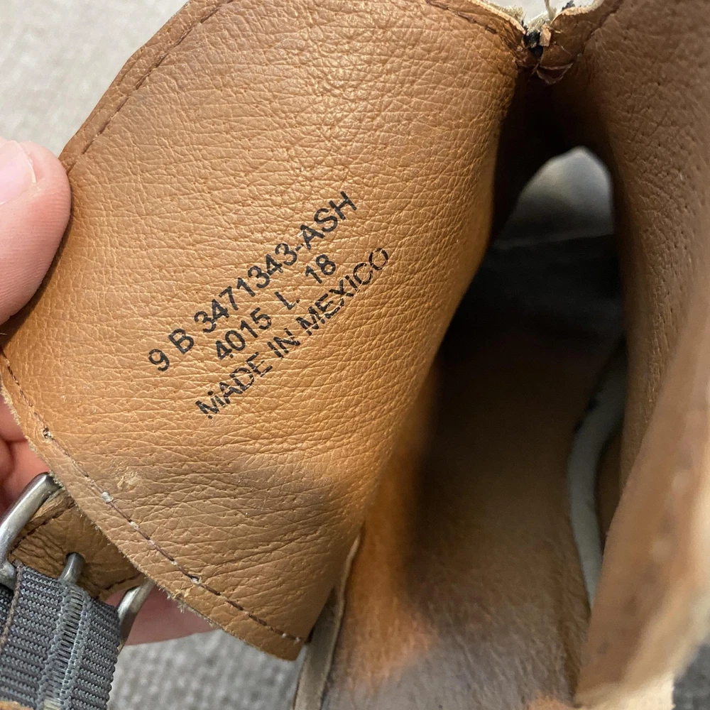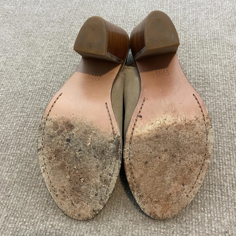 Pre-owned Frye womens suede slingback sandals with moderate to heavy cosmetic wear from prior use. Suede uppers show surface rubbing, nap wear, small darker marks, and faint discoloration at the toes and sides. Footbeds display pronounced dark staining, wear impressions, and scuffing across the toe and ball areas. Leather outsoles have heavy soiling, abrasion, and worn finish at the forefoot while remaining structurally intact. Stacked block heels show surface scratches and rubs but maintain their shape with heel caps secure. Slingback straps and metal buckles are functional. Sandals are sold without the original box or additional accessories. Brand: Frye. Style: Womens Frye suede slingback sandals with a peep toe front and high block heel. Size: Womens US size 9B with UK size 7, EU size 40, and AU size 7, standard width B. Color: Beige ash suede upper with tan leather lining, brown stacked wood block heels, and natural leather outsoles. Material: Suede leather upper with smooth leather lining and footbed, stacked wood heel, and leather outsole with rubber heel caps. Details: Open toe design with high front vamp, adjustable slingback ankle straps with metal buckles, stitched welt construction, and gently tapered block heels. Features: Versatile high heel slingback sandals suitable for warm weather casual or dressy outfits, suede upper for a soft textured look, and classic stacked heel styling. Branding: FRYE logo stamping on the leather outsoles. Tags and codes: Interior size stamp lists 9 B 3471343 ASH 4015 L 18 and Made in Mexico. Special notes: Frye womens beige ash suede slingback peep toe block heel sandals, style code 3471343.