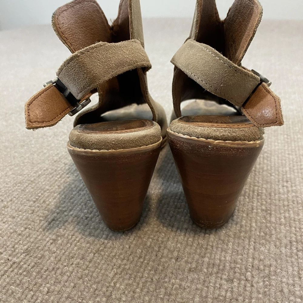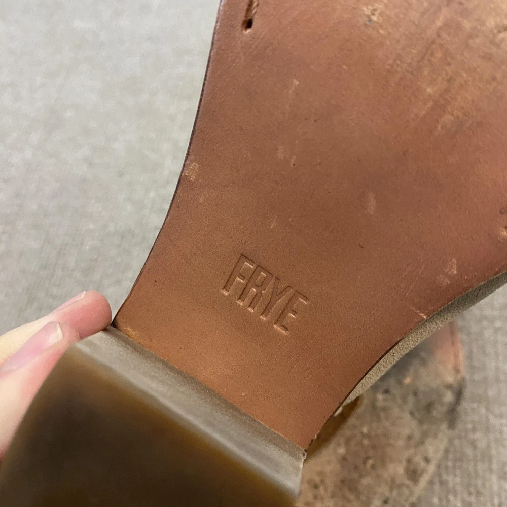 Pattern: Solid EU Shoe Size: 40 Occasion: Casual Department: Women Closure: Buckle Features: Adjustable Strap, Buckle, Straps Shoe Width: B Upper Material: Suede UK Shoe Size: 7 Color: Beige Season: Summer Type: Sandal Style: Slingback Customized: No Vintage: No Brand: Frye Heel Height: High (3-3.9 in) US Shoe Size: 9 Heel Style: Block AU Shoe Size: 7 Country of Origin: Mexico