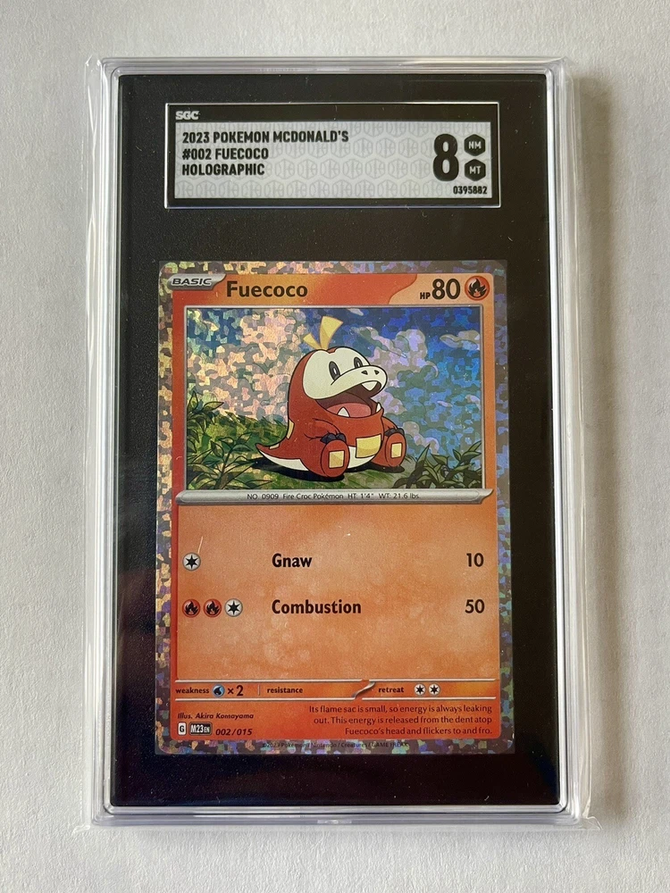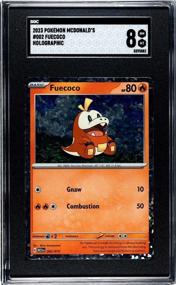 Illustrator:Akira KomayamaAttack #2:[R][R][C] Combustion (50)Retreat Cost:CCCard Type:PokémonCard Text:Its flame sac is small, so energy is always leaking out. This energy is released from the dent atop Fuecoco's head and flickers to and fro.Weakness:x2 [W]brand:The Pokémon CompanyGame:Pokémon TCGFinish:HoloHP:80Features:PromoRarity:PromoCard Name:FuecocoSet:McDonald's Promos 2023Attack #1:[C] Gnaw (10)Stage:BasicManufacturer:The Pokémon CompanyAdditional Description:FuecocoCard Number:002/015Language:English