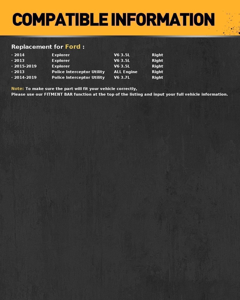 Advantages of KAC Fuel Pump Fuel supply: The Fuel pump assembly can provide stable fuel flow and pressure, ensuring the normal operation of the engine. Boosting: The Fuel pump assembly can increase the pressure of fuel, sending it into the high-pressure fuel rail to meet the needs of high-pressure fuel systems such as direct injection engines. Filtering: The fuel filter in the Fuel pump assembly can filter out impurities and pollutants in the fuel, preventing them from entering the engine. Pressure regulation: The pressure regulator in the electronic Fuel pump assembly is used to control the pressure of the fuel and ensure the stability of the fuel supply. Manufacture Number Part type Manufacture Number Part type Airtex E2605M Fuel Pump Module Assembly Carter P76859M Fuel Pump Module Assembly Carter P77048M Fuel Pump Module Assembly Delphi FG1551 Fuel Pump Module Assembly Delphi FG1756 Fuel Pump Module Assembly Motorcraft PFS-1027 Fuel Pump Module Assembly Motorcraft PFS998 Fuel Pump Module Assembly Spectra Premium SP2509M Fuel Pump Module Assembly Herko Automotive 778GE Fuel Pump Module Assembly Ford DB5Z-9A407A Fuel Pump Module Assembly Ford DA8Z-9H307J Fuel Pump Module Assembly Ford DB5Z-9H307C Fuel Pump Module Assembly Make Model Year Engine Notes Ford Explorer 2013-2014 3.5L 3490CC 213Cu. In. V6 GAS DOHC Naturally Aspirated Ford Explorer 2013-2014 3.5L 3496CC 213Cu. In. V6 GAS DOHC Naturally Aspirated Ford Explorer 2013-2014 3.5L 3496CC 213Cu. In. V6 GAS DOHC Turbocharged Ford Flex 2013-2014 3.5L 3496CC 213Cu. In. V6 GAS DOHC Naturally Aspirated Ford Flex 2013-2014 3.5L 3496CC 213Cu. In. V6 GAS DOHC Turbocharged Ford Police Interceptor Utility 2013-2014 3.7L 3726CC 227Cu. In. V6 GAS DOHC Naturally Aspirated Lincoln MKT 2013-2014 3.7L 3726CC 227Cu. In. V6 GAS DOHC Naturally Aspirated Payment Shipping Return Policy Contact Us About Warranty 1) we accepts all major credit cards via PayPal: MasterCard, Visa, American Express and Discover. 2) We will only ship to the confirmed PayPal shipping address given with the payment. Please make sure your PayPal and eBay address is correct. If not, please correct it before payment. Thank you. 3) If you want to ship to another address, please change your PayPal shipping address before you make payment. 4) To avoid initiating an unpaid item claim, please pay within 7 days. 5) Custom duties, taxes, or charges are not included in the cost you pay to us. We only ship this item to United States ! 1. We ship to your eBay address. Each package will be shipped by UPS or Fedex with tracking number. 2. Ship within 1 business day once payment completed. Orders placed on weekend will be shipped within 3 days. 4. Seriously promise: Refund or resend will be offered if item still not arrive in 7-10 business days. Just send us an email ,we will give you a satisfied solution as soon as possible. If you send us an e-mail, it will be answered within 48 hours during our working hours. Please feel free to contact us if you have any questions: Dear my friend,we appreciate your support.And our goal is service you well and give you a pleasant shopping time in our store. ✅Dear customer, when you want to return or exchange goods (Please contact us first, instead of directly initiating a dispute) 1: Contact the seller first 2: Send pictures: outer packaging&scanned labels&item itself&with complete accessories, etc necessary condition Rule A: The original packaging of the item is in an unused state. Rule B: The outer packaging must not have any damage. 3: Obtain return label 4: Delivered Projects - Payment Repayment ✅A 15% restocking and shelving fee will be charged for returns or exchanges that are not caused by the seller and are in good condition. Exchange will not charge restocking fees or shipping fees due to transportation errors ✅Priority In case of the following reasons, the freight will be borne by the buyer 1: Unexpected order 2: Find a better price 3: Change your mind 4: Buy more items/make mistakes/misread model information ✅Please note Missing accessories/quality issues/transportation damage, etc Please contact us first to obtain a good solution, rather than directly opening a return dispute. Thank you very much for your understanding. I hope we have a pleasant cooperation! Contact us if you have any question, Give us a chance to serve you, negative feedback could not solve anything, communication Please! ❎ (NO) Three stars is LOW star, NO 1,2,3 stars PLEASE! ✅(YES) Please give us Five-star! Have Question or Problem?? Step 1: Contact seller Step 2: Select the 1st topic: I have a question about using my item or I want to send the seller a message. NO others please! Step 3: Describe your question clearly; we will give you the best solution Please leave five stars positive feedback positive comment and Five-Stars. * We maintain a high standard of excellence (5 star rating) and strive for 100% customer satisfaction! * Feedback is very important to us. * We would like you to contact us immediately before giving us neutral or negative feedback so that we can address your concerns to our satisfaction. * If we don't understand these problems, we won't be able to solve them! * After understanding the problem, we will be able to give you a satisfactory answer! It's highly appreciated you leave us positive feedback and 5 star rating comments if you are satisfied with our service! Your comment is very important in our business success. About Warranty ✅ Free repair: During the warranty period, if the product fails due to manufacturing defects, component failure or workmanship problems, please contact us to provide corresponding handling methods. ✅ Warranty period: The warranty period is usually calculated from the date of purchase, and the specific period may vary depend on the product type and brand. ✅ Extended warranty: Some manufacturers may provide additional extended warranty services, which usually require additional fees and may extend the original wa
