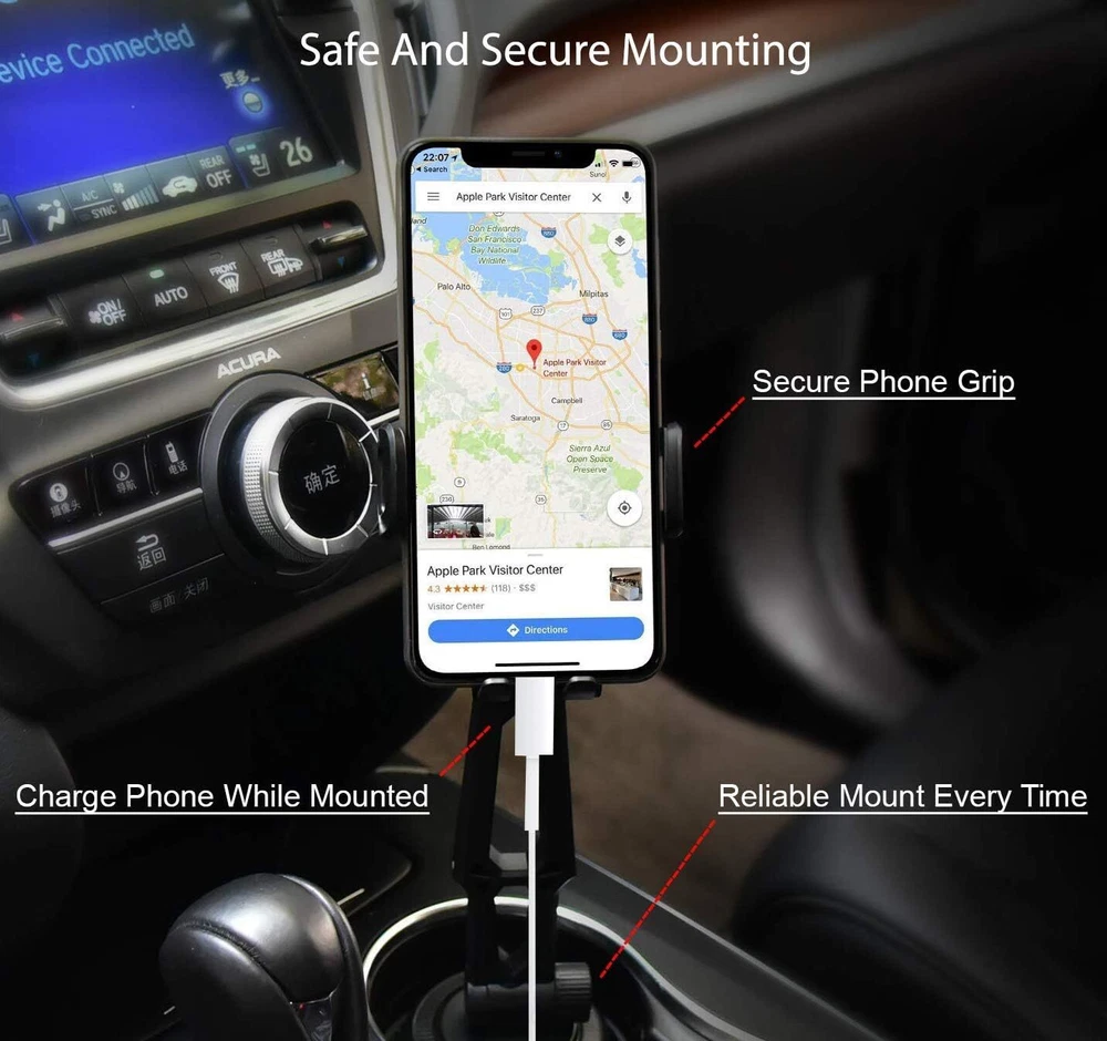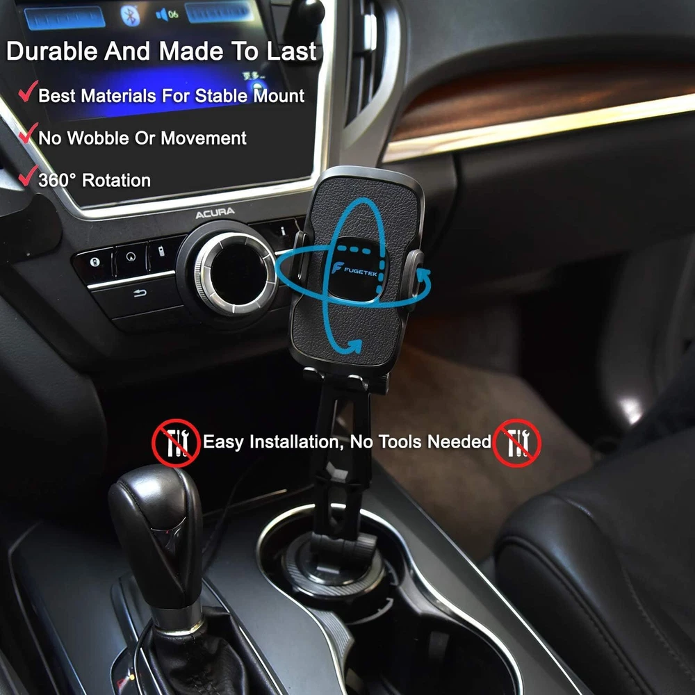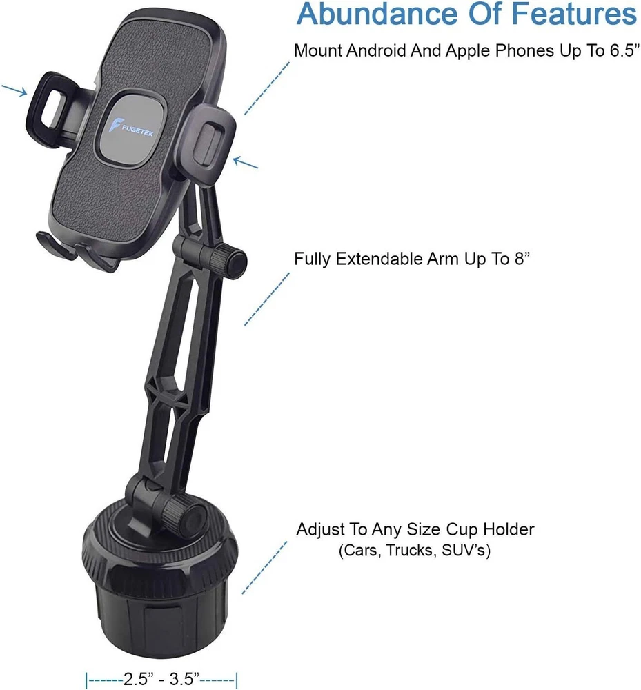 Fugetek Car Cup Holder Phone Mount Cradle, Universal Base, Hands-Free, Black Product Details Package Dimensions: 7.52 x 3.43 x 3.31 inches Item Weight: 11.7 ounces Item model number: FT-619 Special features: Hands Free, Rotates, Adjustable Other display features: Wireless Color: Black Whats in the box: 1 - Phone Holder 1 - Cup Holder Mount Department: Unisex Adult Manufacturer: Fugetek Country of Origin: China Brand: Fugetek Compatible Devices: Smartphones Compatible Phone Models: iPhone, Pixel 3, GalaxyS Mounting Type: Cup Holder Mount SECURE PHONE MOUNT, DRIVE SAFELY: Stable Car Phone Mount And Phone Grip Everytime. Works With Most Standard Car, Truck And SUV Cup Holders. No Wobbling Or Moving. Low Profile Design, Outperforms The Competition. COMPATIBLE WITH APPLE AND ANDROID PHONES: Works Great With Phones Up to 6.5". Perfect Fit Every Time With iPhone 11, XR/XS Max, XS/X, 8/8+, 7/7+, Galaxy S10,S9,S8, HTC, Google. SIMPLE ONE TOUCH LOCK AND RELEASE: With Our One Touch System, Attaching And Retrieving Your Phone Is Quick And Easy. Simply Press The Button On The Back Of The Mount. No Need To Use Both Hands. MULTI ANGLES FOR DRIVER & PASSENGER: Adjust Height And Direction, Easy Operation And Access To Phone. Neck Extends Up To 7.5". 2 Adjustment Screws For Extra Stability. EASY SETUP & USE FOR ALL AGES: Place In Cup Holder, Adjust Base, Mount Phone, Ready To Go. Perfect Fit For Most Any Cup Holder, Hands-Free Navigation For Safe Driving. Friendly Customer Service From Our Office In Houston,Tx Since 2006.
