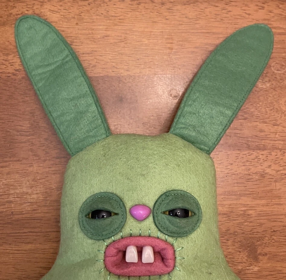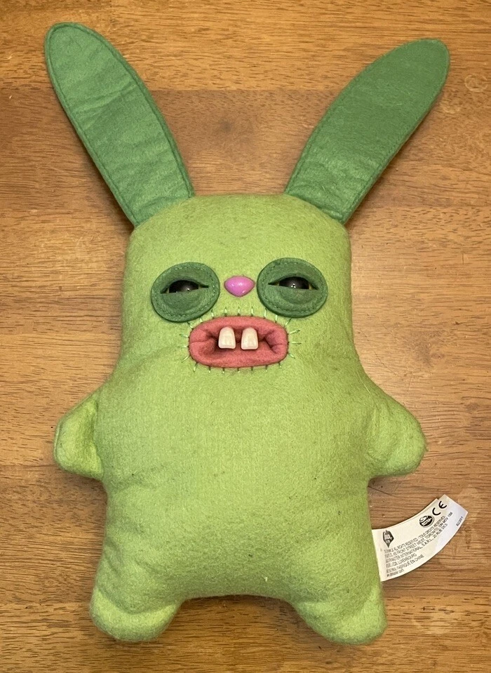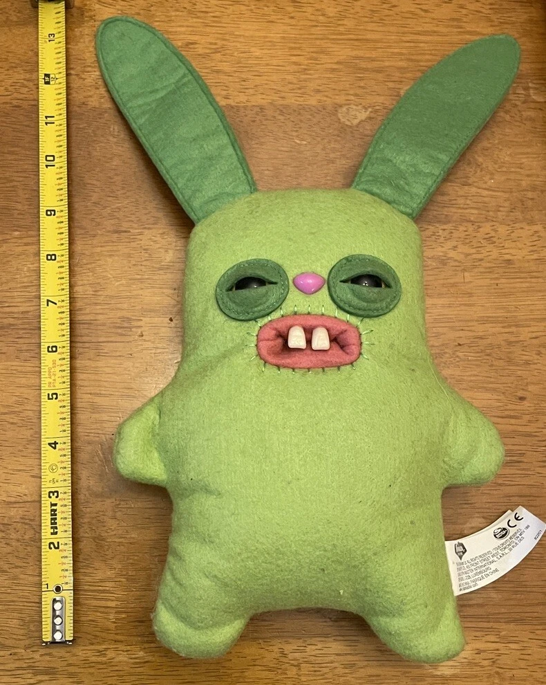 Get ready to cuddle with this adorable Fuggler Rabid Rabbit plush toy! This green monster rabbit has big teeth and a scary appearance, but don't let that fool you. This plush toy is perfect for kids aged 4 and up, and it's made with high-quality materials that ensure it will last for a long time. The Fuggler Rabid Rabbit plush toy is small in size, measuring between 6-14 inches, and it's recommended for kids aged 4+. It's also washable, which makes it easy to keep clean. This toy is part of the Fugglies character family, and it's made in China. With its unique design and cute features, this plush toy is sure to become a favorite companion for any child. This plush is in good preowned condition with light signs of wear, please see ALL photos for a better idea on condition, any measurements, or details to the plush.