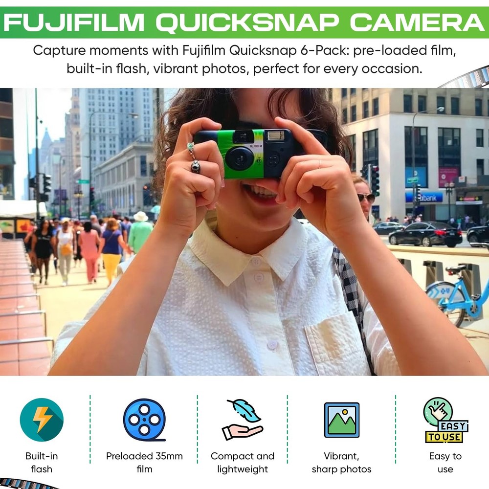 Ultimate Photography Pack: Get 8 Fujifilm Quicksnap disposable cameras, ready with 35mm film, alongside 's lens-care microfiber cloths and secure wrist straps. Snap in Style: Enjoy crystal-clear, vibrant photos with Fujifilm's quality. Each camera is equipped for the perfect shot, anytime, anywhere. Event-Ready Cameras: Supply guests with these easy-to-use cameras at your next event for a fun, interactive way to capture memories together. Travel Companion: Compact and pre-loaded, these cameras are ideal for travelers. Document your adventures without the bulk of traditional gear. No Moment Missed: With a built-in flash, these cameras perform under any light, ensuring your memories are captured perfectly, night or day. Hassle-Free Memories: Designed for single use, these cameras offer the simplicity of capturing moments without the worry of handling film. Bulk Benefits: This 8-pack not only offers value but ensures you have a camera ready for every occasion, from family outings to spontaneous adventures. Quality in Every Shot: Trust in Fujifilm's legacy to turn fleeting moments into lifelong memories with each snap from these disposable cameras. Simple And Convenient: The Fujifilm Quicksnap Flash 35mm Disposable Camera Offers A Fuss-Free Photography Experience. With Pre-Loaded Fujifilm Camera Film And A Built-In Flash, These Cameras Are Ready To Capture High-Quality Images In Any Lighting Condition. Ideal For Weddings, Parties, Or Everyday Moments, Enjoy The Classic Film Aesthetic With The Convenience Of A Disposable Format. High-Quality Imagery: Each Fuji Film Camera Is Equipped With A 35mm Lens Capable Of Producing Sharp And Vibrant Photos. The Built-In Flash Ensures Excellent Exposure, Even In Low-Light Conditions, Making It A Reliable Choice For All Your Memorable Events. Capture Stunning Film Photography With Ease And Confidence. Bulk Package Benefits: This 6 Pack Of Fujifilm Disposable Cameras Is Perfect For Capturing Multiple Angles And Perspectives At Any Event. Distribute Them Among Guests At A Wedding Or Party To Ensure No Moment Goes Unphotographed. Bulk Packaging Offers An Economical Solution Without Compromising On Quality. User-Friendly Design: Designed With Simplicity In Mind, Each Disposable Film Camera Features A Compact, Lightweight Body And A Comfortable Wrist Strap For Easy Carrying. The Intuitive Design Allows Users Of All Ages And Skill Levels To Take Beautiful Photos, Just Point And Shoot! Eco-Friendly And Ready To Use: Each Disposable Camera Bulk Pack Comes With A Microfiber Cloth For Keeping Lenses Clean, Ensuring Clear Shots Every Time. The Cameras Are Eco-Friendly, With Recyclable Parts And Packaging, Aligning With Sustainable Practices While Providing Exceptional Utility And Value.