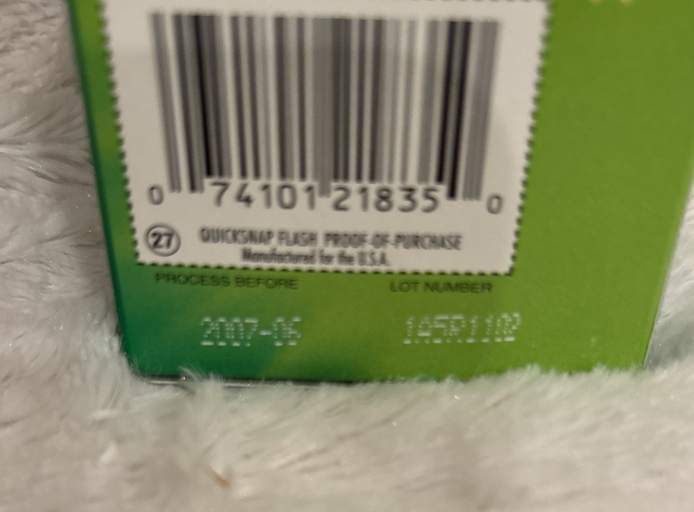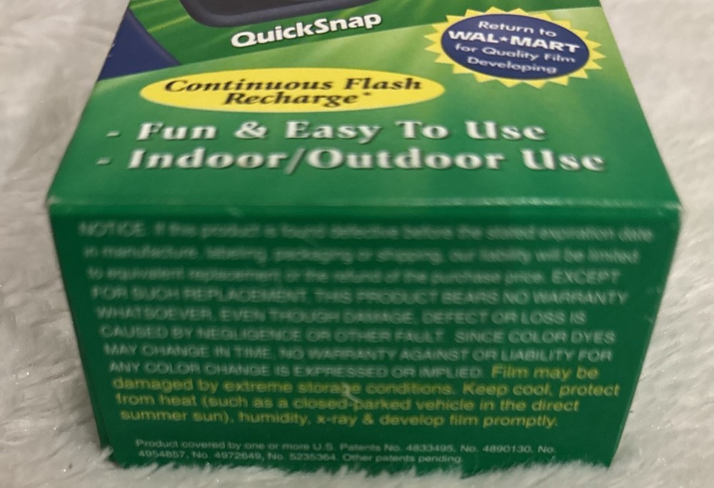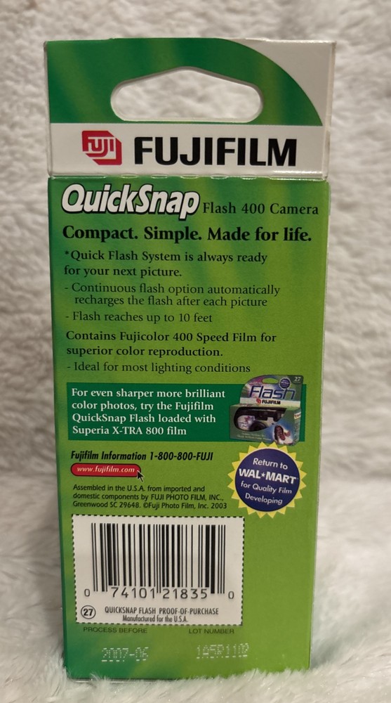 Capture every moment with the Fujifilm Disposable Camera Quicksnap Smart Flash. This single-use camera features a fixed focus and built-in flash, making it perfect for capturing quick snapshots. With a 400 speed and 27 exposures, you can be sure to get the perfect shot every time. This compact camera comes in a vibrant green color and is part of the Fujifilm Compact Series. The camera was manufactured in the United States in 2007 and is no longer available for purchase. Whether you're a photography enthusiast or just looking to capture memories without the hassle of a traditional camera, the Fujifilm Disposable Camera Quicksnap Smart Flash is the perfect choice. Date on box 06-2007