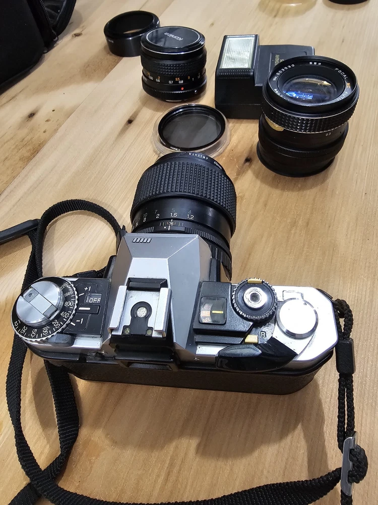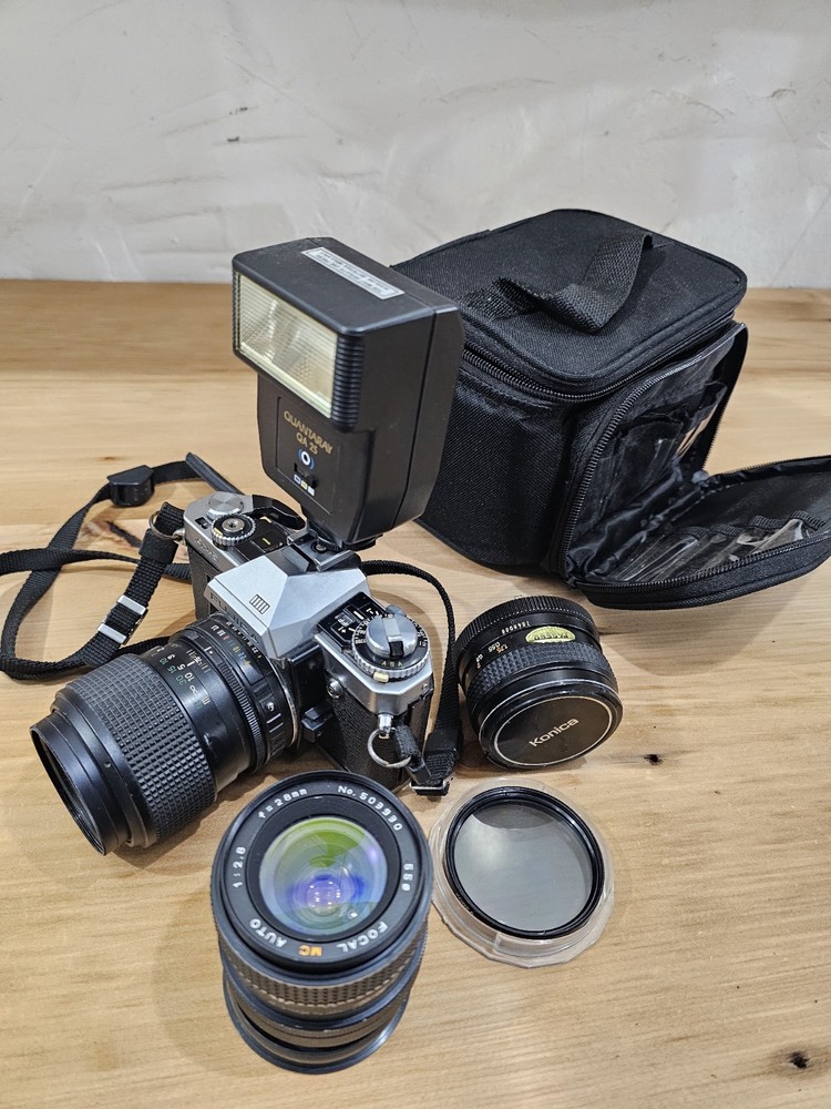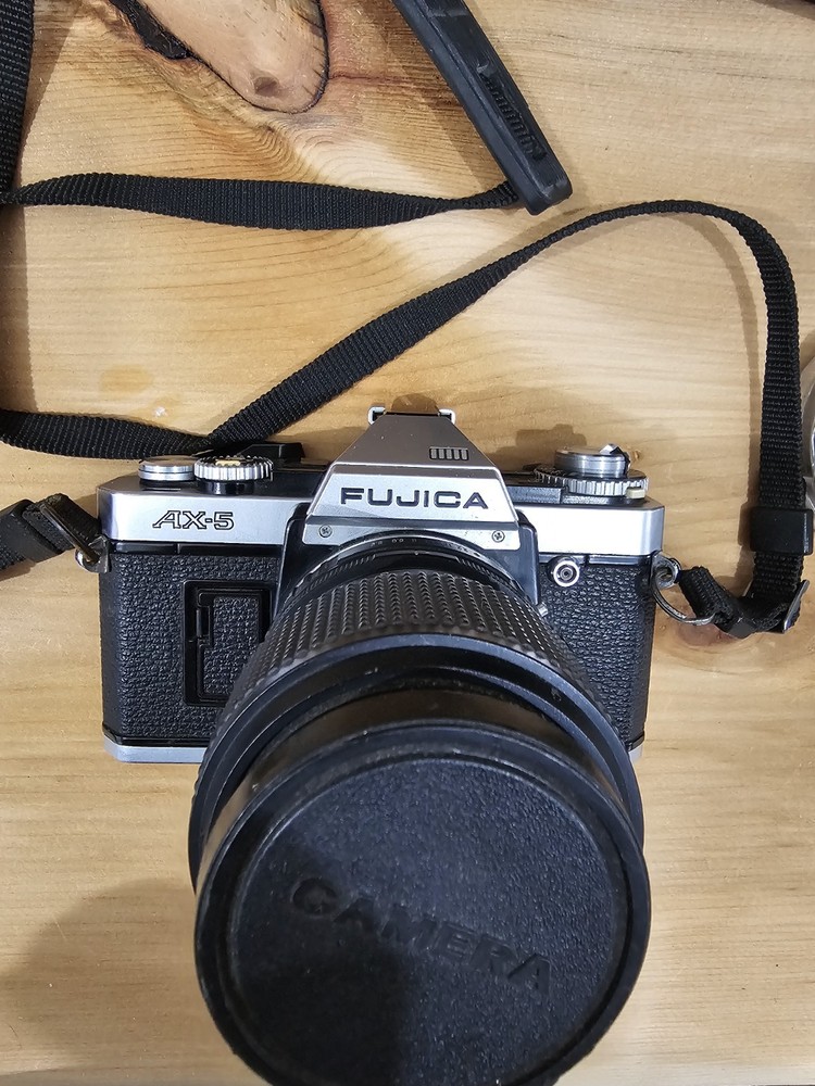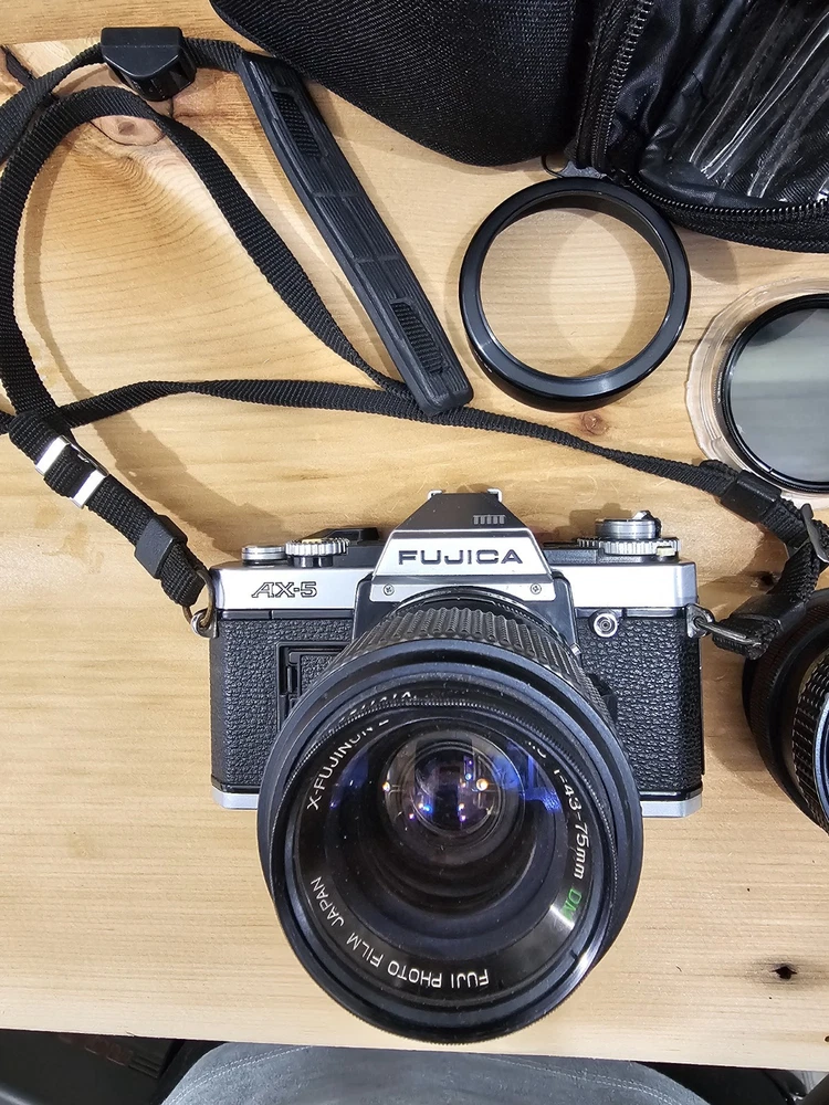 The Fujica AX-5 is a 35mm SLR camera manufactured by Fuji in the early 1980s. It belongs to the film photography category and is a classic piece for collectors or enthusiasts of vintage cameras. With its manual controls and sturdy SLR design, the Fujica AX-5 offers a retro photography experience with a modern touch. Perfect for capturing timeless moments and experimenting with the aesthetics of film photography, this camera is a reliable choice for those who value quality craftsmanship and classic design. Fujica AX-5 is a 35mm SLR camera manufactured by Fuji in the early 1980s. It is one of three cameras, including the AX-3 and AX-1. These cameras share a similar body, but the AX-5 features more exposure program modes and was the top-of-the-range model. It has a silicon exposure meter and exposure modes: programmed, shutter priority, aperture priority and manual. The focal plane shutter is electronic, with a maximum speed of 1/1000 and a v