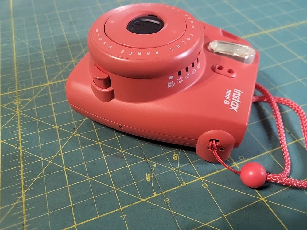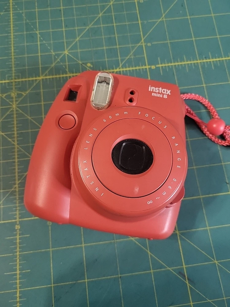 The product is a Fujifilm Instax Mini 8 instant film camera in Raspberry Red color. It is from the Compact series, with Instax Mini format. The model has been tested and is in working condition. Batteries and film not included .