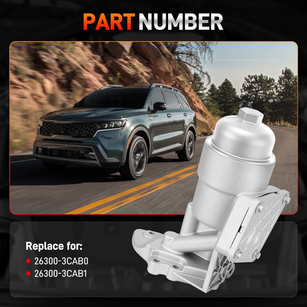 gtin13: Does not apply Type: Engine Oil Filter Housing Material: Aluminum Brand: Unbranded Manufacturer Part Number: 26300-3CAB1, 263003CAB1, 26300-3CAB0, 263003CAB0 Items Included: Engine Oil Filter & Housing Assembly OE/OEM Part Number: 26300-3CAB1, 263003CAB1, 26300-3CAB0, 263003CAB0 Features: Easy Installation, High Performance, Durable, Perfect Fit Manufacturer Warranty: 3 Months Placement on Vehicle: Front UPC: Does not apply Gasket Material: Rubber Country/Region of Manufacture: China
