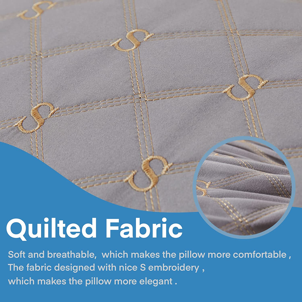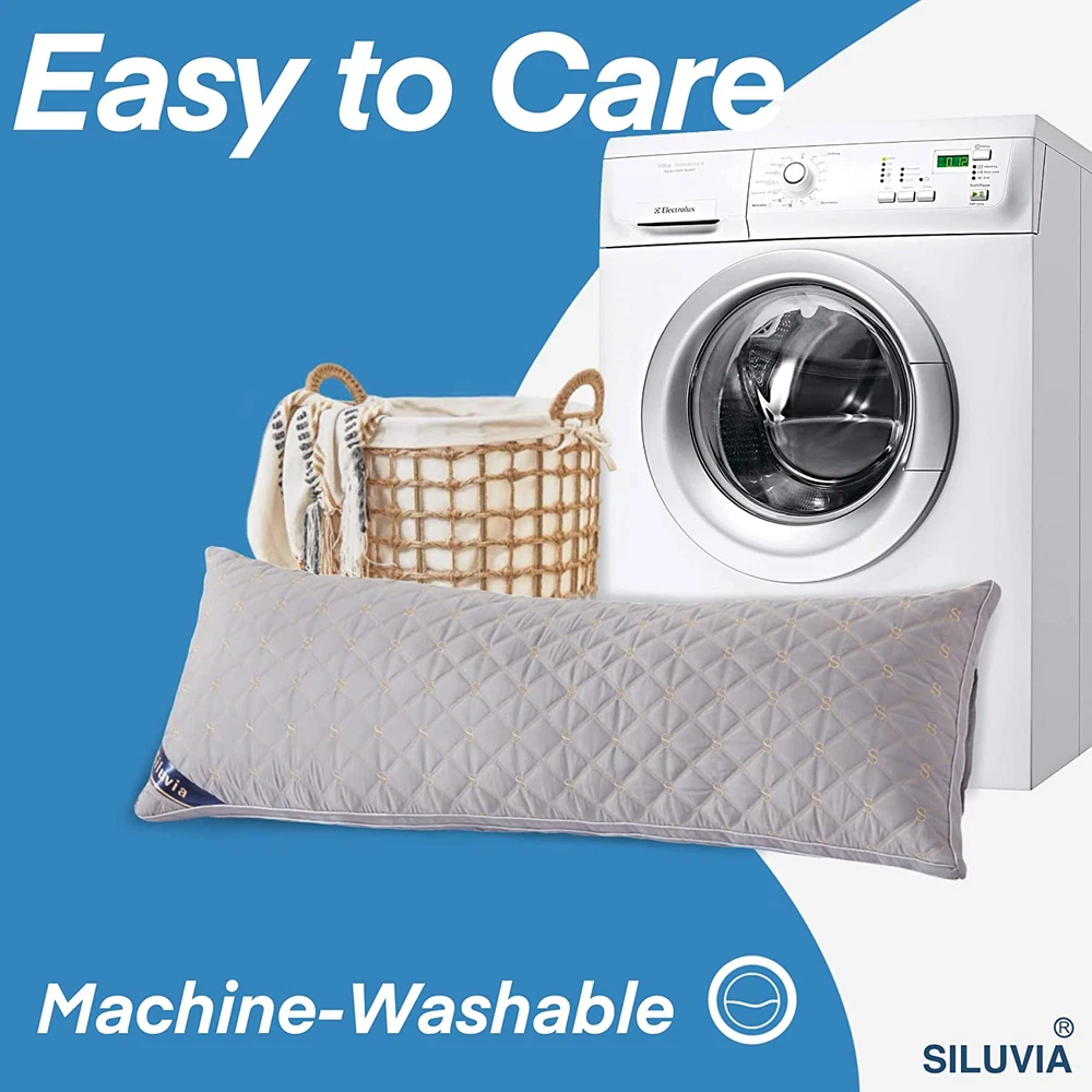 SIZE: A single 21 *54”body pillow with 100% polyester cover and soft, extra-breathable filling. Large and soft bed pillow insert made by Siluvia that maintains its form and medium firm support. Perfect for everyday usage, the structure and materials provide enduring comfort. SKIN-FRIENDLY AND COMFOTABLE: The superior breathable polyester fabric used to make the Siluvia body pillow comes with a quality guarantee. The cushion is made more opulent, ornamental, and attractive by the delicate S logo embroided on its quilted surface and its distinctive design. With an ultra-soft, high-standard polyester filling inside, it feels secure, noiseless, odor-free, and supportive without sacrificing softness. MANY FUNCTIONS: The cozy Siluvia body pillow accommodates several positions for the demands of adults, pregnant women, and other situations. Particularly for insecure persons who want support for their knees, hips, back, or abdomen. Also excellent for reading, breastfeeding, and unwinding. Your body receives complete support and sufficient comfort from the pillow when you sleep or relax. It might also just be your bed's nightstand. PACKAGE: A lovely carton adorned with the Siluvia emblem has a body cushion that is vacuum wrapped in a plastic bag. After opening the package, please give the pillow a full day to puff up. CARE INSTRUCTION: For simple upkeep and care, it is advised to hand wash or spot clean the fabric.There is a machine wash option: Please use cold water, spin dry at a low speed, tumble dry on low, or bask in sunlight. Product Description Have a nice sleep with Siluvia Si luvia body pillows provide multi functions, applicable to a variety of scenarios. Not limited to use on bed, it can also be used on sofa, the body pillow's mean function is to relax your body, to relief your body's pressure. Body Fitted Size 21x54 Inch body pillo w , fit your body nicely and provide more functions. Letter embroidery The the quilted surface embroider with delicate S logo, the unique design makes the pillow more fancy, decorative and elegant. Designed Zip The Siluvia long pillow designed a zip on side, which can help adjust the filling easily, you may add or remove the filling to help the pillow fit your body more comfortable. Soft & Breathable Fabric Siluvia body pillow made with upgraded breathable polyester fabric. The fabric with OEKO-TEX Certificated provide our customer good quality. Muti-position as you like Nice body support, may help relief the pain from back, neck, legs or spine. Multi functions for reading, relaxing, working or nursing on bed or sofa. Good choice for pregnancy care, help relief the pressure from mother's belly, back, legs or waist. Can be a simple bedside for your bed. Easy to care Machine wash in cold water and tumble dry on low, or bask in sunlight. Recommend with two laundry ball to help inserts fluffy up. Color choices All white White with gray pipping and wall All gray