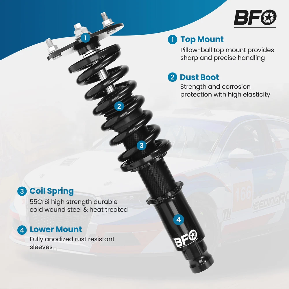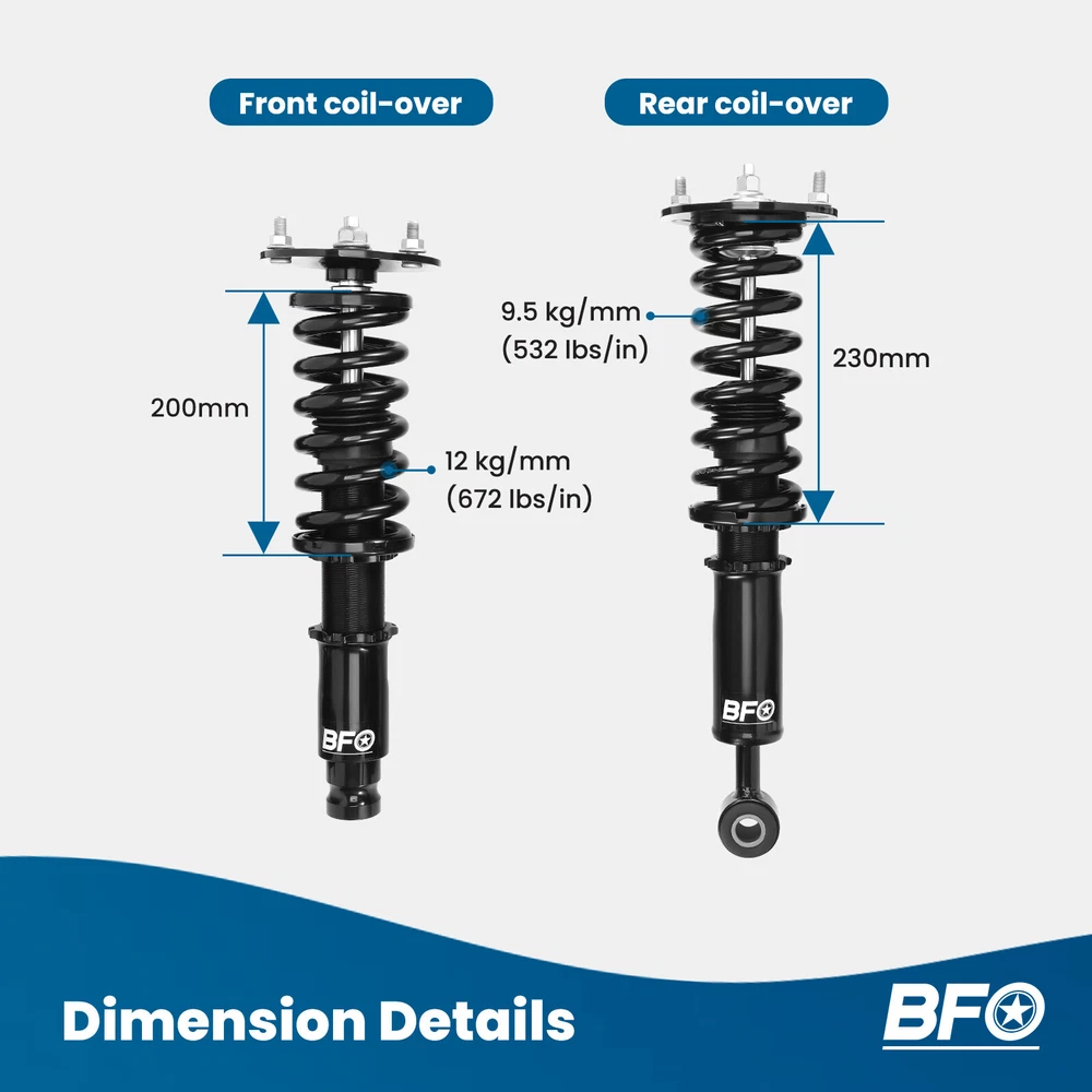 carpartsharehouse Home | Contact us | Promotion Fast hipping International Shipping 30 Days Return Policy Secure Shopping Full Coilovers Suspension Kit For Mitsubishi Eclipse 1995-99 Adj. Height Struts Most Competitive Price Manufacturer We know our products Easy Return Quick, Simple Guaranteed Fitment Always the correct part DESCRIPTION BFO coil-overs strike the perfect balance between aesthetics, performance, and comfort. The coilovers from BFO are a street-friendly and affordable option for those not looking to explode their bank accounts for mods. Features 1. Self design structure and new manufacturing system to give more customers good coilovers without breaking your bank. 2. Full length height adjustable---lower your car 1-3 inches to get performance ride 3. Independent Ride Height and Spring Pre-load Adjustments 4. Twin-Tube System for Comfortable Ride on Streets 5. Coated finish to avoid rust 6. Heavy Duty Steel Lower Mounts 7. Simple install, Easy to adjust. Application For MITSUBISHI ECLIPSE 1995-1999 D38A CONVERTIBLE, 4CYL/TURBO For MITSUBISHI ECLIPSE 1995-1999 D33A 4CYL/TURBO For MITSUBISHI ECLIPSE 1995-1999 D32A 4CYL/TURBO For MITSUBISHI ECLIPSE 1995-1999 D31A 4CYL/NON TURBO Specifications - Front top mount: Pillow ball - Rear top mount: Rubber - Height adjustable: Yes, lowering 25-75mm depending on the vehicle models - Spring Rate Front: 12 kg/mm (672 lbs/in) - Spring Rate Rear: 9.5 kg/mm (532 lbs/in) - Spring length Front: 200 mm - Spring length Rear: 230 mm - Spring Preload advised: 7-10 mm - Color: Black body with black spring Package included 2x Front coil-overs 2x Rear coil-overs 1x Allen wrench 2x C spanners ★ 30-day Money Back & 12-Month Replacement Guarantee. Please feel free to contact us if there is any question. Height Adjustable Lowering Kit; Independent Ride Height And Spring Tension Settings; High Rigidity 55CrSi Steel Cold-bent Springs; Anodized Shock Body With Anti-Corrosion Coating; Top Pillow Ball Mount Provides More Precise Feel From Suspension And Steering; Full 1 Year Limited Warranty From Date Of Purchase. SHIPPING US Domestic Shipping Notice - All items will be dispatched within 24hrs(Mon-Fri) Our carrier collects all the parcels at 4:30am PDT, any payment paid after 5:00am PDT will be shipped the next day at 4:30am PDT. If you paid Item Shipped On Est.Delivery Time Before Apr. 1st at 4:30am Apr. 1st at 5:00am Apr. 5th - Apr. 7th After Apr. 1st at 4:30am Apr. 2nd at 5:00am Apr. 6th - Apr. 8th If our estimated delivery time and eBay’s are contradictory,please refer to the standard delivery time of ours. Estimated Delivery Time From To Service Est.Delivery Time US US UPS or Fedex Ground 3-5 Business days Outside of US DHL FedEx 4-7 Business days Please provide the following shipping information for your order Otherwise your shipment will be deferred. We are not responsible for any shipping lost caused by wrong shipping information International Shipment For international shipment, we do not cover any import taxes or duties. Import tax is charged by the government, not us. Our item price and shipping cost do not include any import tax which will be charged by the shipping company when you got the parcel. Please be noted that is not the extra shipping fee. WARRANTY We aim to provide you the good buying experience, 30 days return policy is offered in our store. Please follow our return policy before you return any item(s): If you are unhappy with your purchase for any reason, you can return it to us in an un-used condition in the original packaging within 30 days of purchase and we'll give you a refund or exchange. The refund/Exchange will not include postage/eBay costs. Please note you MUST contact us to obtain a Return Authorization Number before returning any part. Any parcel without the Return Authorization Number will be rejected. If your item is faulty or was incorrect, you must contact our sales representative before returning the parcel and we will endeavour to solve the problem effectively. Video or picture is required to show the item condition before we issue the Return Authorization Number. All VehicalPartsLearder products have 2 year warranty (unless otherwise stated) Important notice: 1. Any returned item(s) without Return authorization number will be rejected. 2. Please return your item(s) in original packaging and ensure that all packages are securely wrapped 3. We will not accept responsibility for loss or damage of goods during transit, please ensure that the insurance cover option is taken where possible 4. Upon receipt, all products will be inspected at our discretion in 3-5 business days. Then, the updated result will be informed. If you have made a mistake on purchase and wish to cancel the order before it is dispatched please contact us by ebay message as quickly as possible. Note: All parcel will be collected by carrier at 8:00am on Monday to Friday. F A Q Will this fit my car? We have used the eBay compatibility list as a guide for buyers to use, but the eBay data system is not accurate and incomplete sometimes. Please make sure you have read through the whole listing and paid attention to “note” and “notice”. If there is any uncertain, please use the eBay message to check with our sales first. How much does delivery cost and how long will it take? You can check the delivery cost in the listing “Shipping and payments” section by selecting your country and entering your zip code. If it is not specified, please provide us your shipping address and zip code via eBay message. For UK domestic shipping, the delivery time is around 2-3 business days. The international shipment delivery time is around 4-7 business days. What payment methods do you accept? We currently only accept payment via PayPal. You can also use PayPal as a guest and pay using a debit or credit card. When will my order be dispatched? We will arrange the shipment in 1 business day after the payment is cleared. The tracking number will be updated on eBay 