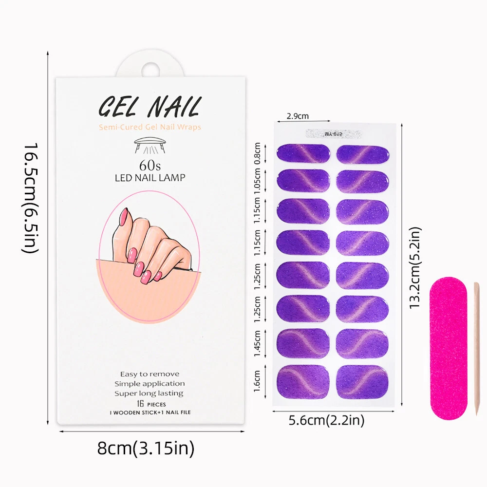 100% Brand New And High Quality Color:as the picture shows Package Size: 16.5*8cm Color: As Show Package Include: 16 Tips/Sheet Nail Stickers About this item 1、【Advantages】 REAL semi-cured gel nail polish wraps, with vast varieties of colors designs, will perfectly satisfy your daily fashion demand. Enjoy instant manicure from now on! 2、【Easy Application & Removal】 Very easy to put on , file down and cure by UV light in just a few minutes. Removal is also quite easy, peel them off by wood stick or fingers. 3、【Convenient & User-friendly】Want to have tailor-fit, instant salon-style manicures? Our gel nail kit is definitely a best choice. You will have great fun making instant manicure at home or office instead of nail salon. 4、【Toxin-Free & Long-lasting Material】 No more topcoat needed as it is already integrated into our gel nail wraps. No drying time. No damage to your nails. They can last up to 2 weeks when fully cured by UV light. 5、【What You Get】Package comes with 16 gel nail stickers,Please feel free to contact us if you have any questions. Your happy shopping experience is our top priority. HOW TO USE: 1. Smooth your nails with the nail file and clean your nails with cotton pads. 2. Choose the right size that fits your nails, peel off the protective films of the Gel Nail. 3. Place on the fingernails gently. 4. Use a small wood stick to press and flatten the edges of the nails. 5. Use scissors to cut off the excess gel nails, and then file the perfect shape with a nail file. 6. Cure the gel nails under UV/LED light. 7. Smooth the edges with a nail file. 8. Done! How To Remove: 1.Use the wood stick to lift gel nail wraps off your nails. 2.Clean your nails with cotton pads. ATTENTION: 1: Please use it immediately after opening it. 2: Please keep it in a film container after use, and use a sealing strip to avoid drying out. 3: Please keep it away from young children, and avoid eating by mistake. 4: Do not use it when your skin has a cut. 5: The colors may exist slight differences due to different screens. STORAGE: Please store in dark, cool and dry place to avoid hardening due to the light. Note: Please do not touch water within 2hours.