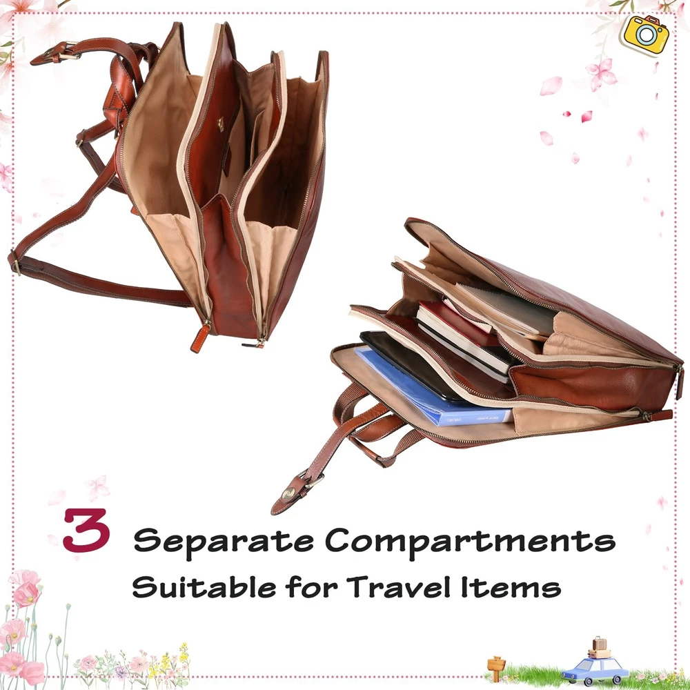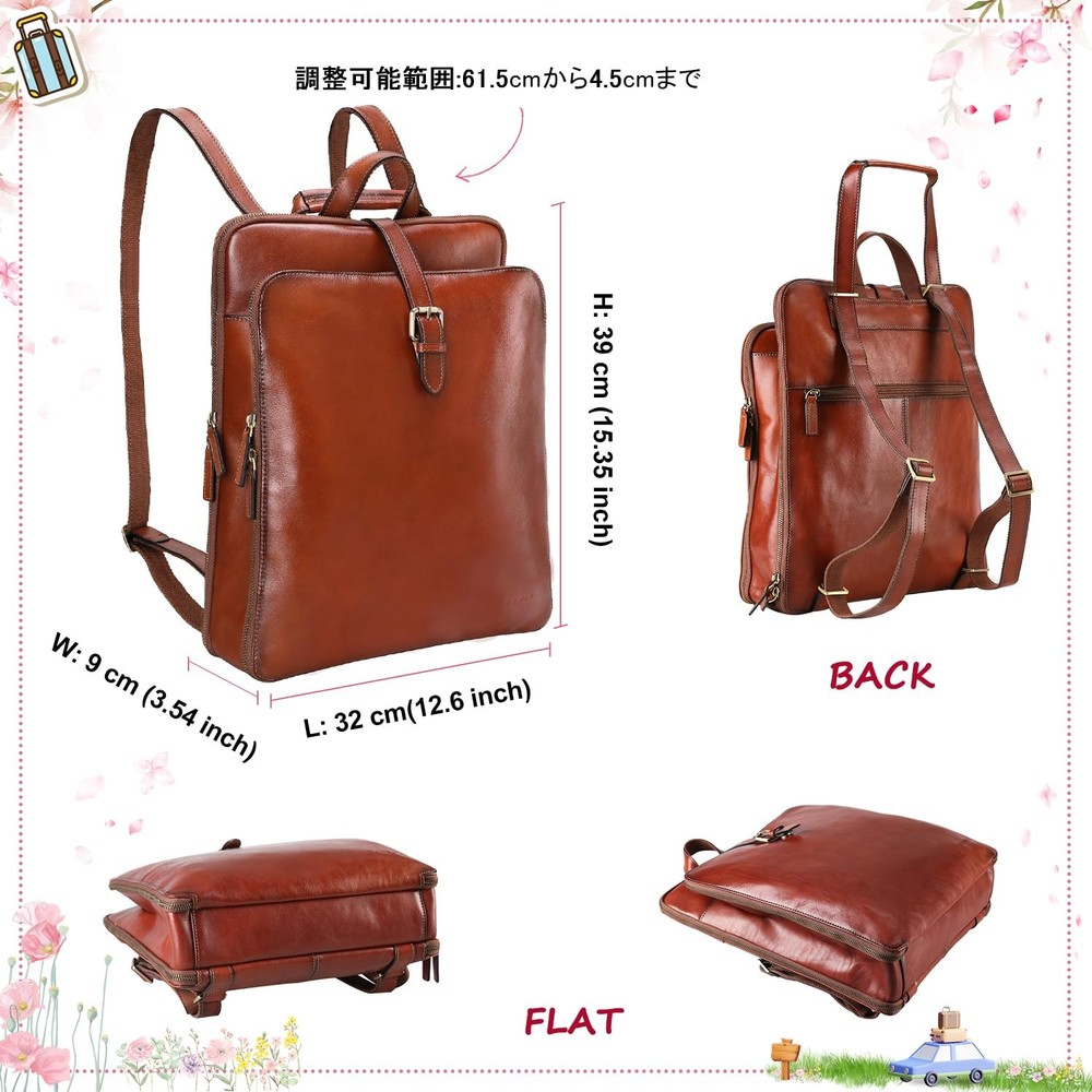 Full Grain Italian Leather Backpack for Women: It is a backpack purse made of full grain vegetable tanned leather imported from Italy,,rust-proof zinc alloy hardware and durable polycotton twill lining. Please note this leather backpack purse for women has unique Sfumato leather craft and wear-resistant edge paint to create a stylish vintage look. Portable Convertible Backpack Purse for Women: It can be easily convered from a backpack purse to a shoulder bag or a sling bag via an adjustable strap. Besides, it has a portable comfortable handle. So, It is very convenient for multiple occassion like travel,gathering, dating,party,shopping,etc. It can be used as travel backpack for women, laptop backpack for women and backpack purse for women. Leather Laptop Backpack for Women: 3 compartments are designed for this backpack purse.It can hold the items such as 14 inch laptop,cell-phone,wallet,key,cosmetics,etc.Besides,the U-zip closure creates easy open and close for this women's laptop backpack. Luggage Strap in rear zipper pocket can attach this women's backpack purse onto a rolling luggage for travel.The shoulder strap on the back is adjustable according to your height. Full Grain Italian Leather Backpack for Women:It is a backpack purse made of natural full grain leather from Italy.The leather is tanned by natural vegetable tanning and hand-dyed by natural dyes in order to greatly keep natural texture of visible grains,pores,wrinkles,etc.So, it is Non-Toxic and Friendly for enviroment.This leather has the good hand feel,glossiness,breathability and durabilility. The more leather backpack purse for women is used, the more glossy and more retro it becomes. Portable Convertible Backpack Purse for Women: It can be easily convered from a backpack purse to a shoulder bag or a sling bag via an adjustable strap. Besides, it has a portable comfortable handle. So, It is very convenient for multiple occassion like travel,gathering, dating,party,shopping,etc. It can be used as travel backpack for women, laptop backpack for women and backpack purse for women. Leather Laptop Backpack for Women: 3 compartments are designed for this backpack purse.It can hold the items such as 14 inch laptop,cell-phone,wallet,key,cosmetics,etc.Besides,the U-zip closure creates easy open and close for this women's laptop backpack. Luggage Strap in rear zipper pocket can attach this women's backpack purse onto a rolling luggage for travel.The shoulder strap on the back is adjustable according to your height. A Perfect Choice for Gift: As a women's backpack purse, it can be as a gift to mom,wife,daughter,girl-friend and friends on Birthday,Anniversary,Valentine's Day,Mother's Day,Thanksgiving Day and Christmas Day,New Year's Day,etc. Size: 12.60 x 3.54 x 15.35 Inch(32 x 9 x 39 cm);Net Weight: 1.18 kg