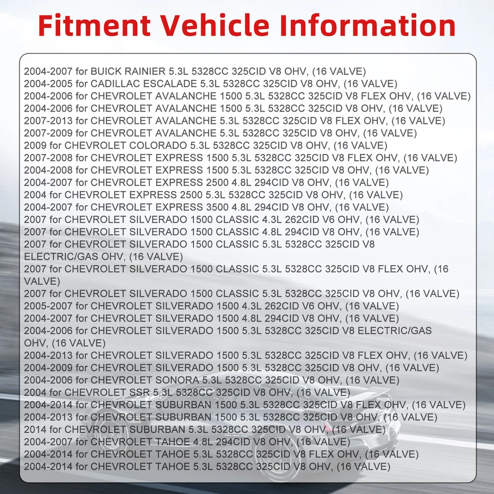 Product Description Full Head Gasket Kit For Chevry Tahoe Suburban GMC Yukon Buick Rainier 4.8L 5.3L Part number: HS26191PT, HS26191PT-1, HS26190PT-2 10198982 CS9284 Fits Following Models: 2004-2007 for BUICK RAINIER 5.3L 5328CC 325CID V8 OHV, (16 VALVE) 2004-2005 for CADILLAC ESCALADE 5.3L 5328CC 325CID V8 OHV, (16 VALVE) 2004-2006 for CHEVROLET AVALANCHE 1500 5.3L 5328CC 325CID V8 FLEX OHV, (16 VALVE) 2004-2006 for CHEVROLET AVALANCHE 1500 5.3L 5328CC 325CID V8 OHV, (16 VALVE) 2007-2013 for CHEVROLET AVALANCHE 5.3L 5328CC 325CID V8 FLEX OHV, (16 VALVE) 2007-2009 for CHEVROLET AVALANCHE 5.3L 5328CC 325CID V8 OHV, (16 VALVE) 2009 for CHEVROLET COLORADO 5.3L 5328CC 325CID V8 OHV, (16 VALVE) 2007-2008 for CHEVROLET EXPRESS 1500 5.3L 5328CC 325CID V8 FLEX OHV, (16 VALVE) 2004-2008 for CHEVROLET EXPRESS 1500 5.3L 5328CC 325CID V8 OHV, (16 VALVE) 2004-2007 for CHEVROLET EXPRESS 2500 4.8L 294CID V8 OHV, (16 VALVE) 2004 for CHEVROLET EXPRESS 2500 5.3L 5328CC 325CID V8 OHV, (16 VALVE) 2004-2007 for CHEVROLET EXPRESS 3500 4.8L 294CID V8 OHV, (16 VALVE) 2007 for CHEVROLET SILVERADO 1500 CLASSIC 4.3L 262CID V6 OHV, (16 VALVE) 2007 for CHEVROLET SILVERADO 1500 CLASSIC 4.8L 294CID V8 OHV, (16 VALVE) 2007 for CHEVROLET SILVERADO 1500 CLASSIC 5.3L 5328CC 325CID V8 ELECTRIC/GAS OHV, (16 VALVE) 2007 for CHEVROLET SILVERADO 1500 CLASSIC 5.3L 5328CC 325CID V8 FLEX OHV, (16 VALVE) 2007 for CHEVROLET SILVERADO 1500 CLASSIC 5.3L 5328CC 325CID V8 OHV, (16 VALVE) 2005-2007 for CHEVROLET SILVERADO 1500 4.3L 262CID V6 OHV, (16 VALVE) 2004-2007 for CHEVROLET SILVERADO 1500 4.8L 294CID V8 OHV, (16 VALVE) 2004-2006 for CHEVROLET SILVERADO 1500 5.3L 5328CC 325CID V8 ELECTRIC/GAS OHV, (16 VALVE) 2004-2013 for CHEVROLET SILVERADO 1500 5.3L 5328CC 325CID V8 FLEX OHV, (16 VALVE) 2004-2009 for CHEVROLET SILVERADO 1500 5.3L 5328CC 325CID V8 OHV, (16 VALVE) 2004-2006 for CHEVROLET SONORA 5.3L 5328CC 325CID V8 OHV, (16 VALVE) 2004 for CHEVROLET SSR 5.3L 5328CC 325CID V8 OHV, (16 VALVE) 2004-2014 for CHEVROLET SUBURBAN 1500 5.3L 5328CC 325CID V8 FLEX OHV, (16 VALVE) 2004-2013 for CHEVROLET SUBURBAN 1500 5.3L 5328CC 325CID V8 OHV, (16 VALVE) 2014 for CHEVROLET SUBURBAN 5.3L 5328CC 325CID V8 OHV, (16 VALVE) 2004-2007 for CHEVROLET TAHOE 4.8L 294CID V8 OHV, (16 VALVE) 2004-2014 for CHEVROLET TAHOE 5.3L 5328CC 325CID V8 FLEX OHV, (16 VALVE) 2004-2014 for CHEVROLET TAHOE 5.3L 5328CC 325CID V8 OHV, (16 VALVE) 2004-2006 for CHEVROLET TRAILBLAZER EXT 5.3L 5328CC 325CID V8 OHV, (16 VALVE) 2006-2008 for CHEVROLET TRAILBLAZER 5.3L 5328CC 325CID V8 OHV, (16 VALVE) 2009 for GMC CANYON 5.3L 5328CC 325CID V8 OHV, (16 VALVE) 2004-2006 for GMC ENVOY XL 5.3L 5328CC 325CID V8 OHV, (16 VALVE) 2004-2005 for GMC ENVOY XUV 5.3L 5328CC 325CID V8 OHV, (16 VALVE) 2005-2009 for GMC ENVOY 5.3L 5328CC 325CID V8 OHV, (16 VALVE) 2008 for GMC SAVANA 1500 5.3L 5328CC 325CID V8 FLEX OHV, (16 VALVE) 2008 for GMC SAVANA 1500 5.3L 5328CC 325CID V8 OHV, (16 VALVE) 2004-2007 for GMC SAVANA 2500 4.8L 294CID V8 OHV, (16 VALVE) 2004-2005 for GMC SAVANA 2500 5.3L 5328CC 325CID V8 OHV, (16 VALVE) 2004-2007 for GMC SAVANA 3500 4.8L 294CID V8 OHV, (16 VALVE) 2007 for GMC SIERRA 1500 CLASSIC 4.3L 262CID V6 OHV, (16 VALVE) 2007 for GMC SIERRA 1500 CLASSIC 4.8L 294CID V8 OHV, (16 VALVE) 2007 for GMC SIERRA 1500 CLASSIC 5.3L 5328CC 325CID V8 ELECTRIC/GAS OHV, (16 VALVE) 2007 for GMC SIERRA 1500 CLASSIC 5.3L 5328CC 325CID V8 FLEX OHV, (16 VALVE) 2007 for GMC SIERRA 1500 CLASSIC 5.3L 5328CC 325CID V8 OHV, (16 VALVE) 2005-2007 for GMC SIERRA 1500 4.3L 262CID V6 OHV, (16 VALVE) 2004-2007 for GMC SIERRA 1500 4.8L 294CID V8 OHV, (16 VALVE) 2005-2006 for GMC SIERRA 1500 5.3L 5328CC 325CID V8 ELECTRIC/GAS OHV, (16 VALVE) 2004-2013 for GMC SIERRA 1500 5.3L 5328CC 325CID V8 FLEX OHV, (16 VALVE) 2004-2009 for GMC SIERRA 1500 5.3L 5328CC 325CID V8 OHV, (16 VALVE) 2007 for GMC SIERRA 1500 6.2L 6162CC 376CID V8 OHV, (16 VALVE) 2008-2013 for GMC SIERRA 5.3L 5328CC 325CID V8 OHV, (16 VALVE) 2004-2014 for GMC YUKON XL 1500 5.3L 5328CC 325CID V8 FLEX OHV, (16 VALVE) 2004-2009 for GMC YUKON XL 1500 5.3L 5328CC 325CID V8 OHV, (16 VALVE) 2008-2014 for GMC YUKON 5.3L 5328CC 325CID V8 FLEX OHV, (16 VALVE) 2008-2010 for GMC YUKON 5.3L 5328CC 325CID V8 OHV, (16 VALVE) 2008-2009 for HUMMER H3 5.3L 5328CC 325CID V8 OHV, (16 VALVE) 2009 for HUMMER H3T 5.3L 5328CC 325CID V8 OHV, (16 VALVE) Package Included (As pictures showed) About Us Payment Shipping Contact Us We carry the most Auto Accessories for any cars, trucks, excavators. We are specialized in the research and development, design and manufacturing of replacement parts as OE standard. We can better fulfill customers' specifications and satisfy their changing needs. Your satisfaction is the most important thing to us. We accept all the payment methods supported by eBay. Please pay attention that import duties, taxes and charges are not included in the item price or shipping charges. These charges are the buyer's responsibility. All items will be shipped to your Order Address .Please update your latest address when you check out,and please make sure to provide us with correct,precise and detailed shipping address. All items will be shipped as soon as possible after the we receiving clear payment. We will work hard to make sure every customer 100 percent satisfied, and resolve any problem for you. If for some reason there is any issue with the purchase, please contact us through "My Messages" or "Ask Seller Questions", we are always here to serve. About Us We carry the most Auto Accessories for any cars, trucks, excavators. We are specialized in the research and development, design and manufacturing of replacement parts as OE standard. We can better fulfill customers' specifications and satisfy their changing needs. Your satisfaction is the most important thing to us. Payment We accept all the payment methods supported by eBay. Please pay attention that import duties, taxes and charges are not included in the item price or shipping charges. These c
