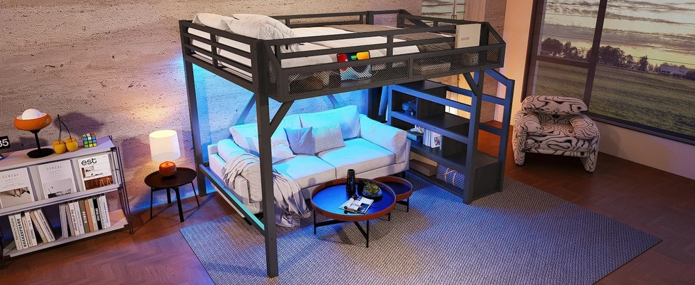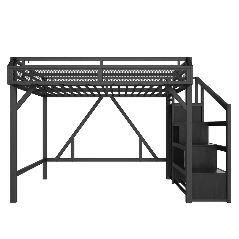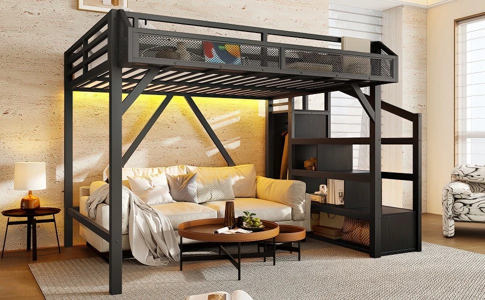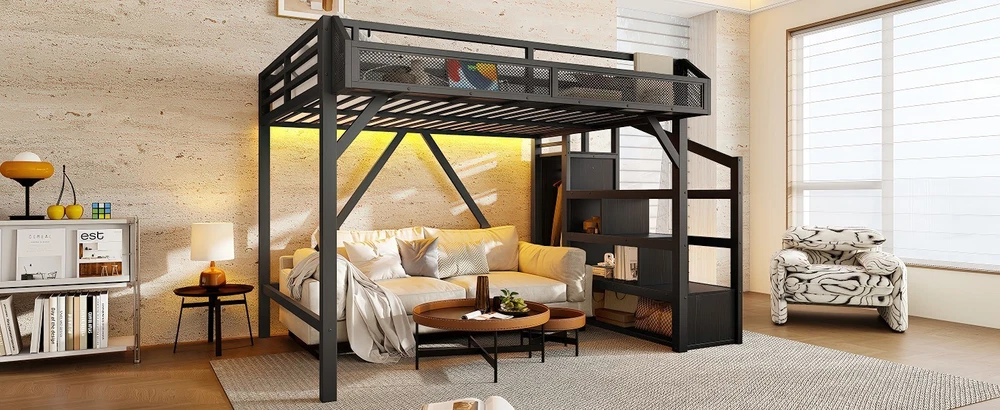 Full Loft Bed Metal Loft Bed Frame w/ Storage Stair,Shelves & Wardrobe Black Features 【Maximized Storage with Built-in Wardrobe & Shelves】This full loft bed with storage is designed for organization and function. It includes a built-in wardrobe, open shelving, and storage stairs — perfect for storing clothes, books, toys, or essentials while saving space in your bedroom. 【Convenient USB Ports & LED Light Strip Included】More than just a bed — this metal loft bed features built-in USB ports and LED lighting, making it ideal for late-night reading, studying, or charging devices without leaving your bed. A great choice for teens, students, or dorm living. 【Safe Climb Design with Full-Length Guardrails】Stay secure with full-length guardrails on the top bunk and sturdy stairs that double as storage. This loft bed with stairs offers both safe access and added functionality, giving you peace of mind for older kids or young adults. 【Sturdy Metal Frame with Noise-Reducing Structure】Crafted with a heavy-duty metal frame, this full loft bed is reinforced with premium hardware for durability and stability. Special noise-reducing connectors help minimize squeaking, offering a smoother, quieter sleeping experience. 【Easy Assembly with Complete Kit Included】This space-saving loft bed includes all necessary tools and a detailed illustrated manual for hassle-free setup. Whether you’re a DIY beginner or experienced, you can assemble it confidently and quickly without professional help. Descriptions Description Upgrade your bedroom with this all-in-one Full Loft Bed with Storage and Built-in Features, designed to maximize space while offering convenience, safety, and style. Ideal for teens, students, or anyone in need of vertical storage, this space-saving loft bed turns your sleeping area into a multifunctional living solution. Built with a durable metal frame, this loft bed features a smart layout that includes storage stairs, open shelves, and a built-in wardrobe — perfect for organizing clothes, books, toys, and essentials without taking up extra room. It’s a complete storage solution built right into your bed. Designed for modern living, the bed comes equipped with USB charging ports and LED strip lighting, making it easy to charge your devices or read at night without needing extra furniture or cords. Convenience and style come together in one streamlined setup. Weight & Dimensions Product Type Metal Loft Bed Color Black Woodgrain Size Full Material Metal+MDF Overall Product Dimension 90.94”L*56.7’’W*63.4”H Overall Product Weight 153.22 LBS Weight Capacity 350LBS Recommend Mattress Thickness 6'' Number of Package 2 Package Dimension & Weight Please refer to the Specification Level of Assembly Full Assembly Needed Eligible for Hardware Packs Yes Country of Origin China Note All the pictures are taken by actual samples, slight chromatic aberration may occur due to lighting or display.