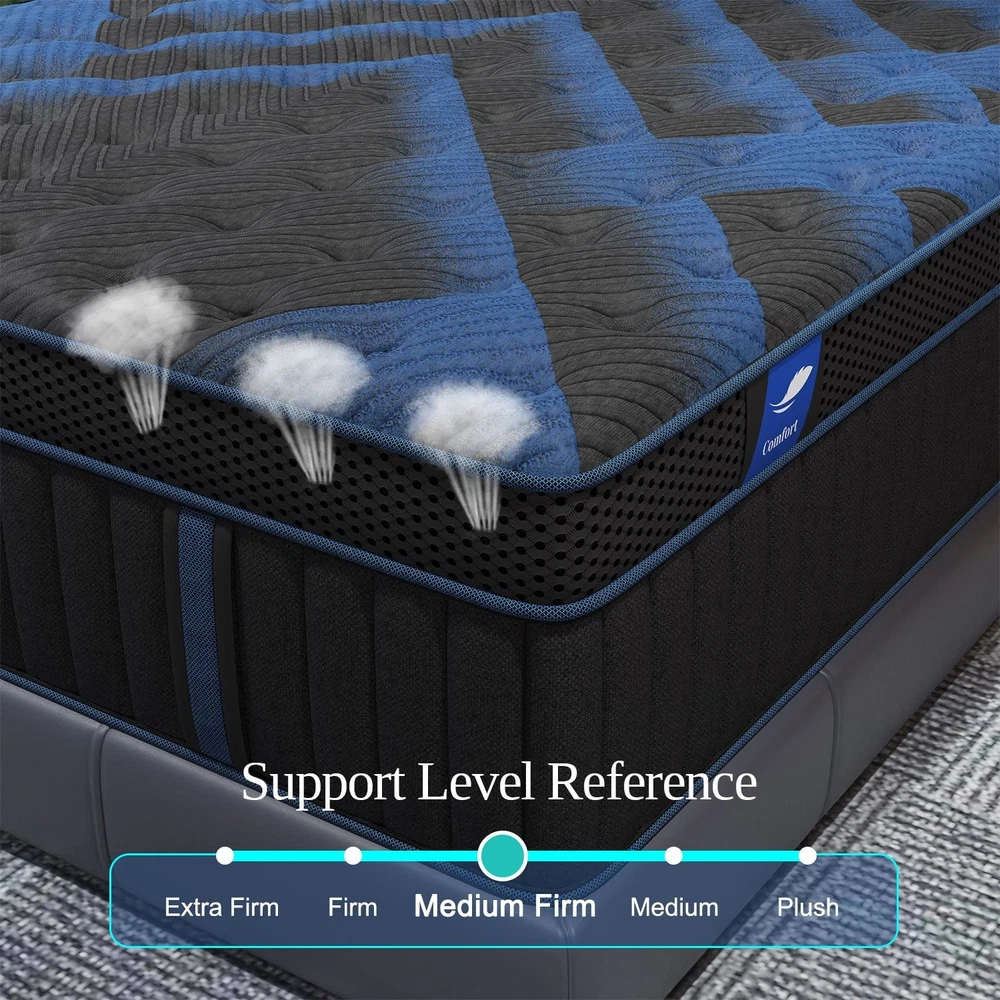 Experience Unmatched Comfort with Hybrid Mattress Our hybrid mattress combines the best of both worlds - the contouring comfort of gel-infused memory foam and the responsive support of individually wrapped coils. Engineered for sleepers who want pressure relief without the "sinking" feeling of all-foam beds. Why Choose ? Dual-Layer Cooling System: Top layer of copper-infused gel foam draws heat away from your body, while breathable cover enhances airflow Zoned Support Coils: Reinforced edge support prevents roll-off and extends usable sleep surface by 15% compared to standard mattresses Noise-Free Design: Individually pocketed coils eliminate partner disturbance - perfect for light sleepers Easy Maintenance: Removable, machine-washable cover simplifies cleaning Complete Package Includes: 1× Hybrid Mattress (compressed in box) 1× Care Instructions 1× Warranty Registration Card *Note: Allow 48-72 hours for mattress to fully expand. Minor odor is normal and will dissipate within 24 hours.* CertiPUR-US Certified Safety & Comfort : Rest easy on foam that meets rigorous health standards. Every layer of our full mattress is CertiPUR-US certified, guaranteeing zero ozone depleters, heavy metals, or formaldehyde. The ultra-low VOC foam ensures fresh air quality from the first night, with 97% odor dissipation within 24 hours of unboxing. 7-Zone Orthopedic Support System : Engineered with medical-grade precision, our zonal support design of full mattress features varying coil densities at shoulders (softer), lumbar (firmer), and legs (medium) to maintain spinal alignment. Lab tests show 28% better pressure distribution compared to standard hybrid mattresses, reducing morning back pain by up to 72%. Dynamic Cooling Ecosystem: Triple-action cooling technology combines: (1) 3D airflow fabric cover (2) Open-cell copper-infused memory foam (3) Channeled airflow base layer. Sleeps 4°F cooler than traditional hybrids, with moisture-wicking performance tested to remove 83% of nighttime perspiration. Precision-Engineered Pocket Springs: 1,286 individually wrapped coils (15-gauge steel) work like micro-shock absorbers, each responding independently to body contours. The dual-layer design features 2" adaptive comfort foam + 8" reinforced support base, providing cradle-soft surface feel with zero motion transfer (<0.5 Nm disturbance). Smart Motion Isolation 2.0: NASA-inspired spring technology reduces partner disturbance by 90%. Dynamic response coils instantly adapt to movement - whether changing sleep positions (response time <0.3 sec) or getting in/out of bed, ensuring uninterrupted sleep cycles. Ideal for couples with different schedules.