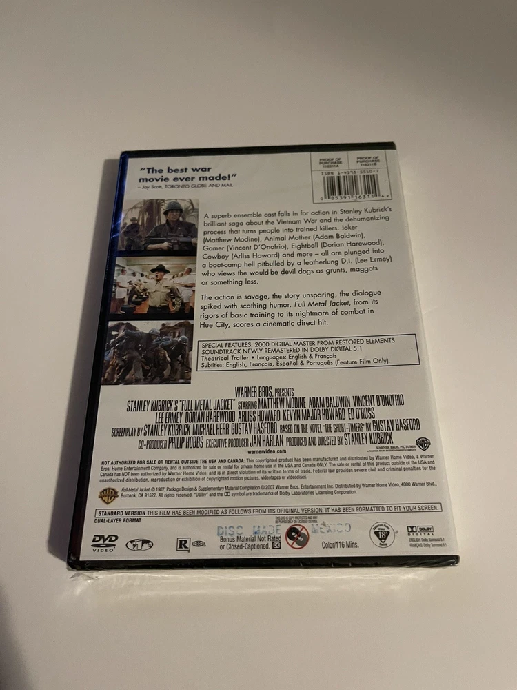 This Stanley Kubrick Collection DVD features the classic 1987 war film "Full Metal Jacket" starring Matthew Modine. The DVD is in NTSC video format and comes in a tall/DVD case with subtitles available. It is rated PG and has a run time of 116 minutes. The edition is a standard edition and was released in 2007 by Warner Home Video. The movie is in English language and has a region code of DVD: 1 (US, Canada...). This item is perfect for collectors and fans of action and adventure films.