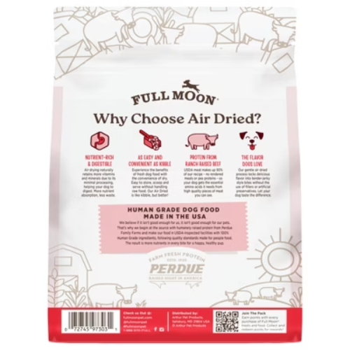 Important Note for Our Valued Customers: To offer you the best prices with free shipping, we occasionally experience shipping delays. If this happens, we’ll notify you immediately, issue a full refund, and invite you to place a new order at your convenience. To keep costs low, we sometimes reuse branded packaging boxes for shipments—we appreciate your understanding if you receive your order in repurposed packaging. Rest assured, all products we sell are 100% brand new, unopened, and freshly manufactured, including pet food and human-grade items, with a minimum 8-month shelf life remaining. If any issues arise, please contact us first—we’re committed to resolving them quickly. If you’re not completely satisfied, we offer a full refund with no hassle. Thank you for your trust and support! Description FULL MOON started with a mission to feed your dog the same nourishing ingredients you’d feed yourself. We believe if it isn’t good enough for us, it isn’t good enough for our pets. That’s why we begin at the source with humanely raised protein from Perdue Family Farms and make our food in USDA-inspected facilities with 100% Human Grade ingredients, following quality standards made for people food. The result is more nutrients in every bite for a happy, healthy pup. What makes our food special? Nutrient-rich & digestible: Air drying naturally retains more vitamins and minerals due to its minimal processing, helping your dog to digest. More nutrient absorption, less waste. As easy and convenient as kibble: Experience the benefits of fresh dog food with the convenience of dry. Easy to store, scoop and serve without handling raw food. Our Air Dried is like kibble, but better! Protein from ranch raised beef: USDA meat makes up 90% of our recipe- no rendered meals or pea proteins – so your dog gets the essential amino acids it needs from high quality pieces of meat you can see. The flavor dogs love: Our air dried process locks delicious flavor into tender-jerky style bites without the use of fillers or artificial preservatives. Let you dog taste the difference. highlights Complete and balanced for adult dogs; nutrient-rich & digestible As easy and convenient as kibble USDA meat and ingredients sourced responsibly from family farms in the USA The flavor dogs love without the use of fillers or artificial preservatives Minimally processed for maximum nutrient retention Amount : % Daily Value* Crude Protein (Min) 31% Crude Fat (Min) 29% Crude Fiber (Max) 2% Moisture (Max) 16% * Percentage of Daily Values are based on a 2,000 calorie diet. Ingredients: beef, pork, turkey, turkey liver, apple pomace, sunflower oil, dicalcium phosphate, salt, citric acid (a preservative), dipotassium phosphate, calcium carbonate, magnesium gluconate, green tea extract, fish oil powder, zinc proteinate, copper proteinate, vitamin e supplement, manganese proteinate, vitamin d3 supplement, potassium lodide, thiamine hydrochloride