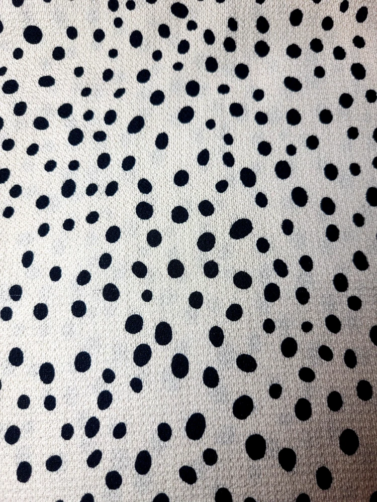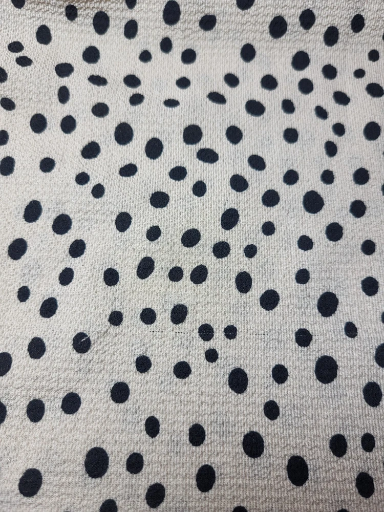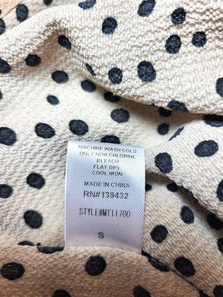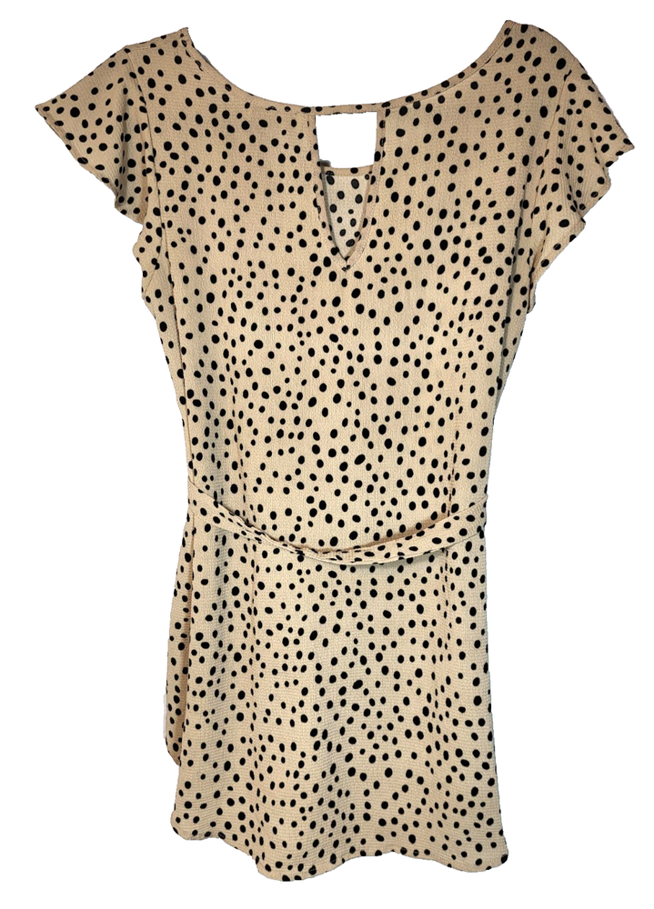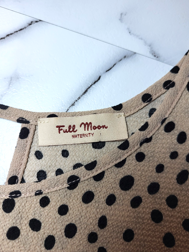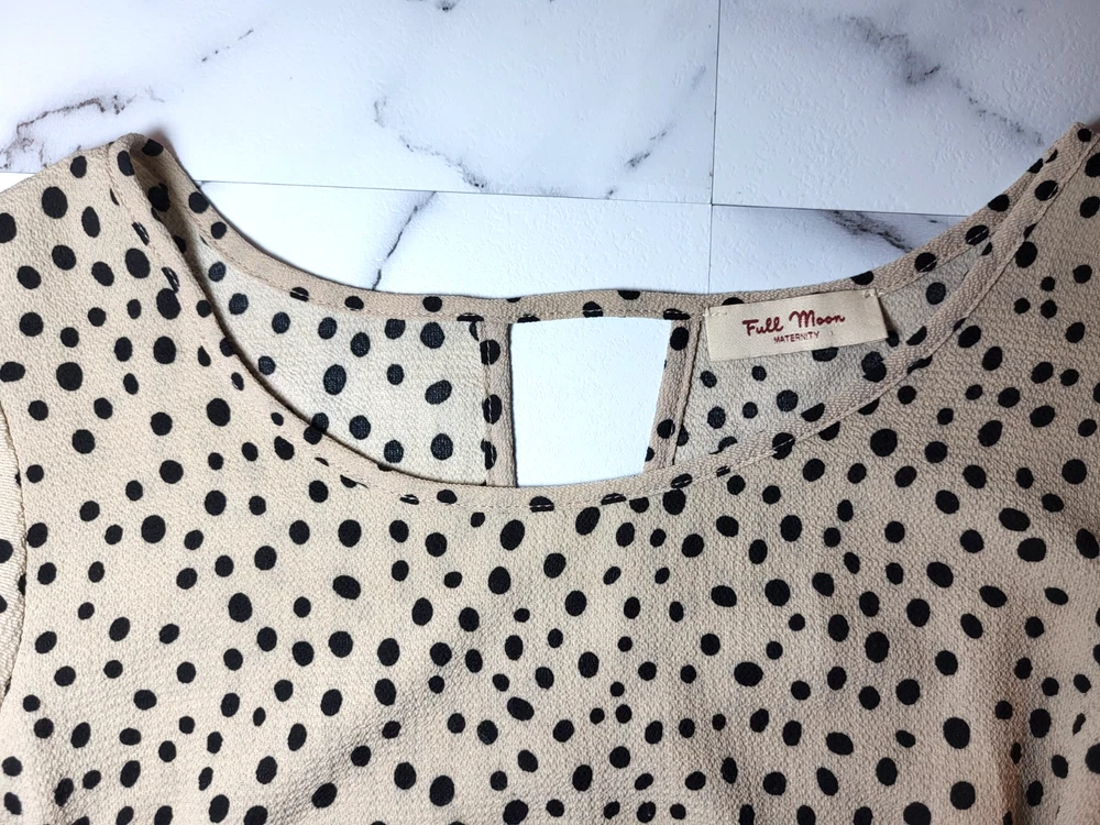 Full Moon Maternity Tan And Black Textured Polka Dot Tunic With Flutter Cap Sleeves, A Keyhole Back And Ties At The Waist. The Tie Is Not Attached To The Tunic. Size Small Measurements: Sleeve Length 3 1/2" Armpit to Armpit 19" Length 28"