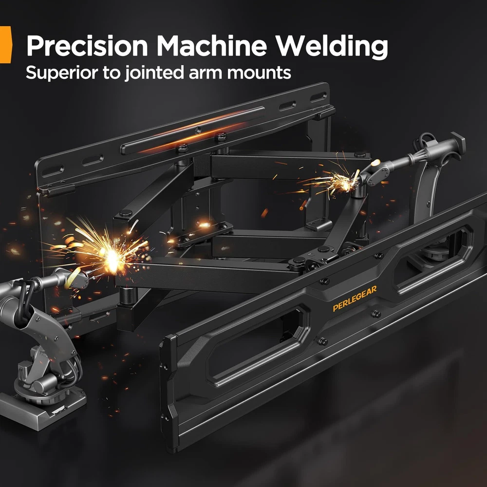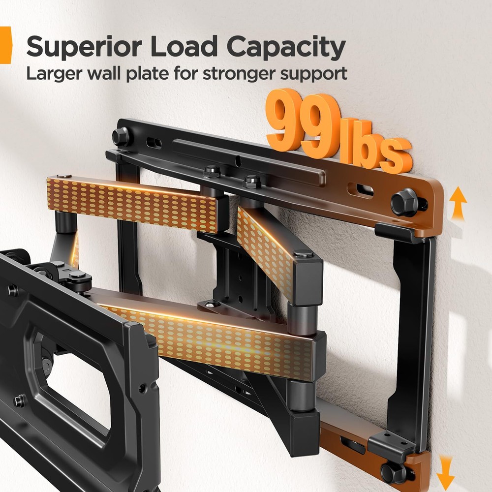 Full Motion TV Mount Compatibility - Our articulating tv mount Fits most 26"-65" flat curved LCD LED QLED OLED 4K TVs weighing up to 99lbs. VESA 100x100 to 400x400mm. Please check the VESA pattern, weight, size of your TV before purchasing. Upgrade Your Viewing: Our 26-65 inch TV wall mount tilts -15°/+5°, swivels +/-45° (max swivel angle depends on TV size) and level adjusts +/-3° for maximum viewing flexibility. Easily customize your TV watching experience to find the most comfortable and healthiest viewing position.The strong articulating arm provides a smooth 15.2" extension and retract back to 3.2" for saving space. Height Adjustable TV Brackets for 65 inch TVs: With 3 levels height setting design, you can adjust the height of the TV after this tv wall mount is installed, so you can get the most comfortable viewing position and better viewing experience. Fast and Easy Installation - Comes with all the required mounting hardware needed, a detailed English graphical installation guide and video that is actually useful which helps you to install this TV wall mount without any hassle. This tv mount can be mounted on brick wall, concrete wall and 12"16" wood studs. Quick-respond Customer Service - Whatever questions you have, please feel free to contact us. We are always providing professional customer service before and after sales with quick response.