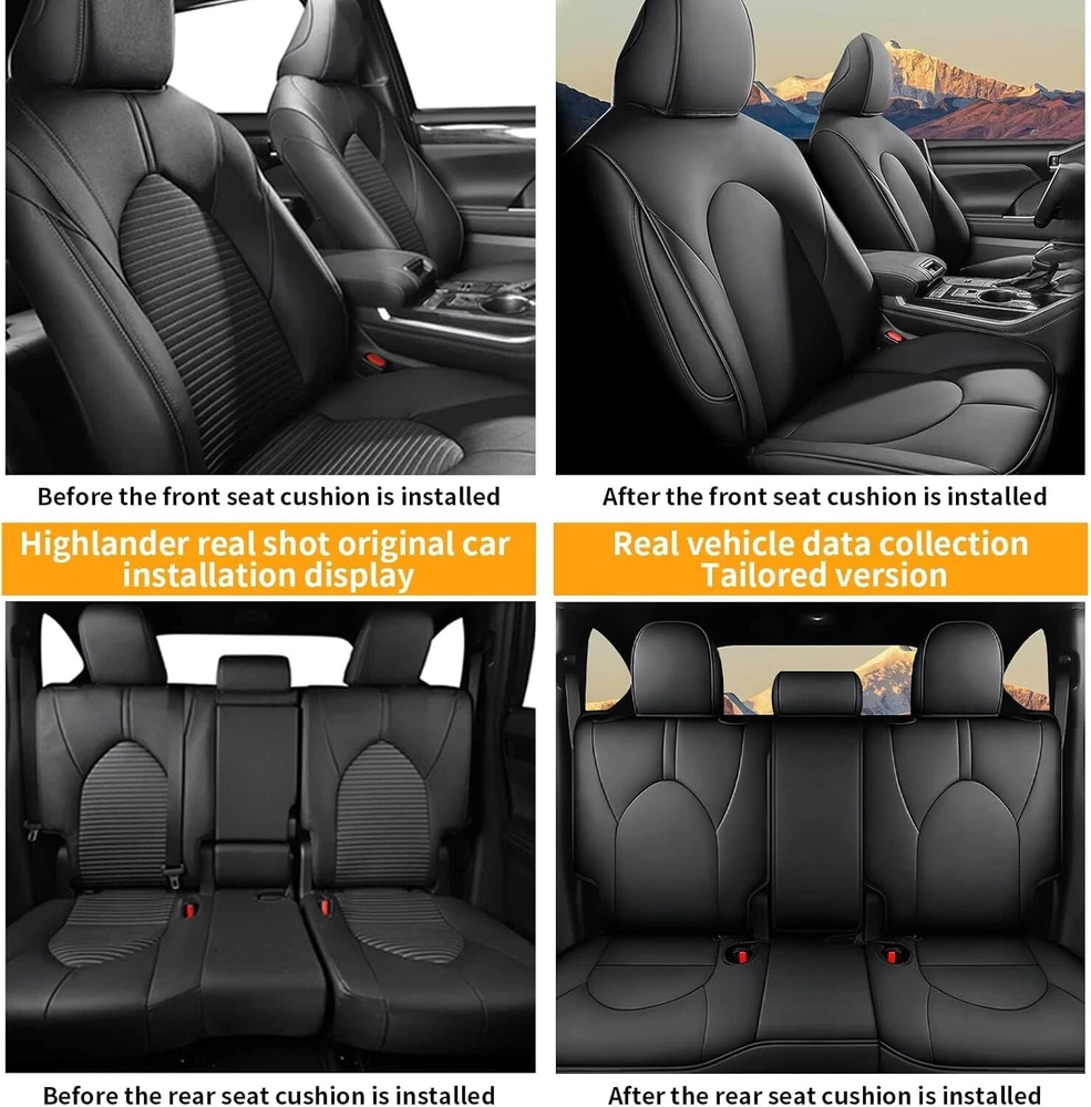 Product Description Car 5 Seat Covers ForToyota Highlander 2020-2024 Black 40/60 Split Front And Rear Cushions(Excluding center console armrest pad) Please note that the car list NOT 100% correct!!Most Front Seats will perfectly fit.but Rear one will not.please check your back seat carefully before you place order.thank you!! About this item:The picture is for reference only, the product will be shipped according to your specific model!After placing the order, please send us an email to inform us of the specific model and seat picture! Easy to clean: Wipe clean easily with just a damp towel, keeping your seat protects from stains, spills and damage. Easy to install: The package comes with an installation manual, please read it before you start the installation and you will be able to do it easily even if it is your first time. Safety: The front seats have airbag reserve ports on the side to ensure that the airbags can be popped out in case of emergency. The rear seat belt slot also completely exposed. Material: Premium faux leather is durable, breathable, comfortable and has good waterproof. The interior of the seat cover is filled with sponge, the appropriate thickness allows you to sit for a long time without getting tired. Product included: 2PCS front seat covers 2PCS 2 ROW seat covers 1 Set of rear seat covers 8* Head cap 1*Parts required for installation in one bag 1*Install Guide About Us Shipping Returns Contact Us Feedback: We are a professional supplier of automotive accessories, with a variety of seat covers,floor mats, steering wheel decal decorative Sticker and other products. If you need more car interiors, please enter our store to find more products you need. Or you have any problem, please feel free to contact with us!Thank you!