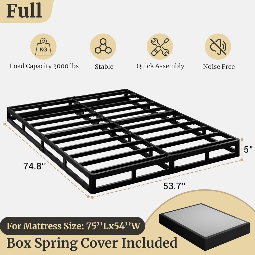 **About this item** * **Sleek 5-Inch Profile:** This 5-inch full-size box spring is ideal for those who prefer a lower bed height or are pairing it with a thicker mattress. Compatible with innerspring, memory foam, and latex mattresses. Rounded corners help reduce the risk of accidental bumps or injuries. * **Noiseless and Comfortable:** Each pole and support frame is fully welded at both ends to prevent movement, distortion, and squeaking. The solid, noise-free structure ensures peaceful and uninterrupted sleep, even with frequent movement. * **Heavy-Duty Metal Construction:** Built with reinforced steel and durable metal slats, this full box spring supports up to 3,000 lbs. It delivers exceptional strength, stability, and long-lasting mattress support for single or shared use. * **Easy to Clean:** Features a high-quality fiber cover that is breathable, wrinkle-resistant, and shrink-resistant. Elastic bands allow for easy removal, making cleaning simple and helping maintain a fresh, hygienic sleeping environment. * **Easy to Assemble:** Designed for quick and hassle-free setup. All required tools are included, and the integrated construction allows assembly in minutes.