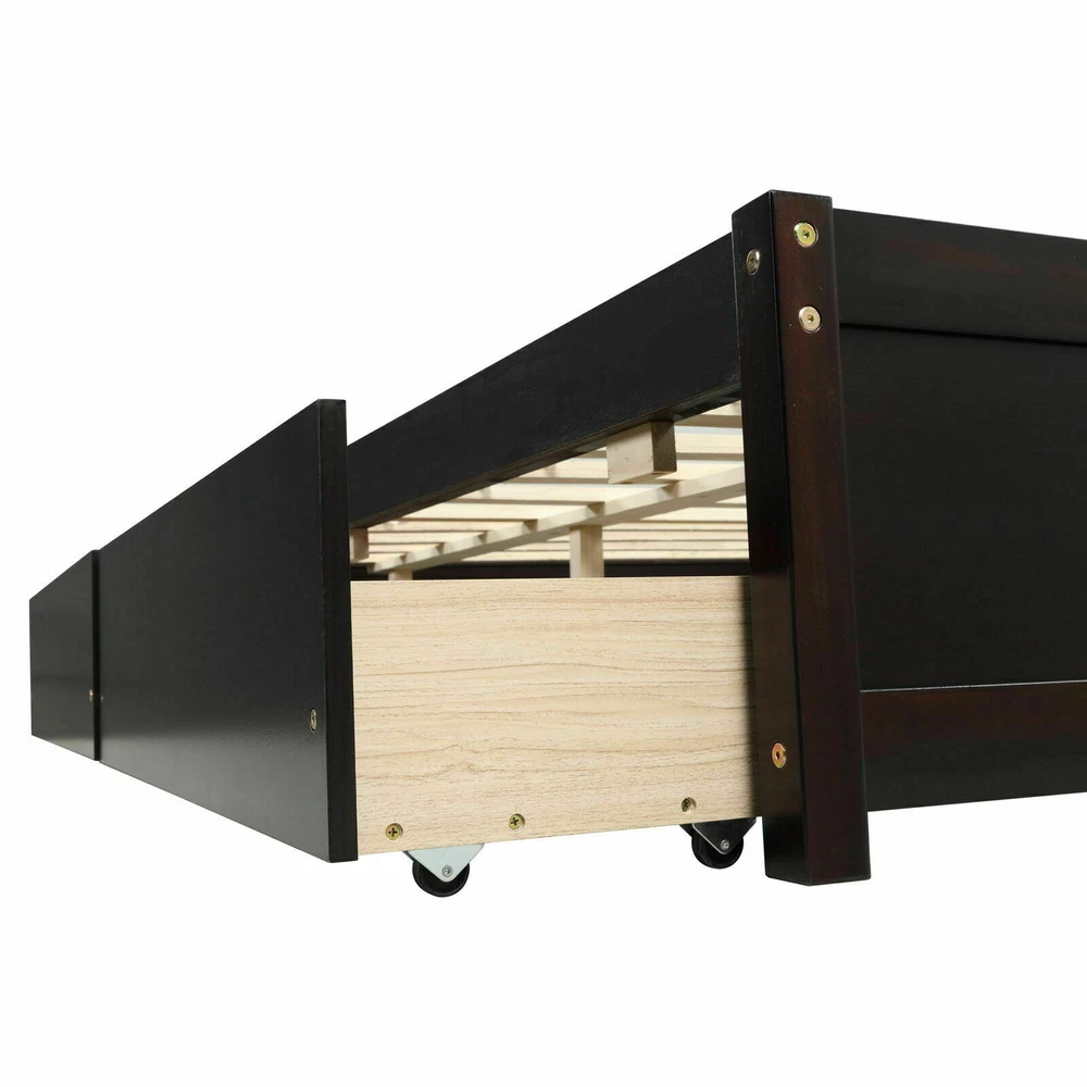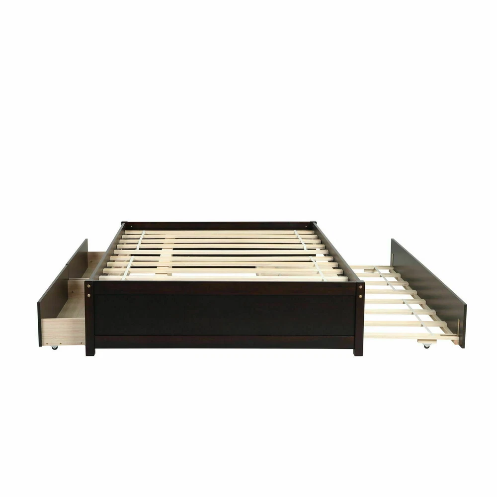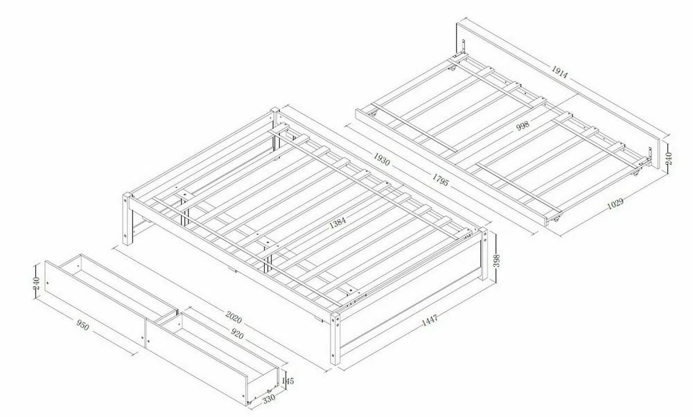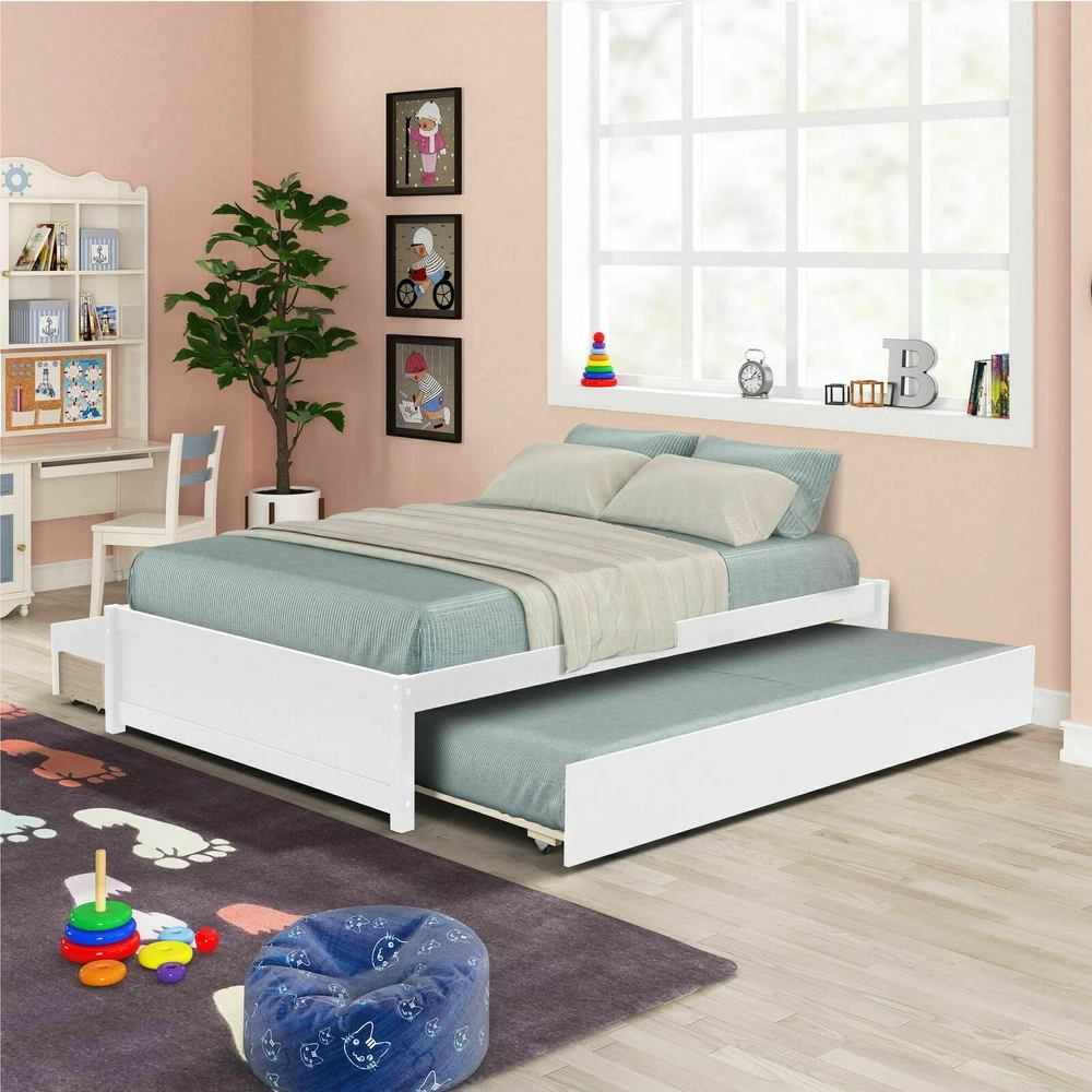 Full Size Bed Frame Platform Bed With Trundle Wood Bed w/ 2 Drawers Bedroom Description: 【Sturdy Construction】 This full daybed frame constructed from high quality solid pine wood and MDF for durability and strength,weight capacity of Upper bed 250 lbs,Trundle bed: 250 lbs.Heavy duty bed and trundle bed can holds toddlers, teens or adults safely. 【Simple Design】 The wooden daybed with 2 drawers is designed with simple and clean appearance, match with any kind of decor and ideal for boy's bedroom, girl's bedroom or any small living spaces. 【Space-Saving Platform bed】 A pull-out twin size trundle underneath full bed for space saving ,easy to pull in and out to serve as a guest bed when need be,ideal for small living spaces. 【Box Spring Not Required】The simple yet elegant wood frame is sturdy and comes with wood slats for extra support and ensures air moves freely around your mattress to keep it fresh for years to come. 【Easy Assembly】 Full Size bed overall dimension: 79.52" x 57" x 15.67" (LxWxH),with a clear assembly document that will guide you through all steps. Specification: Quality: Solid Pine wood bed frame. Durable Strong: High 250 lb. weight capacity per bed Space-saving: Bed measures 79.52 x 57 x 15.67 in. (LxWxH) Product Dimensions Assembled Length (in.): 79.52 Assembled Width (in.): 56.96 Assembled Height (in.): 15.67 Package Size Length (in.): 80.51 Width (in.): 13.39 Height (in.): 8.47 Weight (lbs.): 112.20