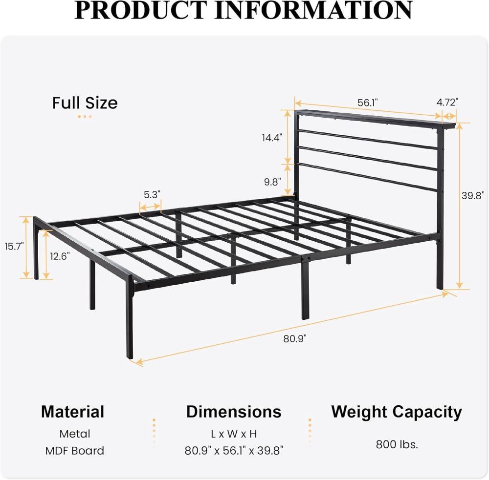 Full Size Bed Frame For 54x75 in Mattress Size Easy To Clean Durable Black Shelf Description About this item Practical Headboard Shelf: Widen shelf for keeping close to your essentials, it’s convenient to hold your phone, glasses, alarms, and other essentials. Say Goodbye to Noise: Slats embedded design with EVA sponge prevent the slats from friction and making noise. Provide you with a quiet sleeping environment. Ample Storage Space: The 12.6" height clearance of the frame allows for easy under-bed storage for your stuff and is also easy to clean. Easy Assembly: Everything you need is in one package, of course, including detailed instructions. It only takes 30 minutes to install this bed frame, even if you are a rookie. No Box Spring Needed: Reliable and closely spaced slats are designed to support and extend the life of your memory foam or spring mattress without the need for a box spring. Delivery We Do Not Ship Outside of the Continental US. Return Policy All items qualify for returns within 30 days of receipt. Buyer is responsible for return shipping on any item that is not damaged. Feedback We take our reputation seriously, we buy and sell online, so we understand the value of trust. If you are unsatisfied with your order, please contact us and we will work with you to resolve it to your satisfaction.