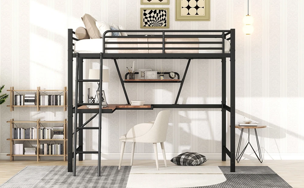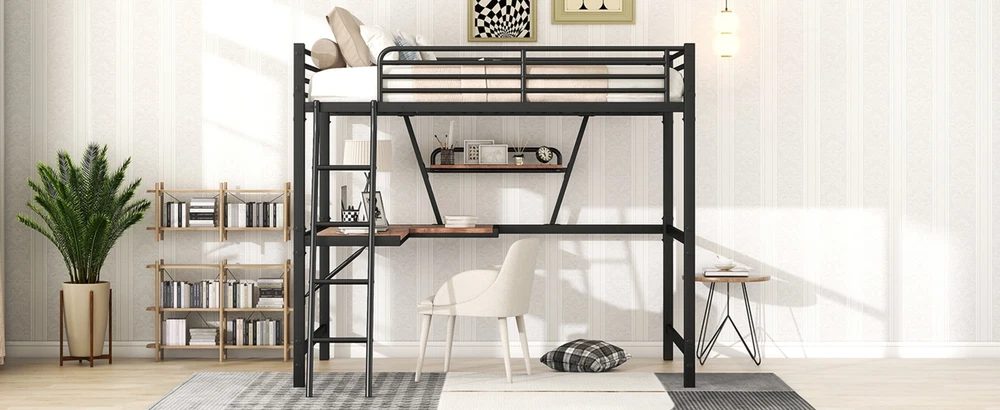You may like Metal Floor Bunk Bed, Twin XL over Queen, Black New $294.74 Free shipping & Free return Twin Size Rabbit-Shape Upholstered Princess Bed with Headboard & Footboard New $246.91 Free shipping & Free return Metal Floor Bunk Bed, Twin over Full,White(OLD SKU:MF193244AAK) New $278.27 Free shipping & Free return Twin Storage House Bed for kids with Bedside Table, Trundle, White New $260.28 Free shipping & Free return King Size Canopy Platform Bed with Headboard and Support Legs, Grey Wash New $354.36 Free shipping & Free return Ceres Metal Bed, Black with Walnut Wood Headboard&Footboard, Queen New $172.23 Free shipping & Free return Bed frame with charging station queen size,87.80'' L x 61.80'' W x 39.2'' H New $184.45 Free shipping & Free return Full Size Metal & Wood Platform Bed with Headboard & Footboard, White New $185.07 Free shipping & Free return Wood Daybed with Three Drawers ,Twin Size Daybed,No Box Spring Needed ,White New $368.15 Free shipping & Free return Twin Bed with Trundle,Bookcase,Grey New $296.31 Free shipping & Free return Platform Bed with Twin Size Trundle, Twin Size Frame, Espresso New $280.15 Free shipping & Free return Metal Full XL/Queen Bunk Bed for Teens & Adults - Space-Saving & Noise-Reduced New $373.31 Free shipping & Free return Modern White Solid Wood Full Platform Bed (old sku:WF283524AAK) New $265.38 Free shipping & Free return Modern White Solid Wood Full Platform Bed (old sku:WF283524AAK) New $265.38 Free shipping & Free return Metal Full XL/Queen Bunk Bed for Teens & Adults - Space-Saving & Noise-Reduced New $373.31 Free shipping & Free return Industrial Queen Bed Frame with LED Lights, 2 USB Ports, Storage - Full Size New $187.43 Free shipping & Free return Industrial Queen Bed Frame with LED Lights, 2 USB Ports, Storage - Full Size New $187.43 Free shipping & Free return Metal Twin XL over Queen Bunk Bed for Adults, Space-Saving & Noise-Reduced New $357.05 Free shipping & Free return Metal Twin XL over Queen Bunk Bed for Adults, Space-Saving & Noise-Reduced New $357.05 Free shipping & Free return Industrial Queen Bed Frame LED Lights, USB Ports, Storage, Noise-Reducing New $184.12 Free shipping & Free return Metal Floor Bunk Bed, Twin XL over Queen, Black New $294.74 Free shipping & Free return Twin Size Rabbit-Shape Upholstered Princess Bed with Headboard & Footboard New $246.91 Free shipping & Free return Metal Floor Bunk Bed, Twin over Full,White(OLD SKU:MF193244AAK) New $278.27 Free shipping & Free return Twin Storage House Bed for kids with Bedside Table, Trundle, White New $260.28 Free shipping & Free return King Size Canopy Platform Bed with Headboard and Support Legs, Grey Wash New $354.36 Free shipping & Free return Specification Product Information Bed Size: Full Main Color: Black Main Material: Metal Product Dimensions Item Length (in.): 78.00 Item Width (in.): 56.30 Item Height (in.): 70.90 Weight (lbs.): 113.00 Package Size Sub-item 1 Package Quantity:1 57.48 * 17.72 * 4.33 in 49.38 lbs Sub-item 2 Package Quantity:1 77.56 * 17.72 * 5.51 in 71.87 lbs Product Features [Sturdy Metal Frame] Strong metal frame that includes an integrated ladder, full-length guardrails and secured metal slats to ensure security and stability. [Built-in Desk and Shelf] This loft bed making full use of space, coming with a desk and shelf under bed, the bed creates a great personal workstation. [Safety for Kids] It comes with secured metal slats, the ladder attaches to the bed and top bed includes full-length guardrails for added safety. [Modern Style] Crafted of metal in a clean painted finish, this bed strikes a clean-lined silhouette with a horizontal slatted headboard and footboard, matching guard rail. [No Box Spring Needed] Due to the system of metal slats, no box spring is required – simply top with the standard mattress of your choice. Description Full Size Loft Metal&MDF Bed with Desk and Shelf, Black This metal loft bed provides a stylish and comfortable place for children to sleep and study. This modern loft bed includes a smart table top with shelf - perfect for home work, reading, writing, drawing and other activities. Full-length metal protective fencing on the upper bunk for added security. A matching fixed ladder provides safe and easy access to the upper block. Smooth, clean lines and a black powder-coat finish enhance the cool, contemporary style. This loft bed is the ideal way to maximize space in a child's or teen's room. Description Material Metal+MDF Size Full Color Black numbers of package 2 Spring box No need Assembly Required Yes Origin China Dimensions Overall Product Dimension 78''L x 56.3''W x 70.9''H Package Dimension Please refer to the Specification Loft Bed Dimension 75'' x 54'' Total height 70.9'' Number of Slats 21pcs Overall Product Weight 113lb Bed weight capability 400lb Recommend Bed Mattress Thickness 6''