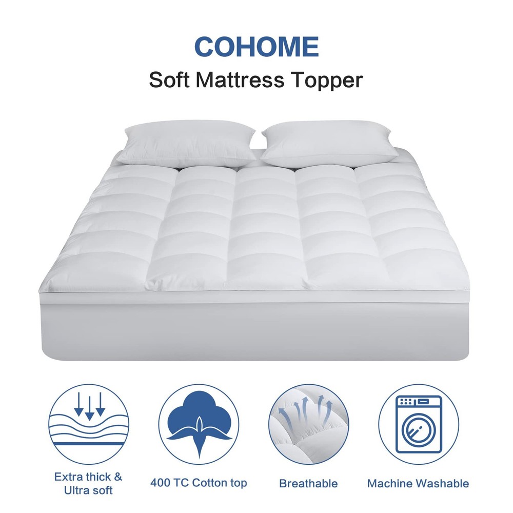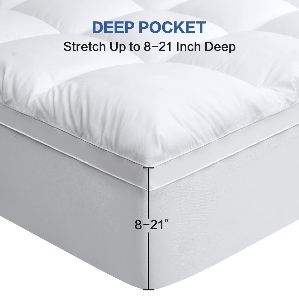 1.【Extra Thick & luxury Comfort】Overfilled with more supportive 3D snow down alternative fill will add extra thickness and super soft mattress topper. It provides better back pain 2.【Breathable & Soft】Cooling mattress topper adapt 400TC pure cotton fabric which is soft and breathable 3.【Super Elastic Deep Pockets】The elastic deep pockets tightly wrap the mattress (8-21").Even if it’s turned over and over on the bed which also can perfectly fit and stay on the mattress pad.There is no noise caused by movement 4.【Machine Wash&Durable】Mattress pad can be thrown directly into the washing machine and will be clean and fluffy after washing and drying. (Leave it in the sun for a few hours and pat it lightly for the best experience) 5.【Customer Satisfaction】aims to provide satisfying after-sale service. If you are dissatisfied with mattress topper please feel free to us