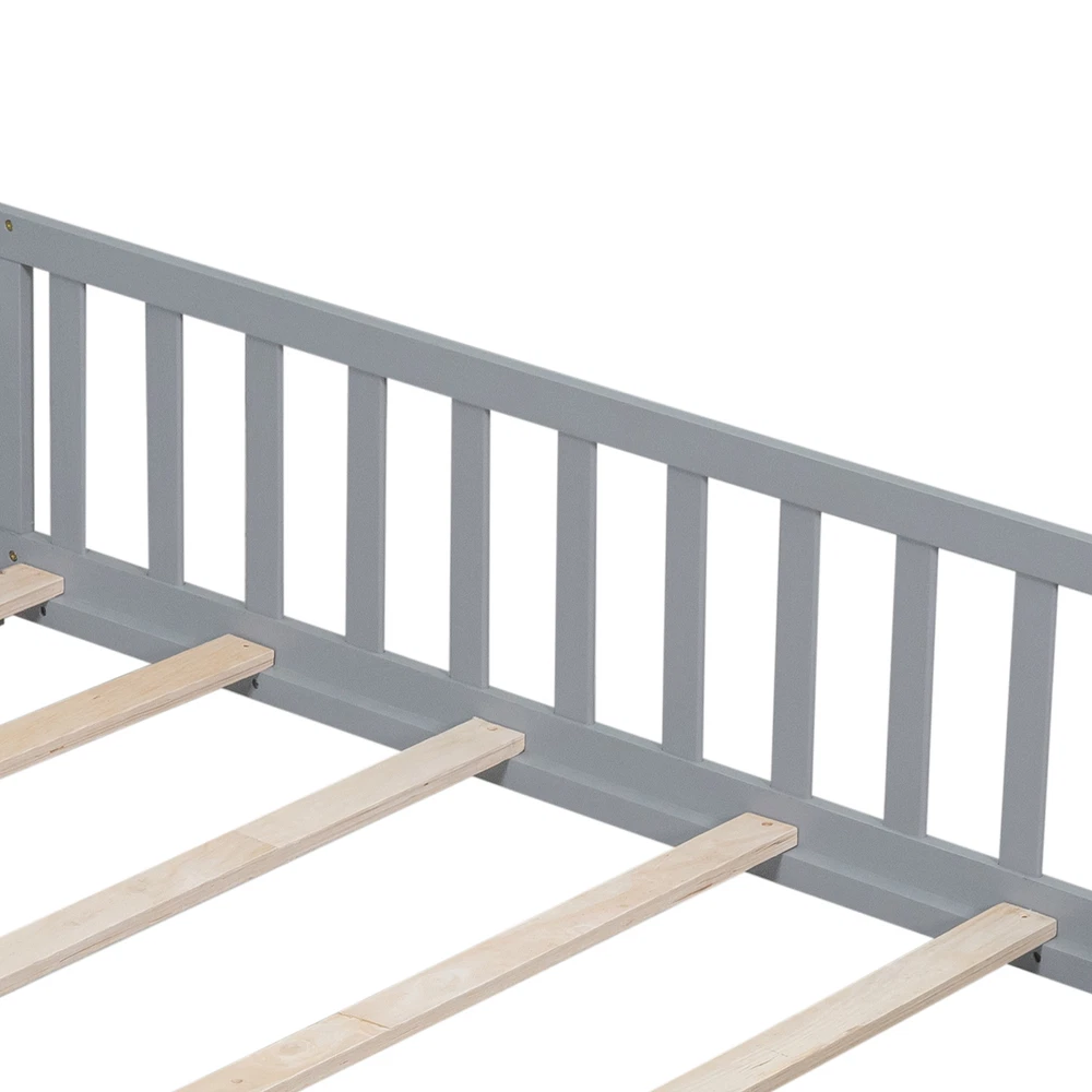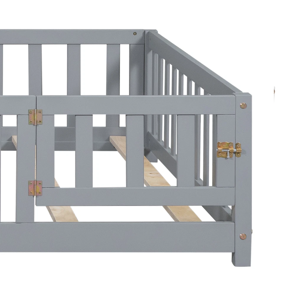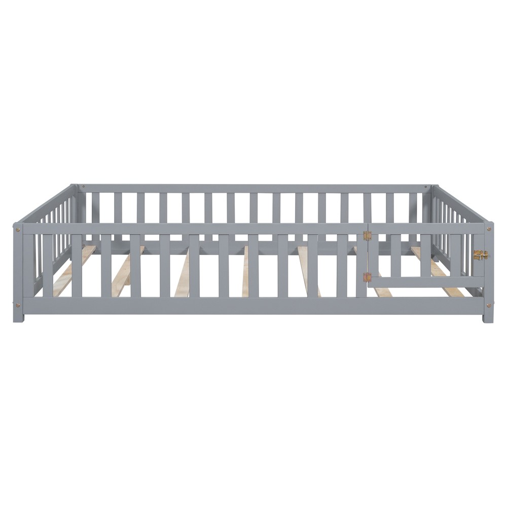 Full Size Floor Platform Bed with Fence and Door for Kids, Montessori Floor Bed Features 1.Practical bed frame: Our floor platform Bed frame is not only a comfortable sleeping area, but can also be used as a game fence to help parents take care of their children and provide a playground for learning to walk and climb. Let your child have fun playing in their room. 2.High quality material: Bed is made of high-quality plywood and pine, with a sturdy wooden structure that is firmly fixed and each part reinforcing each other, ensuring its long-lasting performance. The surrounding fence provides additional protection and enhances its robustness. The bed platform uses 7 solid plywood Flat noodles to provide strong support and enough toughness for the mattress, ensuring a comfortable and relaxed sleep experience. 3.Fun and Safe Design: With a small door that can be opened and closed, it adds fun to the bed and creates a safer sleeping space. The big door helps you make your child very happy and quickly get in and out of bed! 4.Easy to assemble: The bed is packaged in a single unit and comes with an installation manual and all necessary hardware, making it easy to assemble quickly and easily. Description Feature: The floor to ceiling bed with fence and door is carefully designed for our young children. The surrounding fence will provide perfect protection for the child, and every corner of the bed is smooth and will not harm the child's skin. Preparing a fenced floor bed for your toddler or toddler who is learning to walk is the wisest choice. Specifications: Size Full Size Material Pine+Plywood Product Dimensions 78.1"L x55.7"W x 16.5"H Weight Capacity 300LBS Assembly Required Yes Suggested Number of People for Assembly 2 Number of Slats 7 Package Number 1 Notification: 1. Due to lighting or monitor display, the color of the real product may be slightly different from the image. 2. Manual measurement has been used, and there may be some reasonable errors.
