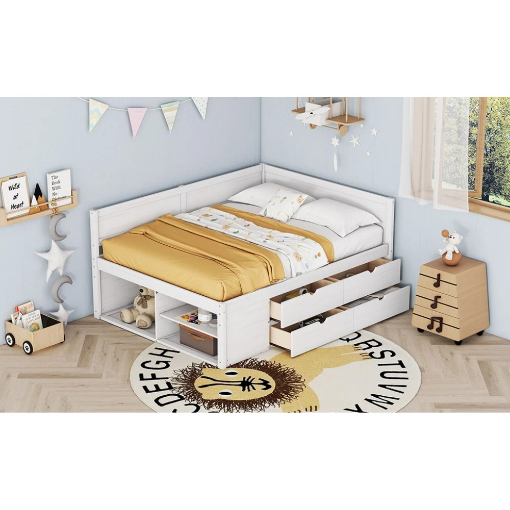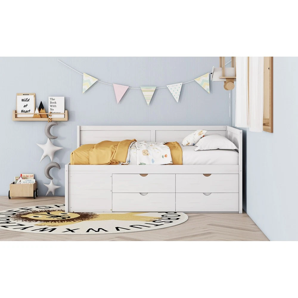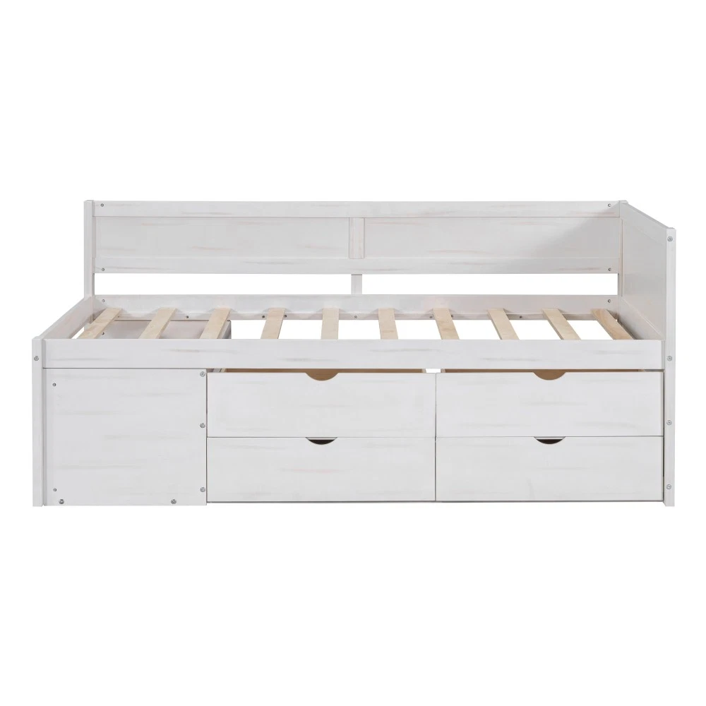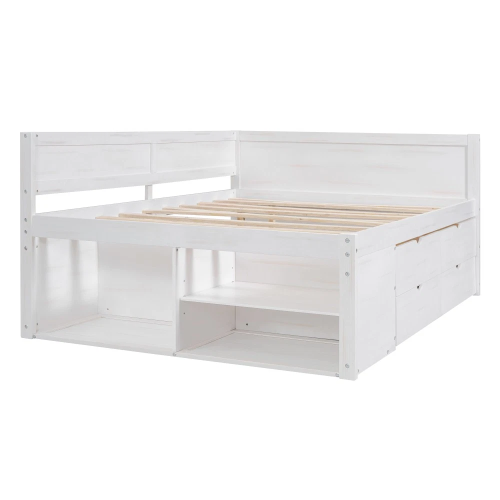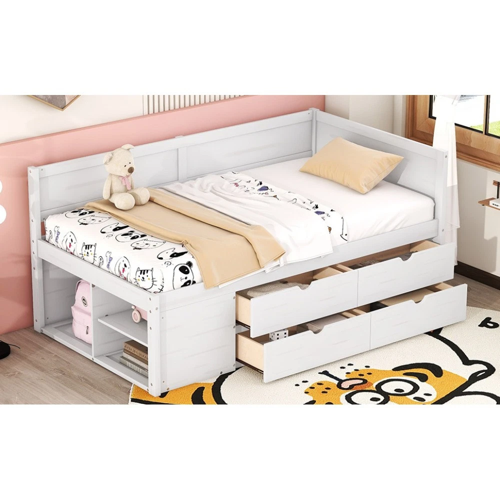 [Maximized space] The daybed with handy pull-out drawers and three functioning shelves takes up minimal space, perfect for organizing anything from clothes and bed linens to toys and games. Such a versatile piece, bringing functionality, versatility, and style to your home, perfect for those who have limited space. [Elegant design] This daybed with handy pull-out drawers is designed with a clean silhouette and a hue of elegance. It gives any room a spark of style that's both modern and timeless. [Solid Construction] The bed structure is crafted from high-quality and a strong, durable frame so that the bed is sturdy and durable. The simple yet elegant wood frame is sturdy and comes with wood slats for extra support and ensures air moves freely around your mattress to keep it fresh for years to come. [Health and Comfort] No box spring required, and without needing a foundation. Built-in smoothly sliders , easy for you to pull out of the drawers. [Dimensions] Overall Product Dimension: 77.8"L x 57.6"W x 34.3"H. Mattress not included. Some assembly is required, although we have provided clear instructions and tools. The daybed with handy pull-out drawers and three functioning shelves takes up minimal space, perfect for organizing anything from clothes and bed linens to toys and games. Such a versatile piece, bringing functionality, versatility, and style to your home, perfect for those who have limited space. High-quality, solid and a strong, durable frame ensures stability and durability for long-term use. Slat kit included so box springs are not required. This daybed is designed with a clean silhouette and a hue of elegance. It suits all styles of home decoration, and completes the look of any bedroom. Weight & Dimensions Overall Product Dimension 77.8"L x 57.6"W x 34.3"H Detail Product Dimension Please refer to the Size image Number of Package 2 Package Dimension Please refer to the Specification Overall Product Weight 145.63LBS Package Weight Please refer to the Specification Weight Capacity 350LBS Recommended Mattress Thickness 6" Specifications: Product Type Daybed Size Full Color White/Gray/Walnut Material Plywood+MDF+Pinewood Box Spring Required No Number of Slats 10 Assembly Required Yes Country of Origin Vietnam Notes: Manual measurement has been used,there may be some reasonable error. All the pictures are taken by actual samples, slight chromatic aberration may occur due to lighting or display.