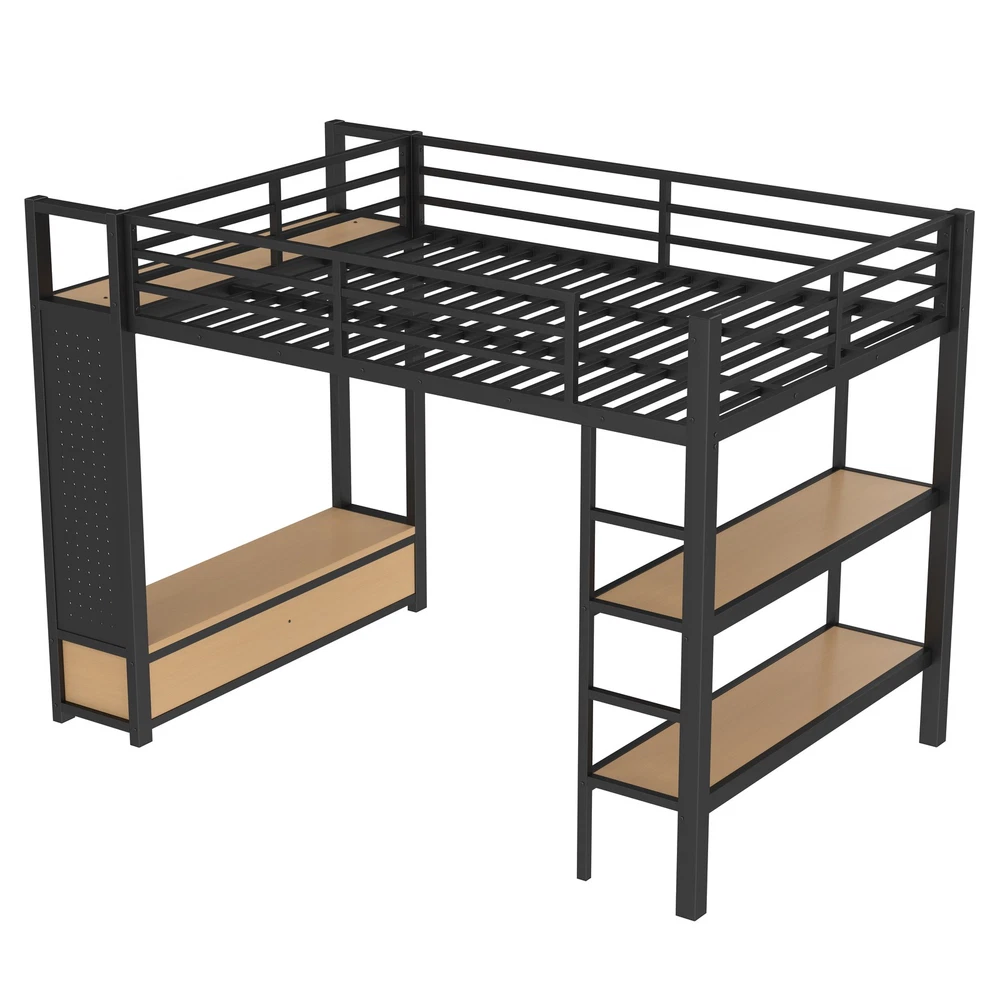 Full Size Loft Bed Frame w/Wardrobe,Metal Loft Bed with Storage Shelves Black Features 【Efficient Storage Combination】This bed comes with closet, shelves and Pegboards with smooth drawer slides, easy to open and close, perfect for storing clothes or other sundries and keeping the room tidy. Sturdy hanging rods are installed above the drawers, which are convenient for hanging clothes, bags or bath towels, solving the temporary storage pains and avoiding the accumulation of clothes. 【Side multi-function Pegboard】One side of the bed is equipped with Pegboard, users can freely match the hooks, shelves, baskets and other accessories, personalized storage of small objects or temporary favorite collection. 【Safety Guaranteed】 Full-length guardrails on the upper bed prevent accidental falls. The staircase tightly attaches to the bed for easy access and wobble-free footing. 【Space Saving】Through precision-engineered 3D design, it seamlessly integrates shelving, drawers, multi-tiered storage, and flexible expansion zones within the bed structure. This simultaneously addresses sleep, study, storage, and display needs – delivering true all-in-one functionality! 【Easy to Assemble】All parts included in your package are indicated clearly. With step-by-step installation manual and pre-drilled holes, you can easily assemble this bed individually. Descriptions Description: This Metal Loft Bed has an Open Wardrobe with its own hanging rod and two bottom drawers for storage. The other side has two shelves for added storage and display area, and the upper shelf can also be used as a desk for study or work needs. The sides are equipped with Pegboard to provide flexible hanging and display space, which can be expanded freely with accessories. The upper bed is designed with a full-encompassing raised guardrail to protect the user's sleeping safety and reduce the risk of falling. This three-dimensional integrated design brings together the functions of sleeping, studying, storage and display, greatly improving the utilization of space. Description & Dimensions Product Type Metal Loft Bed Size Full Color Black Material MDF +Metal verall Product Dimension 88.6"L x57.5 "W x65 "H Overall Product Weight 151.46LBS Detail Product Dimension Please refer to the Size image Number of Package 2 Package Dimension Please refer to the Specification Weight Capacity 350LBS commended Mattress Thickness 6'' Assembly Required Yes Country of Origin China Notes Manual measurement has been used, there may be some reasonable error.