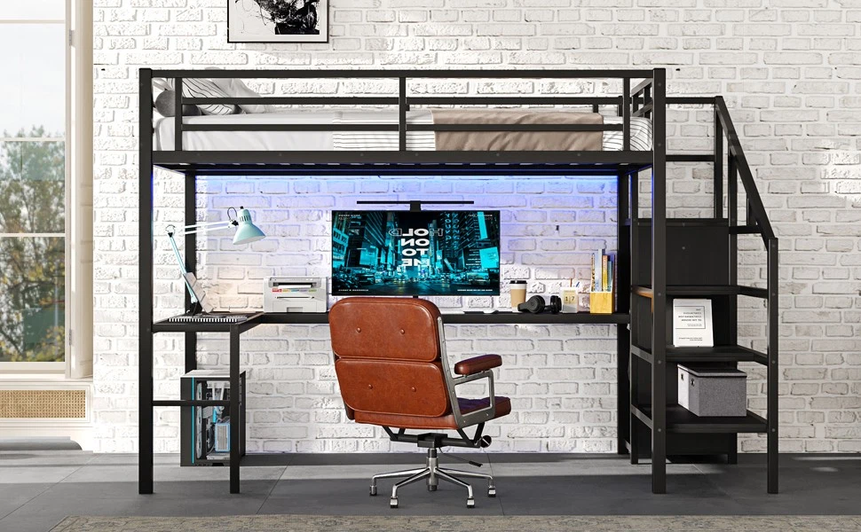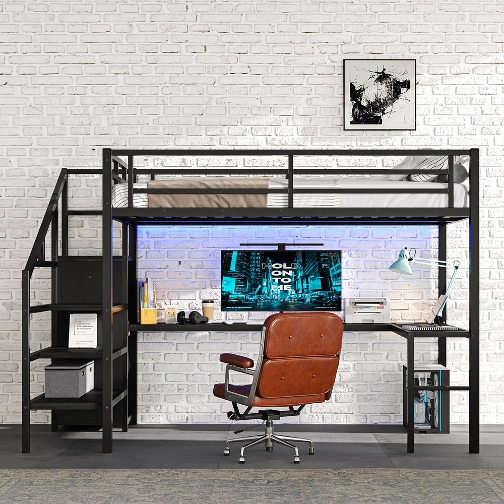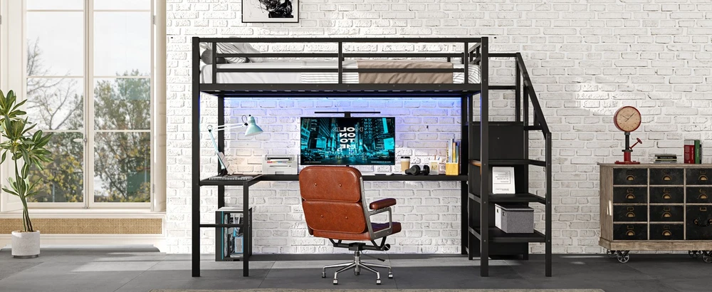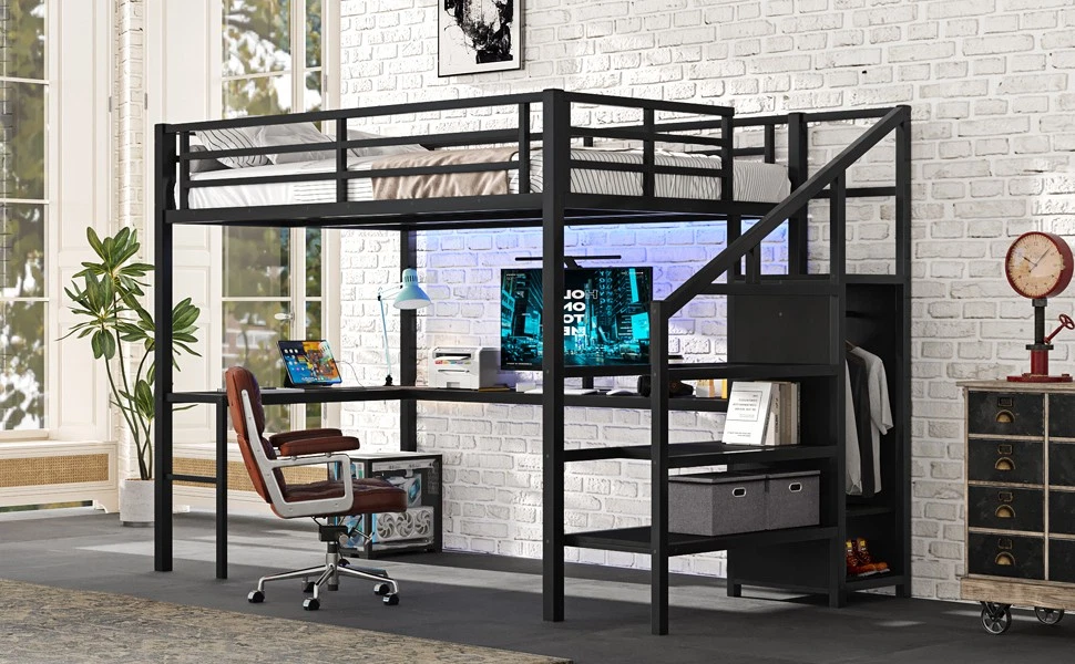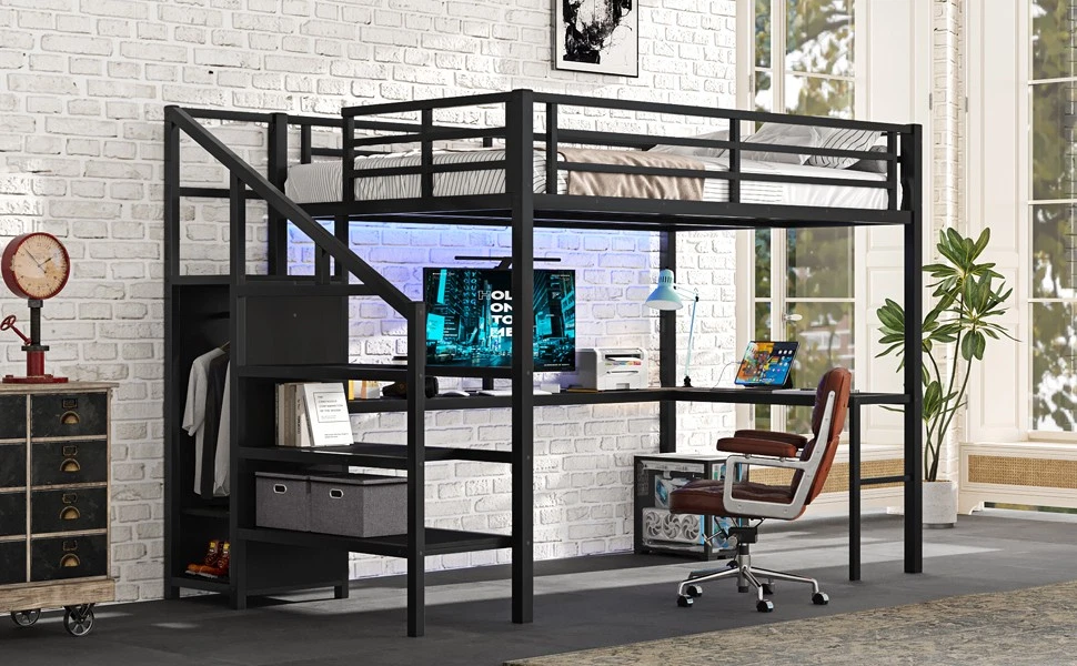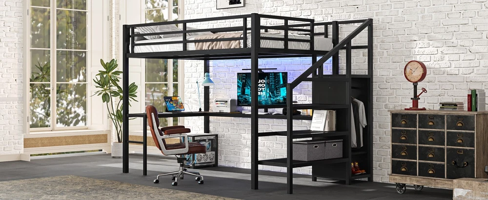 Full Size Loft Bed with L-shaped Desk and USB, Wardrobe and Adjustable Shelf Features Full Size Loft Bed with Wardrobe and Stairs - The loft bed has a wardrobe that comes with its own hanging rod and an adjustable divider at the bottom, which can be used to store quilts, storage boxes or shoes. The versatile built-in staircase can also be used as storage space and can be fitted left or right as required. Space-Saving Loft Bed & Workspace - This metal loft bed has a cozy sleeping space, and a spacious and practical L-shaped desk underneath that can be used as a workbench, reading area, etc. where you can create your own little world. The space-saving design adds a touch of elegance to any bedroom. Space-Saving Loft Bed & Workspace - This metal loft bed has a cozy sleeping space, and a spacious and practical L-shaped desk underneath that can be used as a workbench, reading area, etc. where you can create your own little world. The space-saving design adds a touch of elegance to any bedroom. Solid Metal Loft Bed - The bed frame is made of metal for strength and stability, and the upper bunk can hold up to 350 pounds. Twin size loft bed frame comes with sturdy stairs so kids can safely climb to the upper bunk and full-length guardrails keep kids safe while sleeping. Easy Assembly - Some assembly will be required, each order comes with clear and detailed instructions and numbered parts with all the necessary tools so you can get your bed assembled quickly. Notes: This metal loft bed will be packaged in two boxes, excluding the mattress! Descriptions Description If you need a versatile bed, then our metal loft beds are the perfect choice. The full-size upper bed provides you with plenty of sleeping space, and the desk below is the perfect area to work and study. In addition, the full size loft bed comes with a built-in closet that can be used for storing your daily clothes and supplies, and the interchangeable left and right staircases allow for storage while keeping it sturdy. The USB and LED lights are designed to provide you with great convenience. Quality metal materials and a minimalist black design make this loft bed an eye-catcher in the bedroom. Description & Dimensions Product Type Loft Bed Material Metal Size Full Color Black Numbers of Package 2 Overall Product Dimension 93.7''L x 56.7''W x 68.7''H Overall Product Weight 164.46 LBS Weight Capacity 350 LBS Recommend Bed Mattress Thickness 6'' Country of Origin China