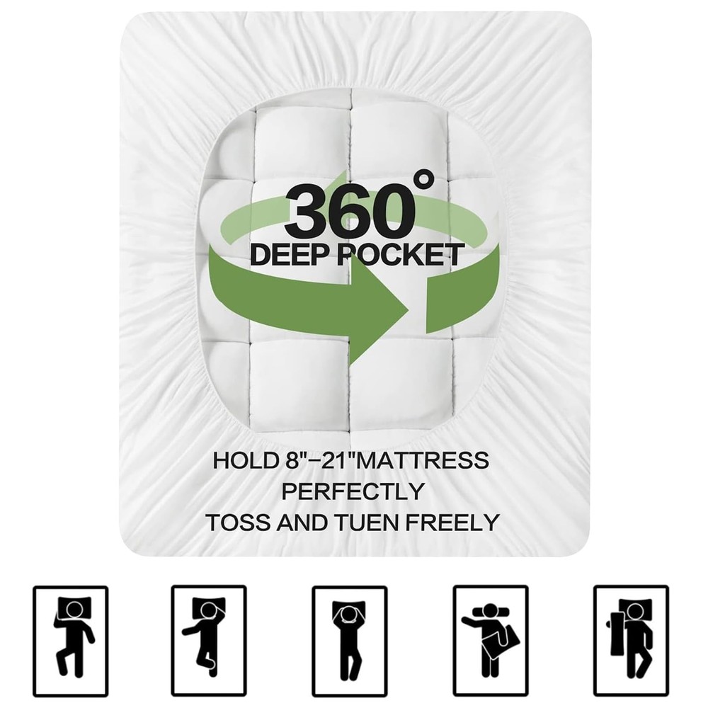 mattress topper 【SOFT & OPTIMAL FILLING】 With 1200GSM ultra-plush mircrofiber fill, Soft,Comfortable and Breathable,provides support for your shoulders and hips,It's also an economical way to extend the life of your mattress without having to replace it with an expensive new one. 【COOL & BREATHABLE】 Our mattress topper uses 40% viscose made from bamboo (more breathable) + 60% polyester (softer) fabric, the composition is designed to prevent you from feeling stuffy and sweaty, allowing for more efficient airflow to reduce overheating, therefore allowing you to enjoy a refreshing relaxation experience 【DEEP ELASTIC POCKET】Fits mattresses from 8" - 21". Our deep pockets are designed for all types of mattresses.Ensures your mattress topper stays firmly in place 【MACHINE WASHABLE】This mattress topper is easy to take care of, throw it in the washing machine, wash it in cold water, economical and sustainable 【SERVICE GUARANTEE】If you have any reason not satisfied with it, please contact our customer support, we will do our best to your satisfaction.