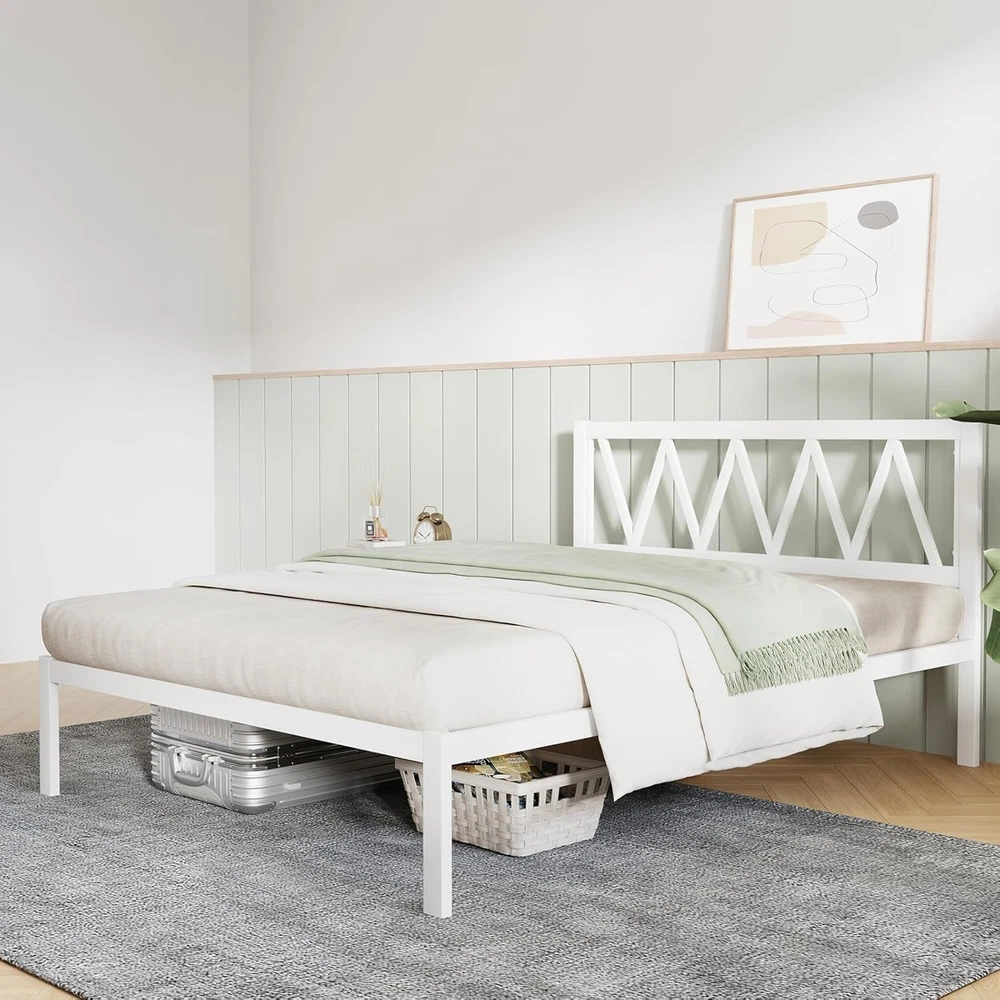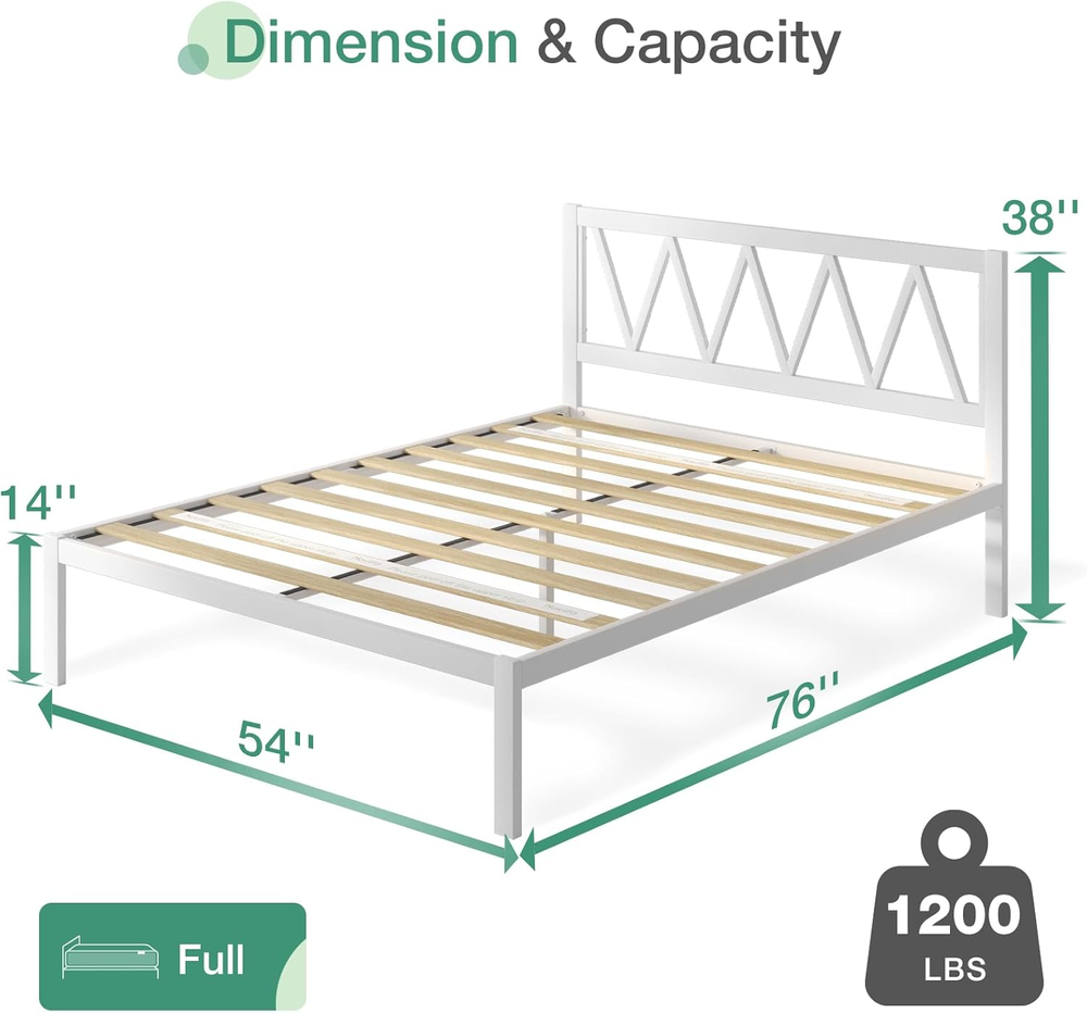 Store New Arrivals Add to Favorite View Feedback Contact Full Size Bed Frame with Headboard, Metal Platform Bed Frame, Wood Slat Support, Heavy Duty, No Box Spring Needed, Easy Assembly, White Description Item model number N-F10017-F-WH-New2 Item Weight 45.9 pounds Style 14 Inch Material Iron Style 14 Inch Assembly Required Yes Color With Headboard-white a Special Feature No Box Spring Needed Product Dimensions 76.18"L x 53.94"W x 38.11"H Maximum Weight Recommendation 1200 Pounds Furniture Finish White Global Trade Identification Number 00840282760281 Ground To Item Distance 12 Inches Size Full Finish Type Lacquered Compatible With Mattress Size Full Product Care Instructions Damp cloth Included Components Steel & Slats, Tools, Instructions Simple Design & Easy Cleaning: Our bed frame features a simple design that blends effortlessly with any bedroom decor, adding a modern touch to your space. The sleek metal construction is not only stylish but also practical, as it can be easily cleaned with just a damp cloth. This makes maintenance a breeze. Durable & Sturdy: In order to enhance support and stability, this bed frame includes an extra central leg. The reinforced steel construction ensures a robust structure that can support up to 1200 lbs, providing a secure and steady foundation for your mattress. This design not only extends the lifespan of your bed frame but also provides a safe and comfortable sleeping experience. Noise Reduction & Scratch Resistant: The bed slats include 2 noise-reducing strips and 2 anti-slip patches to ensure a quiet and stable sleep environment, which made with wood certified by the Forest Stewardship Council (FSC). Additionally, the novilla bed frame legs have protective pads to prevent floor scratches. Generous Storage Space: This white platform bed frame provides 12 inches of space under the bed, giving you plenty of room to store your items and keep your bedroom organized. This elevated design makes it easy for robot vacuums to clean underneath, helping you keep the room tidy. Easy Assembly: When you receive our metal bed frame, it comes with all necessary parts and a detailed instruction manual. Following the clear instructions, you can assemble the bed in just 20 minutes, making it ideal for bedrooms, guest rooms, dorms, and hotels. The Novilla metal bed frame is simple and stylish in design. Metal frame structure with wooden slats for support. To top it off, the metal legs in the middle add extra reinforcement, ensuring that the structure is stable and won't wobble or shake. We provide detailed installation instructions and all necessary components. Our instructions are easy to follow and can be quickly assembled by anyone. We have four sizes to fit your need, namely Twin/Full/Queen/King, and black and white colors available for you to choose from. ABOUT US We offer the best prices around on high quality products. Our E-store includes media such as books, movies, music and games while offering electronics, toys, sporting apparel, clothing, tools, general home, garden items and more. SHIPPING We are always working hard to ensure your package arrives as soon as possible. Please understand that some factors like weather, high postal traffic, and the performance of shipping companies are outside of our control. We offer free shipping to the lower 48 states and ship within 2 business days of payment, usually sooner. We do not accept P.O. Boxes. Please provide a physical address. For shipping outside of the continental USA, we only use eBay's Global Shipping Program.The item is shipped to KY and then sent to the rest of the world. International customers are responsible for all duties and taxes. Continue to check out in order to calculate costs for shipping the item to your country. Messages regarding eBay's Global Shipping Program MUST be directed at eBay EXCLUSIVELY. RETURNS We offer a 30-Day Return Policy on items which you are not completely satisfied with. You have the option for a full-refund or an exchange of the item. No returns are available on items shipped outside of the USA. PAYMENT We accept PayPal. CONTACT US This page content is yet to come Please ad us to your favorite seller and visit again later Thank You CUSTOMER SATISFACTION We try our very best to make sure every customer is completely satisfied. If there's a problem, message us! We're happy to help.