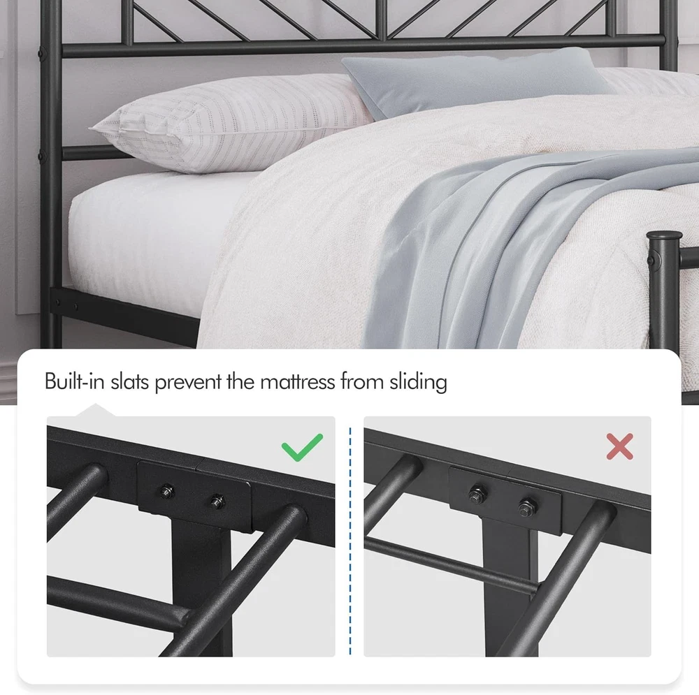 Store New Arrivals Add to Favorite View Feedback Contact Full Size Platform Bed Frame with Arrow Design Headboard, 13 Inches Metal Mattress Foundation for Storage, No Box Spring Needed, Easy Assembly, Modern, Black Description Item model number YT-00120349-001 Finish Type Powder Coated Material Iron Style Modern Assembly Required Yes Color Black Form Factor Platform Bed Product Dimensions 77.5"L x 56"W x 35"H Furniture Finish Black Country of Origin China Maximum Weight Recommendation 750 Pounds Item Weight 39.2 Pounds Compatible With Mattress Size 75" L × 54" W Item Weight 39.2 pounds Age Range (Description) All Ages Ground To Item Distance 13 Inches Included Components Headboard, Slat, Footboard, Instruction Manual Size Full Special Feature No Box Spring Needed, Under Bed Storage, Sturdy, Squeak Resistant ARROW DESIGN HEADBOARD AND FOOTBOARD: The stylish head and footboard of this metal-framed full bed are embellished with chic arrow patterns, bringing artistic temperament and character to your bedroom. Aesthetic but practical, they provide extra protection to your body and keep the covers or blankets in place. RELIABLE SUPPORT: This full size bed frame is built of metal slats, side rails and 6 sturdy legs, with a maximum weight capacity of 750 lb, ensuring a peaceful night's sleep without being bothered by squeaky sounds. 12 built-in metal slats provide optimal support for your mattress and bedding (no box spring required). OPTIMUM OFF-GROUND HEIGHT: The iron platform bed stands 13’’ off the floor, allowing easy access to the boxes and baskets underneath, also making you effortlessly get into or out of the bed, which is perfect for sleepers of all ages. SECURE YOUR MATTRESS: The side rails of this metal bed frame are thoughtfully designed to be higher than the inserted slats, preventing the mattress from significantly sliding around. FAST & EASY ASSEMBLY: All the necessary parts, handy tools and easy-to-follow instructions are included in one efficiently packed box for simple set up within an hour, saving you time and hassle. Product Description Modernize your sleeping space with this full metal platform bed with arrow design headboard and footboard. With a nod to minimalist design, this metal bed plactform embraces a clean-lined appearance, stylish arrow design and sleek metallic finish that seamlessly blends with any home decor style. Constructed of a solid and durable metal frame, this bed frame features multiple strong support legs that provide optimal stability for any type of latex, memory foam or spring mattress without a clumpy box spring. Details like the powder-coated finish and non-slip foot caps all contribute to your safety and comfort. Plus, the platform bed frame creates sufficient under-the-bed storage space for your luggage, shoes, bags and other odds & ends, keeping your bedroom tidy and clutter-free. ABOUT US We offer the best prices around on high quality products. Our E-store includes media such as books, movies, music and games while offering electronics, toys, sporting apparel, clothing, tools, general home, garden items and more. SHIPPING We are always working hard to ensure your package arrives as soon as possible. Please understand that some factors like weather, high postal traffic, and the performance of shipping companies are outside of our control. We offer free shipping to the lower 48 states and ship within 2 business days of payment, usually sooner. We do not accept P.O. Boxes. Please provide a physical address. For shipping outside of the continental USA, we only use eBay's Global Shipping Program.The item is shipped to KY and then sent to the rest of the world. International customers are responsible for all duties and taxes. Continue to check out in order to calculate costs for shipping the item to your country. Messages regarding eBay's Global Shipping Program MUST be directed at eBay EXCLUSIVELY. RETURNS We offer a 30-Day Return Policy on items which you are not completely satisfied with. You have the option for a full-refund or an exchange of the item. No returns are available on items shipped outside of the USA. PAYMENT We accept PayPal. CONTACT US This page content is yet to come Please ad us to your favorite seller and visit again later Thank You CUSTOMER SATISFACTION We try our very best to make sure every customer is completely satisfied. If there's a problem, message us! We're happy to help.