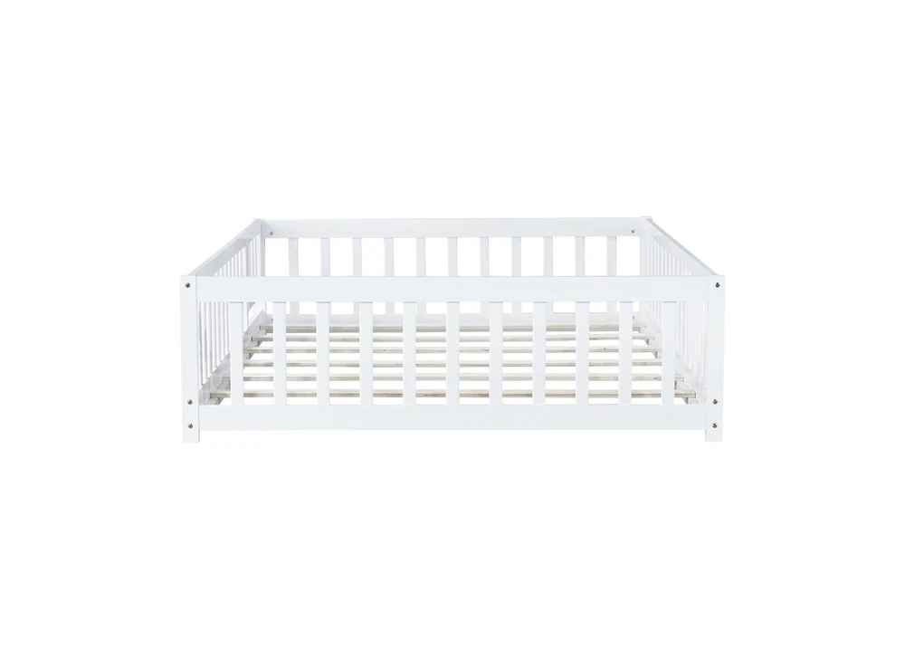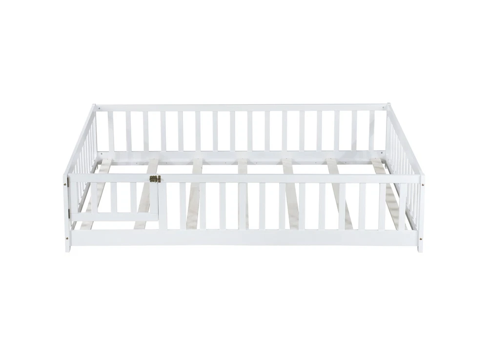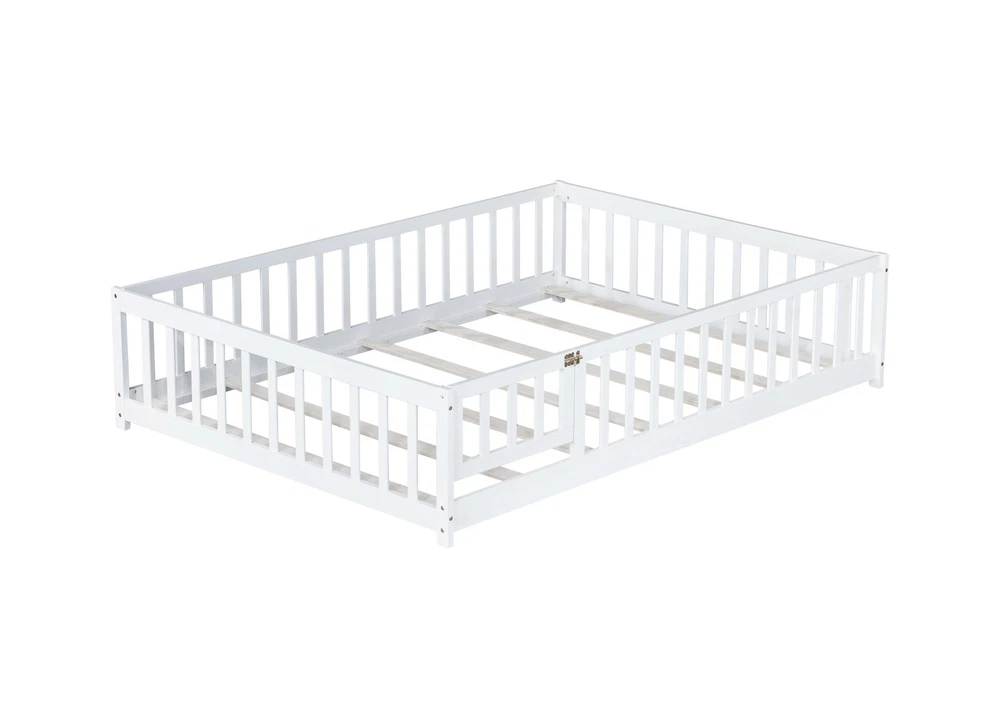Product Information Product Type: Single Box Product Product Name: Full Size Floor Bed with Fence and Door,Rubber Wood Floor Bed with Safety Guardrails,White Place of Origin: Malaysia Main Color: White Main Material: Rubber Wood Bed Size: Full Product Dimensions Assembled Length (in.): 76.60 Assembled Width (in.): 56.50 Assembled Height (in.): 17.50 Product Weight (lbs.): 48.50 Package Size Length (in.): 78.50 Width (in.): 18.30 Height (in.): 4.50 Weight (lbs.): 55.10 Product Features [Multi-functional Design] The floor bed is designed to help the parents to look after their children and give a playground to learn walking and climbing, also it’s an ideal place for kids to sleep on it. the bed is most suitable to those compact rooms and limited space. The kids may feel they are playing in the wonderland if you can give some lovely decoration. [Perfect for Transition Period] The low-floor bed facilitates the transition from co-sleeping to an independent sleeping environment, thereby fostering children's autonomy. The fence-enclosed design promotes exploration and freedom within their personal space. [Solid and Sturdy Structure] The product is mainly crafted from premium rubber wood and quality engineered wood, thus making it sturdy and durable. The full surrounding fence will definitely give a perfect protection. The wood structure is firmly fixed and strengthened mutually by every part. [Fence Door and Platform Slats] The bed platform is constructed with 7 strengthened slats, and provides strong support and enough tenacity.The bed is equipped with a revolving door, which has 2 hinges and a steel latch.The door facilitates safe and efficient access for children entering and exiting the bed. [Easy-Assembly] The floor bed is delivered in single package, along with the manual and full set of hardware necessary to guide you through the process of assembly, and the bed will surely be assembled swiftly. Notice: Due to variations in lighting, equipment, weather conditions, and other factors, the colour tones of the products customers purchase may exhibit slight differences compared to the representations in the pictures or photos displayed in our store. Description Description It’s the best wise choice to have a full size floor bed with fence at your home. The product is crafted from quality rubber wood. The eco-friendly painting gives a safe and environmentally-friendly space. The floor bed is very convenient and quick to be fixed under the guidance of the installation manual. Description Product Type Floor Bed with Fence Size Full Color White Material (main) Rubber wood + Plywood Number of Slats 7 pcs Spring Box No need Assembly Required Yes Manual and Hardware Yes Country of Origin Malaysia Technical Details Overall Product Dimension 76.6“x 56.5”x 17.5” Overall Product Weight 48.5 lbs Package Details Please refer to the Specification Bed Weight Capacity 400 lbs Suggested Mattress Thickness 6 inches or less