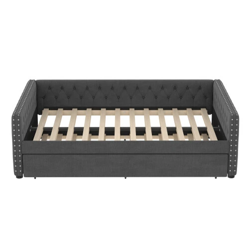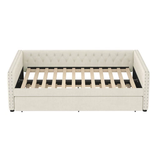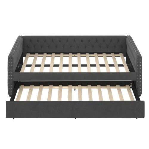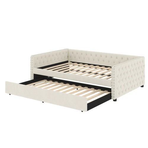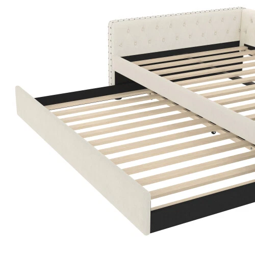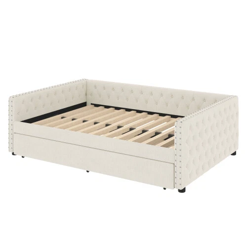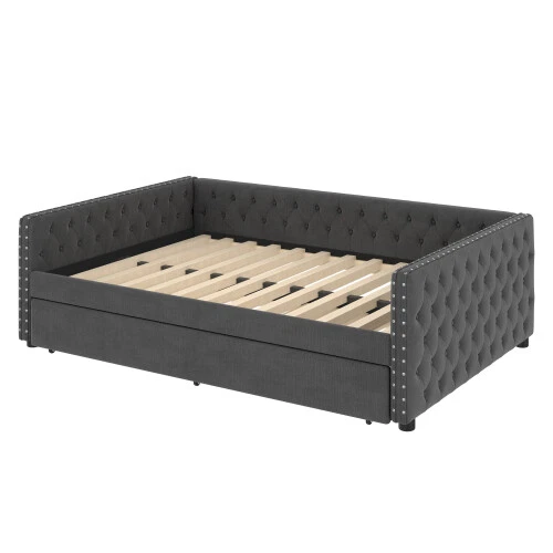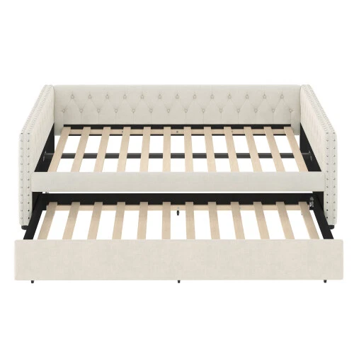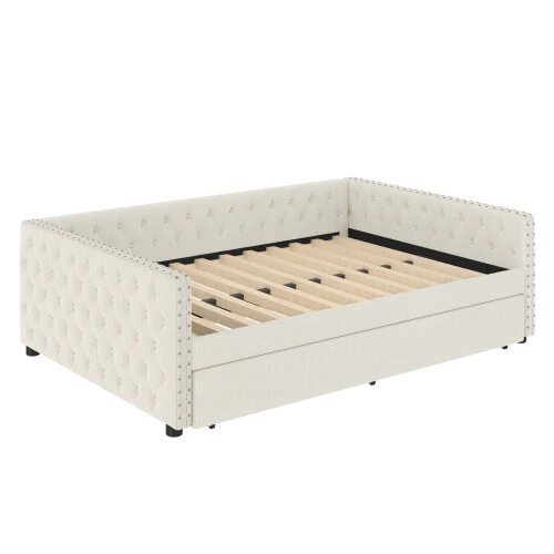 Full Size Upholstered Daybed with Trundle Day Bed Sofa Beds Platform Bed Frames This versatile full sofa bed with twin size pull-out trundle is perfect for a midday nap or a restful night's sleep. Tufted buttons accentuate the classic look and rivets on the armrests highlight the elegant curves of the side panels. The sturdy wooden frame is padded with foam and upholstered in a quality technical fabric, providing ample comfort for lounging. The full size upholstered sofa bed combines style and functionality to keep you cozy. [Elegant Upholstered Tufted Sofa Bed] This daybed features button tufted arms for an elegant look. The square arms are fitted with rivets and the folded edge design combines chic detailing with modern style. Add sophistication to your home with this full upholstered sofa bed. [Functional Daybed] This versatile sofa bed not only provides a comfortable seating experience, but additionally pulls out the trundle bed to provide an extra sleeping space for your overnight guests to meet your different needs! [Sturdy Frame] This upholstered daybed frame is crafted from solid plywood covered with technical fabric for sturdy quality. The evenly distributed bed slats can hold up to 350 pounds. And the trundle bed comes with smooth casters for easy pull-out. [Comfortable Experience] This full size sofa bed is ergonomically designed to provide excellent support for your back and arms. Plus, the soft technical fabric fabric provides a comfortable seating experience! [Easy Assembly] Assembly is required, and each order comes with a clear and detailed assembly guide with all the necessary tools to get your bed assembled in no time. If you have any questions, please contact our customer service immediately and we will help you solve them as soon as possible. Overall Product Dimension 85’’L*56.9’’W*26’’H Weight Capacity 500LBS for Upper Full Bed, 350 for Trundle Bed Material Linen Size Full size for daybed and Twin size for trundle bed Trundle Recommended Mattress Thickness 6inch(Mattress not included) Bed recommended Mattress Thickness 8inch(Mattress not included) Assembly Required Yes Additional Tools Required All Tools Included Payment Delivery details Terms of sales About us Contact us Payment We accept payment via paypal,Visa Card and so on. Please make sure your eBay address is correct before you pay. Unpaid Item will be closed after 5 days. All the unpaid winner will receive an UPI to recover the final value charge of the transaction. Delivery details Package will be sent out within 48 hours after payment of purchases are cleared. Delivery time is 3-6 business days! Pick-up is unsupported service. We will NOT be responsible for any delivery failure due to unclear or incomplete addresses. Delivery is not available on weekends, public holidays or after business hours Terms of sales If you are pleased with transaction, pls give us postive feedback and 5 star ratings , thanks! :-) If you received wrong or defective products, please take photos and contact us for best solutions. All items must be returned in NEW condition, including the packaging, and all accessories. Products damaged or mis-used by person are not under warranty. All charges for return are to be paid by the customer. Shipping and handling charges are not refundable. If any problem, just feel free to contact us first. We are sure we can deal it well. About us *Brand new item. *High quality, competitive price. *Warehhouse in US, UK, DE,FR. Contact us 9:30AM-18:30PM (Beijing Time) from Monday to Friday. Any message for us will be replied within 24 hours.