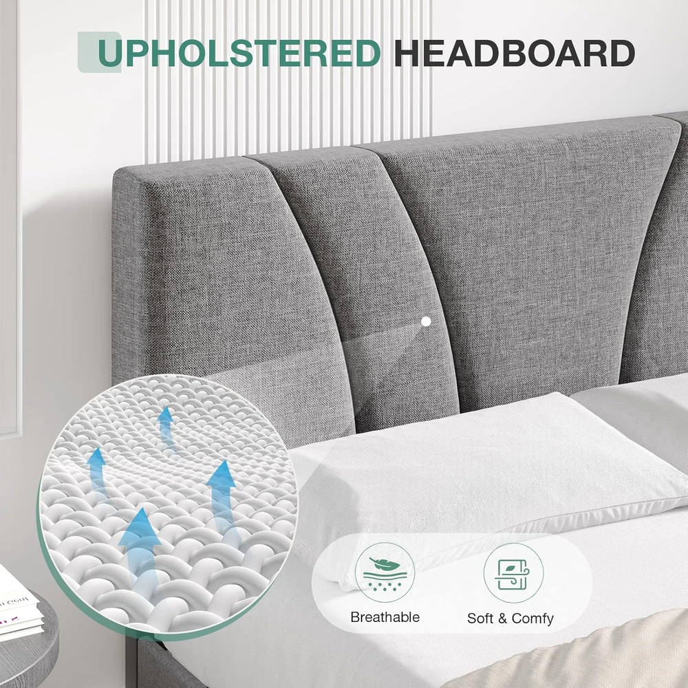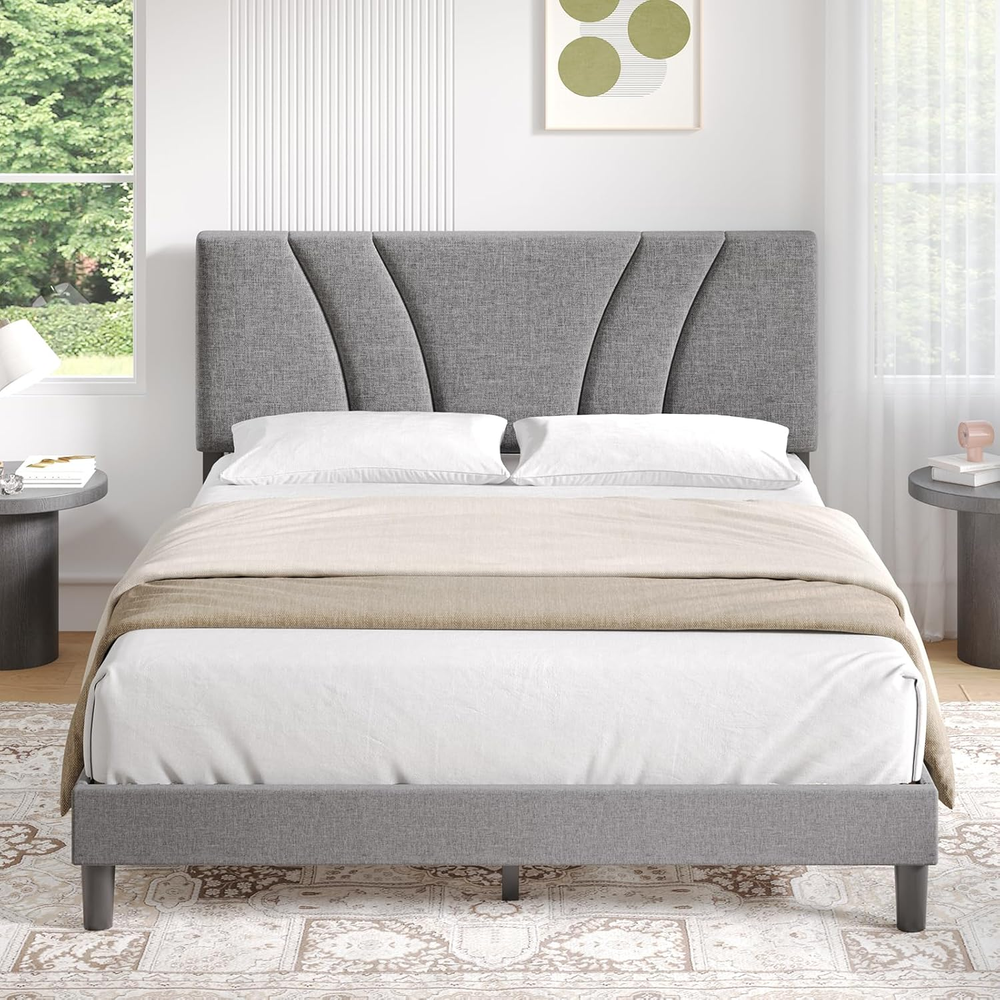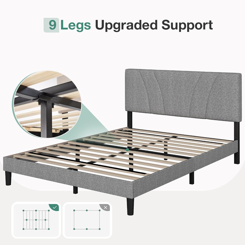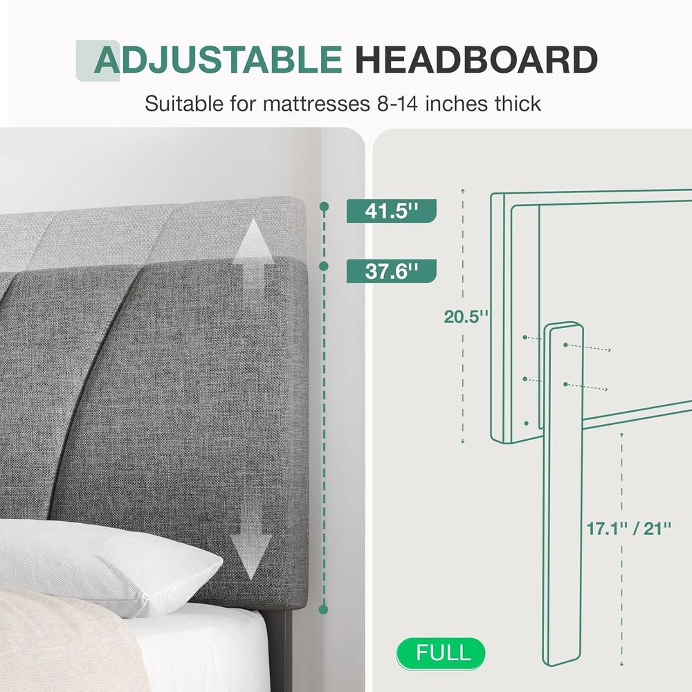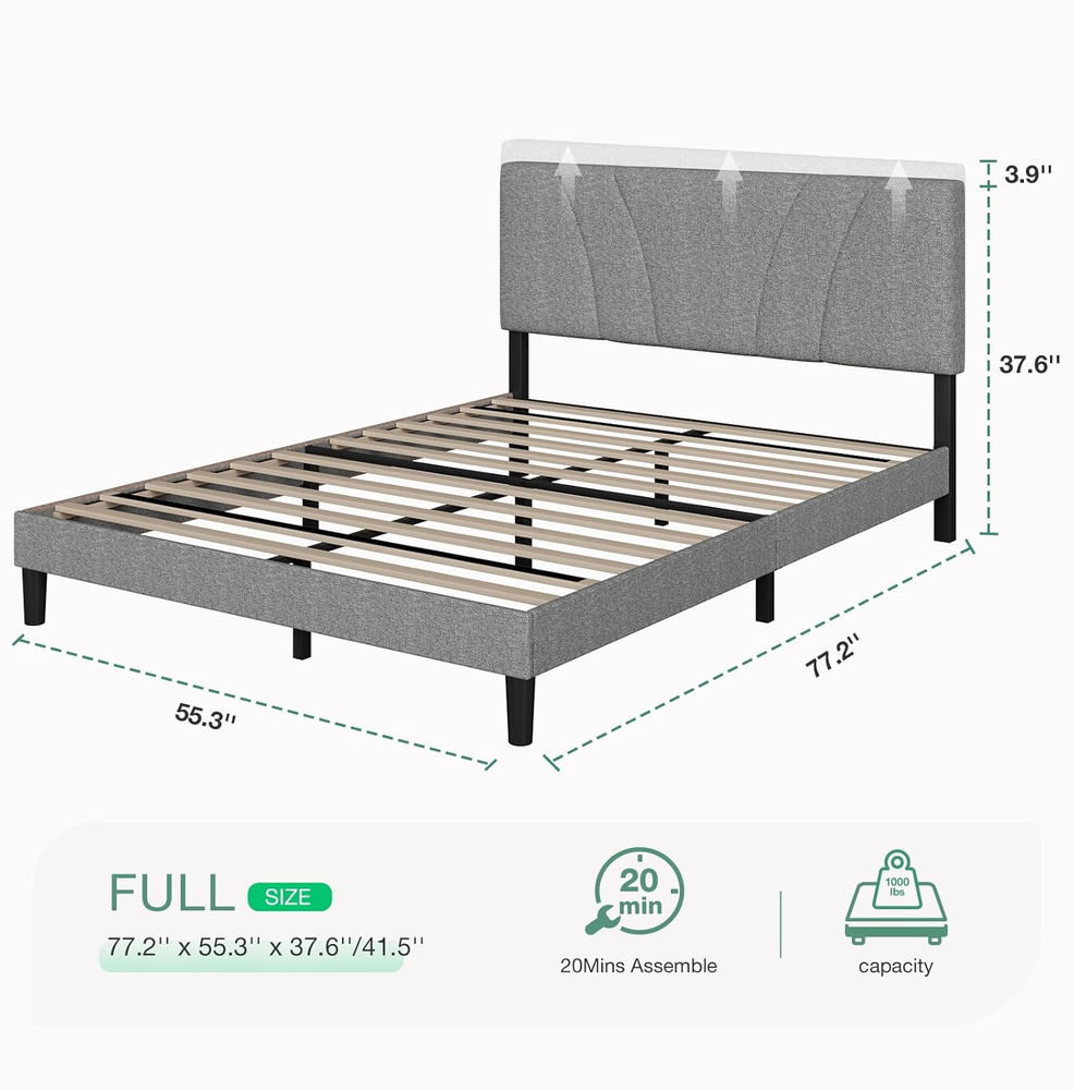 Store New Arrivals Add to Favorite View Feedback Contact Full Size Bed Frame Upholstered Platform Bed Frame with Adjustable Headboard, Strong Weight Capacity, Noise-Free, No Box Spring Needed, Easy Assembly, Gray Description Global Trade Identification Number 00840282760076 Style Metal Product Dimensions 77.2"L x 55.3"W x 41.5"H Maximum Weight Recommendation 1000 Pounds Furniture Finish Gray Assembly Required Yes Color Grey Finish Type Lacquered Country of Origin China Fabric Type Metal, Wood Item Weight 57.9 pounds Batteries required No Finish types Lacquered Size Full Special Feature No Box Spring Needed, Adjustable Compatible With Mattress Size full, and potentially other sizes between 8-14 inches in thickness Material Wood, Metal Style Metal Included Components Installation Manual, Headboard Metal, Wood 【Adjustable Headboard】The full size bed frame with headboard can be adjusted from 37.6 inches to 41.5 inches in height, suitable for mattresses from 8-14 inches. You can choose the right mattress according to your certain needs and preferences. 【Sturdy & No Box Spring Needed】Our full size bed frame adopts a metal frame structure with high-density foam wrapped in the side, 12 articles evenly-spaced solid wood slats, and 9 Iron support legs to provide dense and strong support for up to 1000lbs, ensuring the firmness and stability of the full bed frame. 【Stylish and Comfortable】The full size bed frame headboard is made of soft and comfortable linen fabric with high-quality foam built in for a comfortable touch. The lines of the headboard are clean and sleek, minimalist, and complement any bedroom style, adding a touch of elegance and sophistication to your space. 【Noise Free】Our full bed frame is equipped with cushioned silent pads on the middle support tube and the slats are specially designed with velcro to speed up installation and eliminate noise, so you don't have to worry about any annoying noises and make sure you sleep peacefully and comfortably. 【Easy Assembly】Our full size bed frame comes along with necessary accessories and an instruction manual. Following the detailed instructions for quick assembly and TWO-PERSON assembly can reduce completion time to 20 minutes. About Novilla We are a furniture brand, a straightforward doer, driven by curiosity, enthusiasm, and a desire to create a cozy home in real. We wish it were simpler for everyone to have a cozy home. Creating a simple and functional furniture brand was our goal, encourage personal exploration of each individual. We always listening to customers and taking suggestions to improve our products. If you have any issues with missing or defective parts, our customer service team is always here to help. ABOUT US We offer the best prices around on high quality products. Our E-store includes media such as books, movies, music and games while offering electronics, toys, sporting apparel, clothing, tools, general home, garden items and more. SHIPPING We are always working hard to ensure your package arrives as soon as possible. Please understand that some factors like weather, high postal traffic, and the performance of shipping companies are outside of our control. We offer free shipping to the lower 48 states and ship within 2 business days of payment, usually sooner. We do not accept P.O. Boxes. Please provide a physical address. For shipping outside of the continental USA, we only use eBay's Global Shipping Program.The item is shipped to KY and then sent to the rest of the world. International customers are responsible for all duties and taxes. Continue to check out in order to calculate costs for shipping the item to your country. Messages regarding eBay's Global Shipping Program MUST be directed at eBay EXCLUSIVELY. RETURNS We offer a 30-Day Return Policy on items which you are not completely satisfied with. You have the option for a full-refund or an exchange of the item. No returns are available on items shipped outside of the USA. PAYMENT We accept PayPal. CONTACT US This page content is yet to come Please ad us to your favorite seller and visit again later Thank You CUSTOMER SATISFACTION We try our very best to make sure every customer is completely satisfied. If there's a problem, message us! We're happy to help.