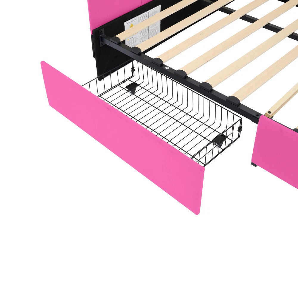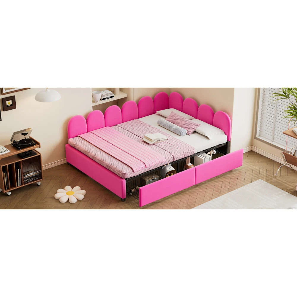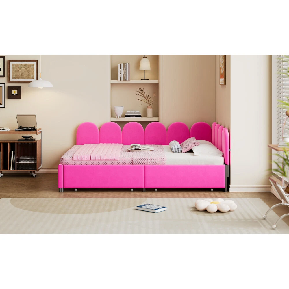 Comfortable Fabric: This upholstered daybed is made of selected velvet, soft fabric headboard provides a comfortable and warm sleeping environment. Elegant Design: This daybed is not only suitable for any home decoration, but also loved by children.The diagonal design of the headboard allows this bed to be placed in a corner, saving space and making it more comfortable. 2 Large Drawers: This daybed has 2 drawers for storing clothes, books, toys, etc. It is very practical and makes full use of the space. Solid Construction: Made of high-quality MDF, the frame of this bed is not easy to be affected by humidity change and lead to crack. The strong legs, wide boards and 12 slats for bed, not only improve the weight capacity of the bed greatly but also ensure the stability. Dimensions and Assembly: Overall Product Dimension: 78"L X56.2"W X 27.69"H. Suitable for full size mattresses. Full size Upholstered Daybed with 2 Drawers, Velvet Sofabed with Soft Fabric Headboard, Rose Red This daybed is made of selected velvet, elegant white,rose red or pink, with tufted shape headboard, elegant and cute, not only suitable for any home decoration, but also loved by children. A soft fabric headboard provides a comfortable and warm sleeping environment. This daybed is a valuable choice as it does not require a box spring or foundation. Just place your mattress on top and enjoy it. With our daybed, relaxation meets efficiency, making it the perfect addition to any modern home.